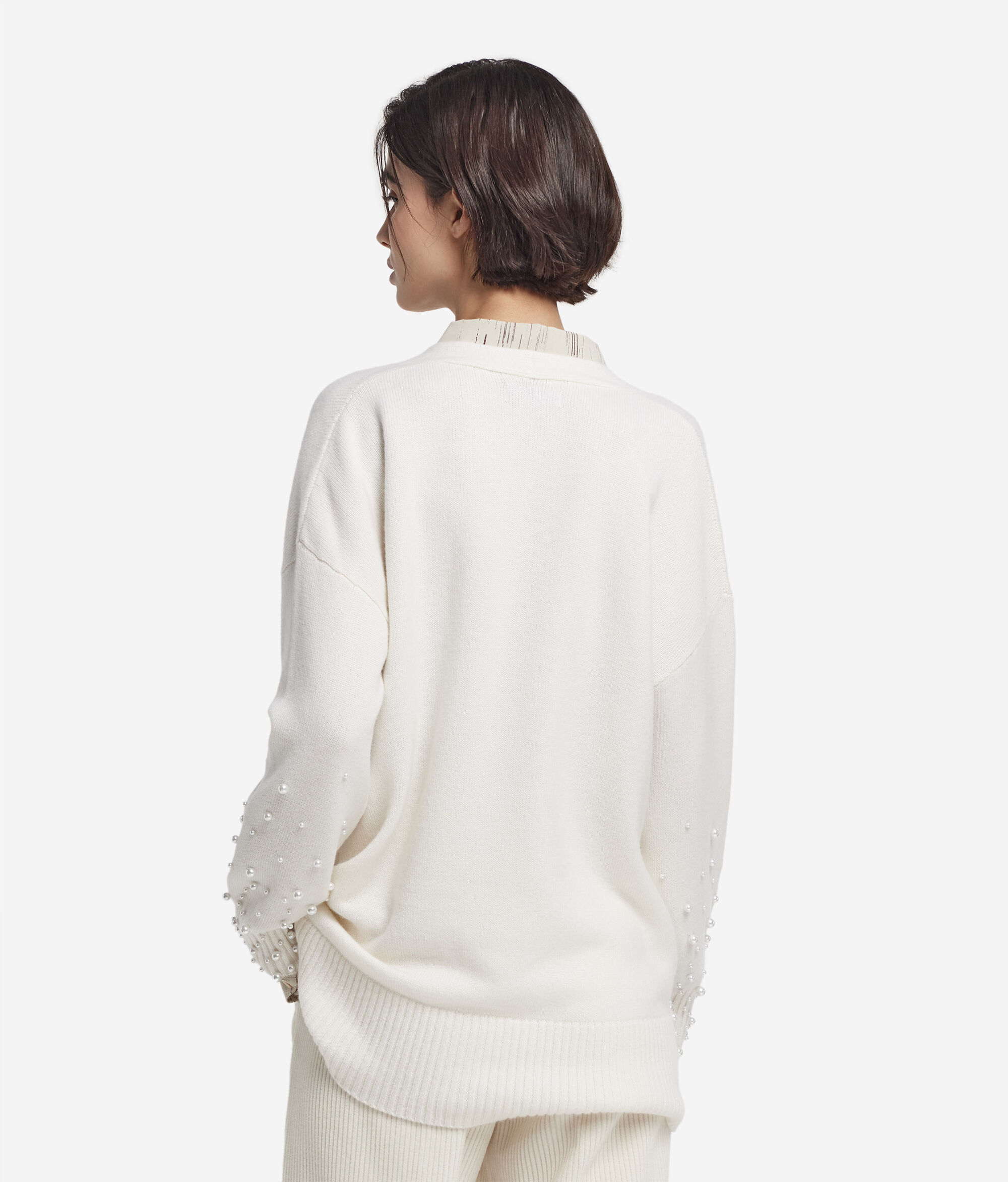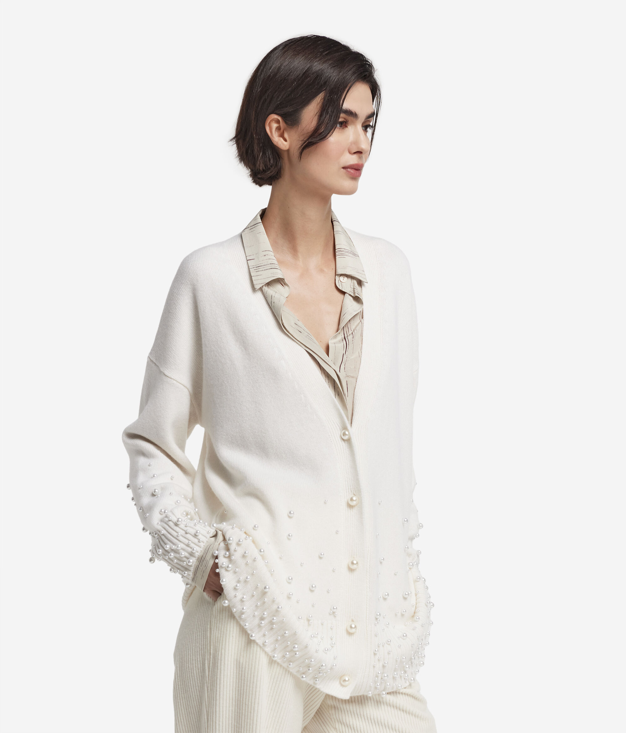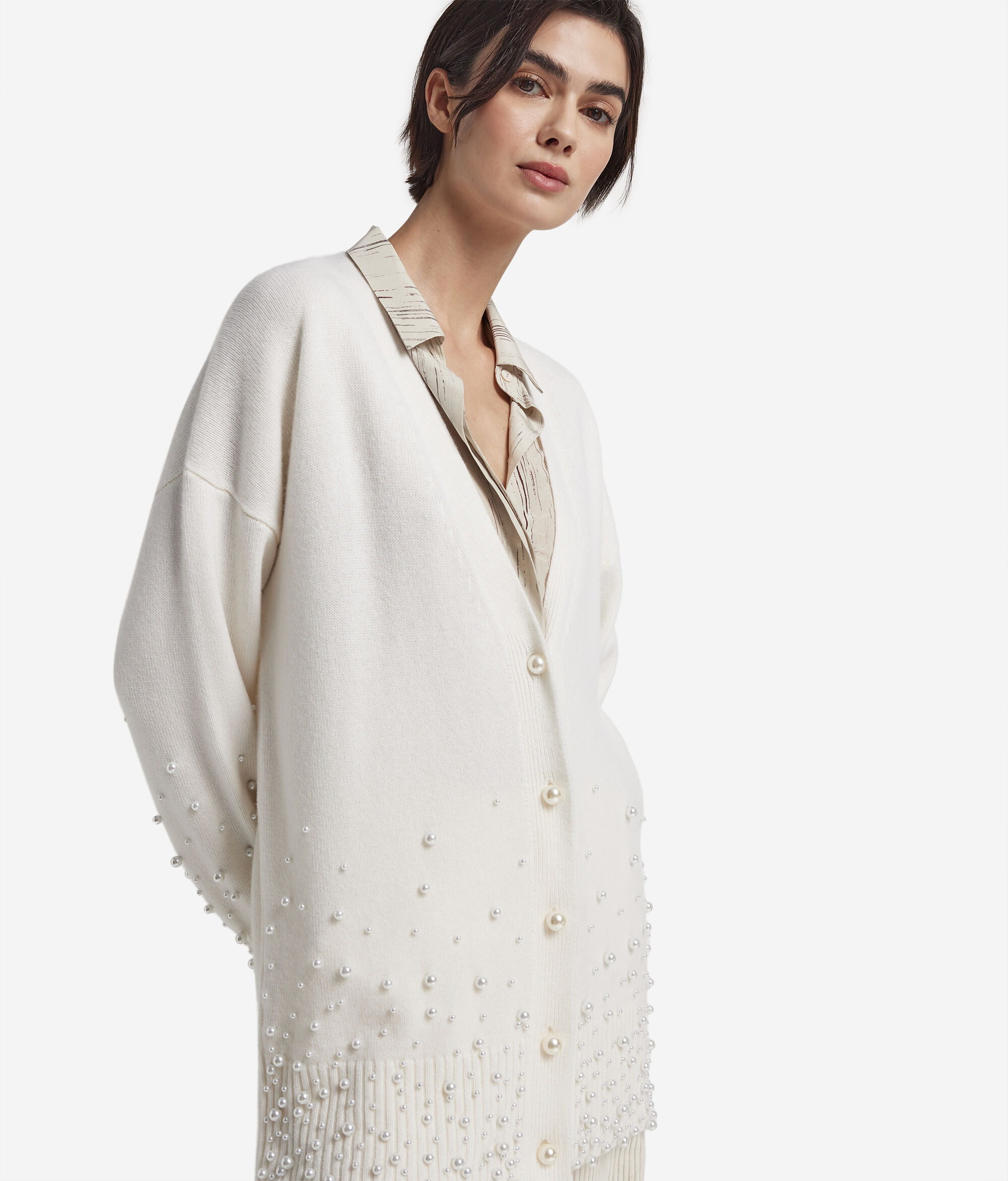 La calidad del cashmere ultrasoft realza la línea holgada y femenina de este cárdigan. Colocadas con gracia en el borde y en las mangas, las perlas embellecen la prenda transformando cada gesto en un detalle romántico. La prenda se completa con una apertura frontal con botones y con remates de canalé, que aportan un toque de carácter definiendo con naturalidad la silueta.