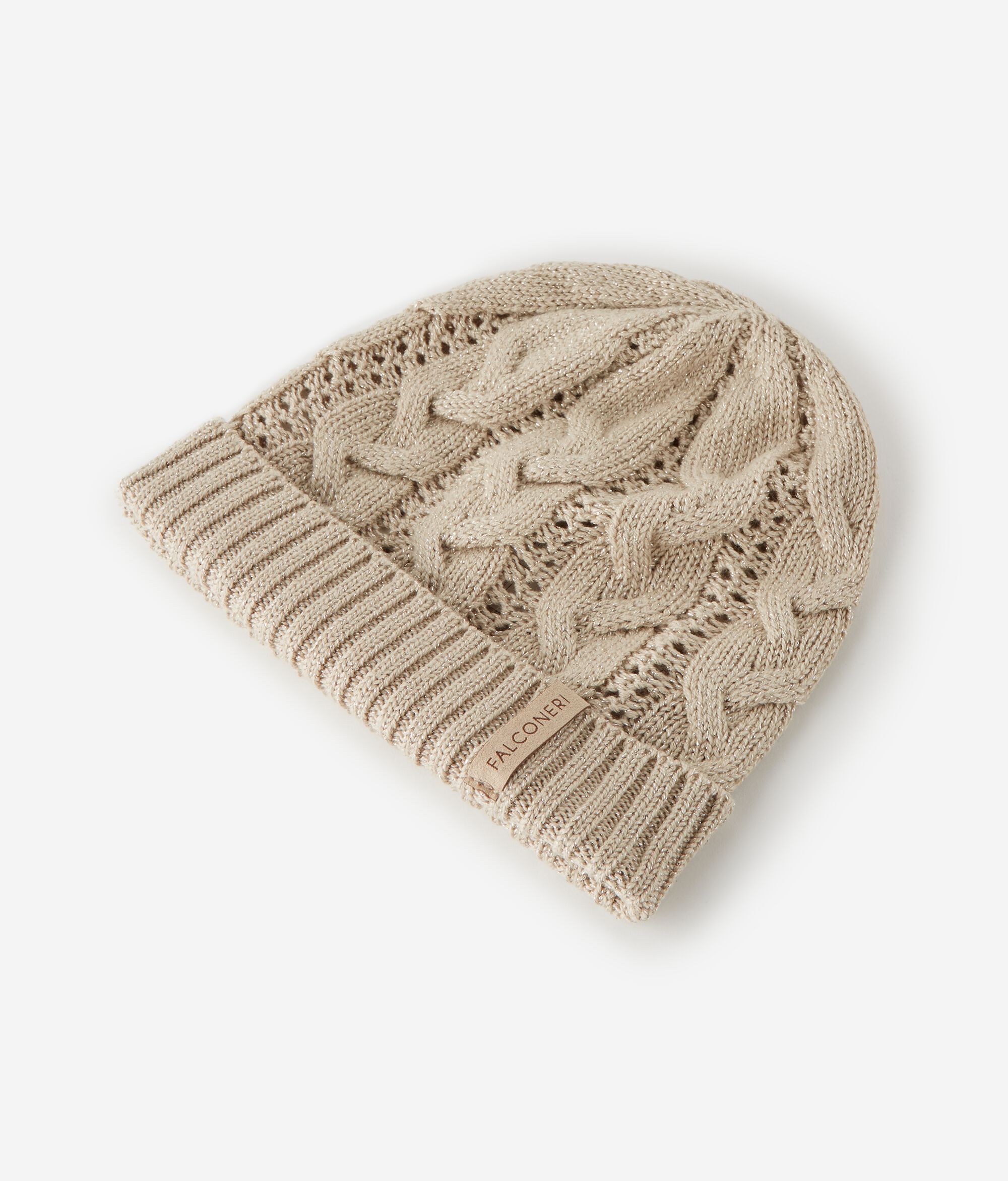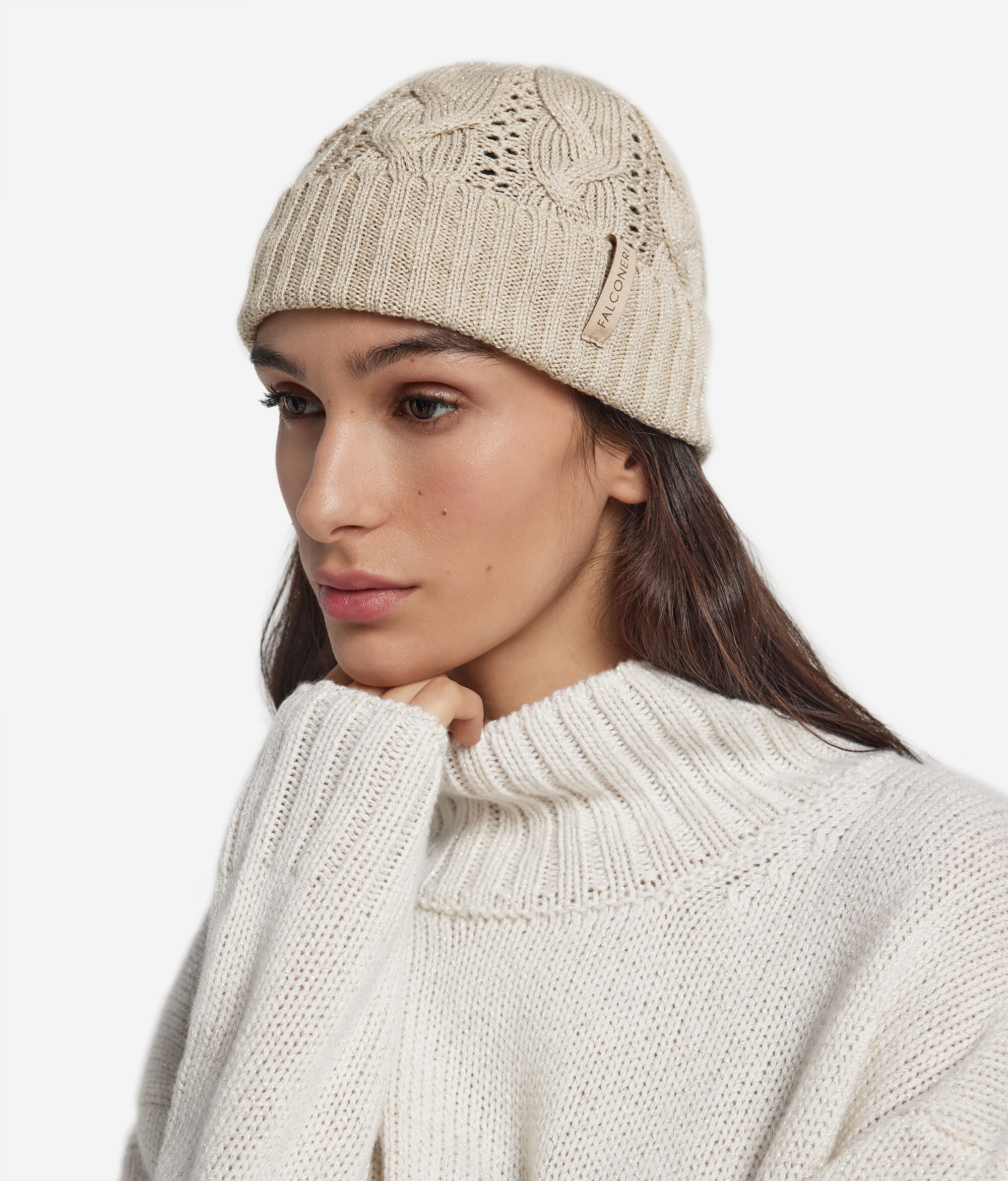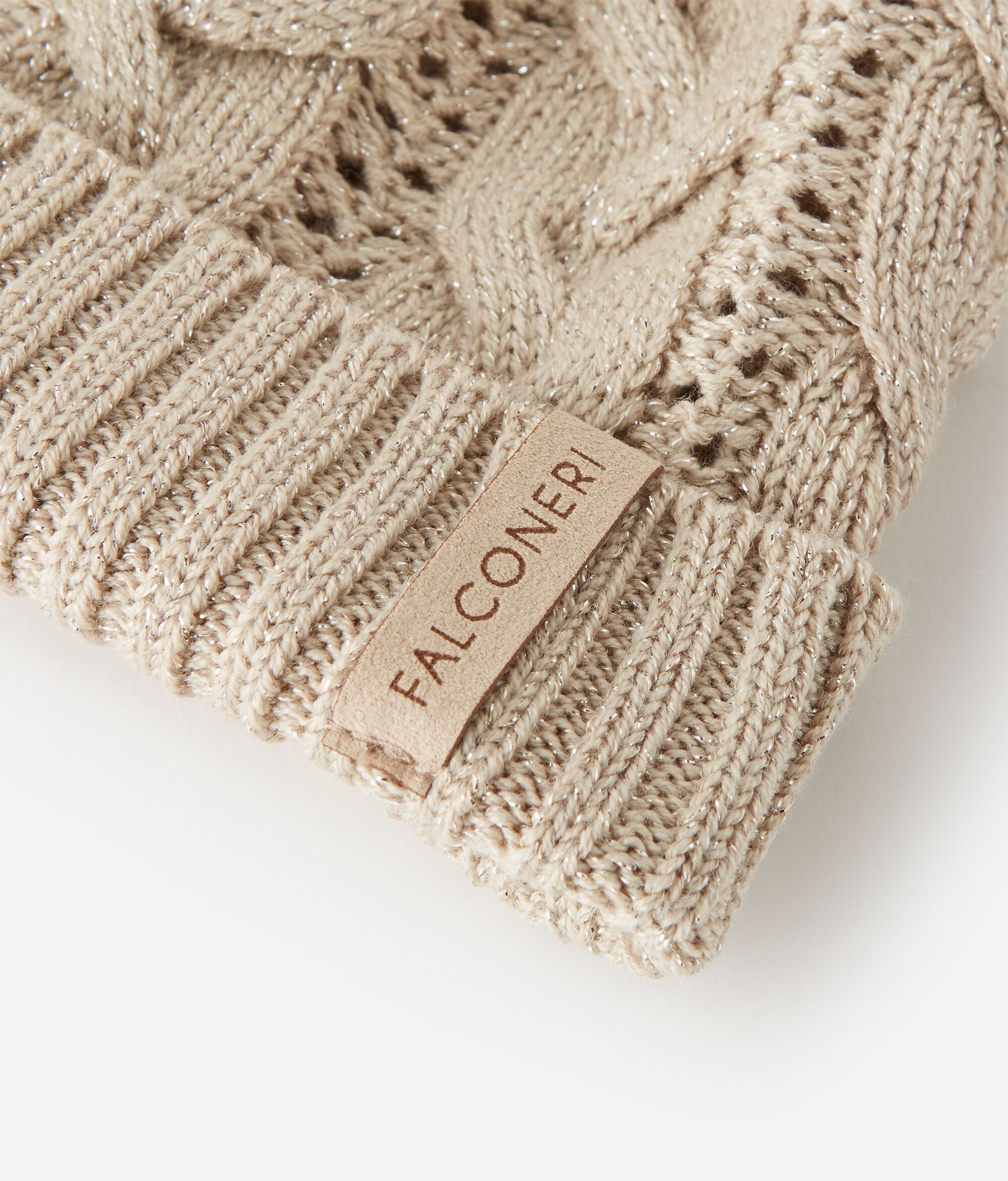 Este gorro, confeccionado en lana lamé, capta la luz con un delicado efecto brillante. La confección calada de punto y ochos en vertical crea un juego de volúmenes sofisticado y contemporáneo, mientras que el acabado acanalado define los detalles con elegancia.