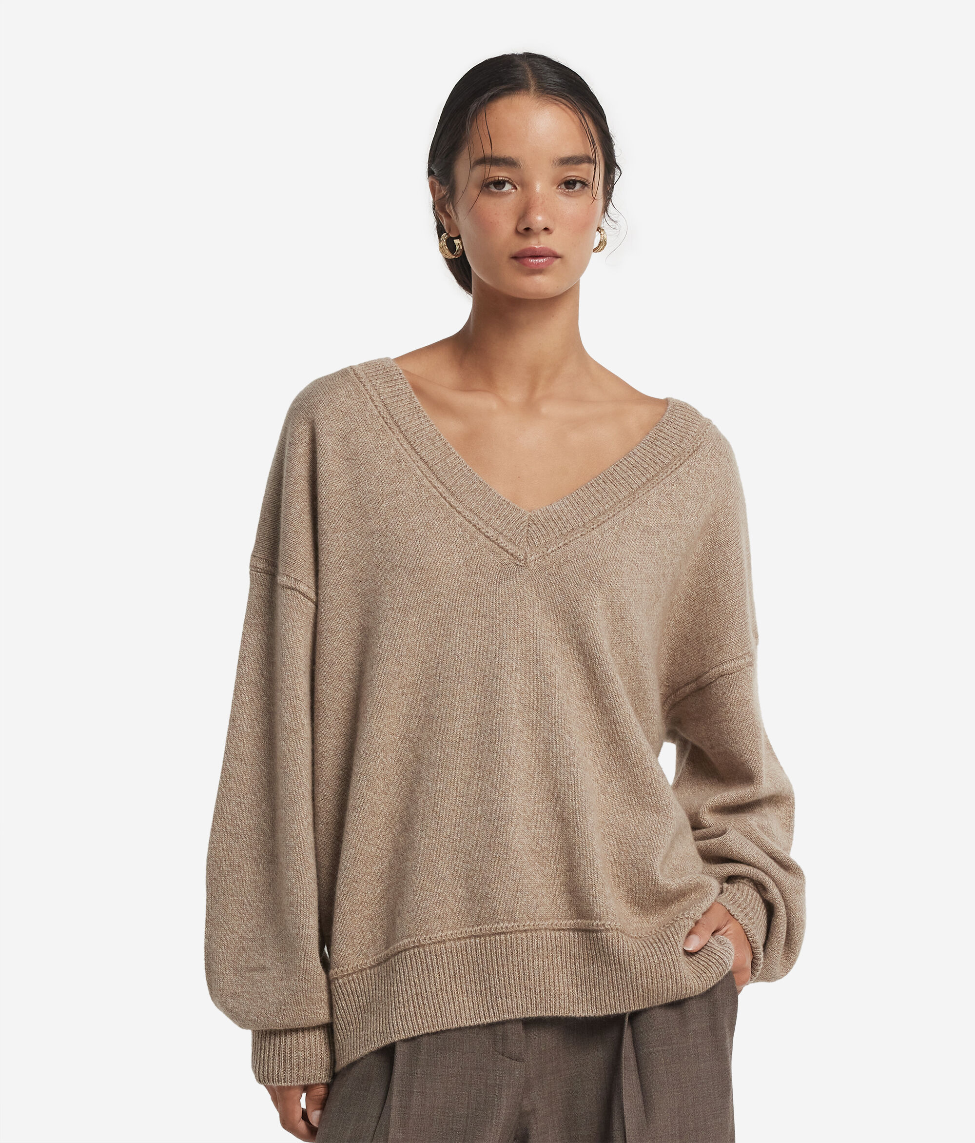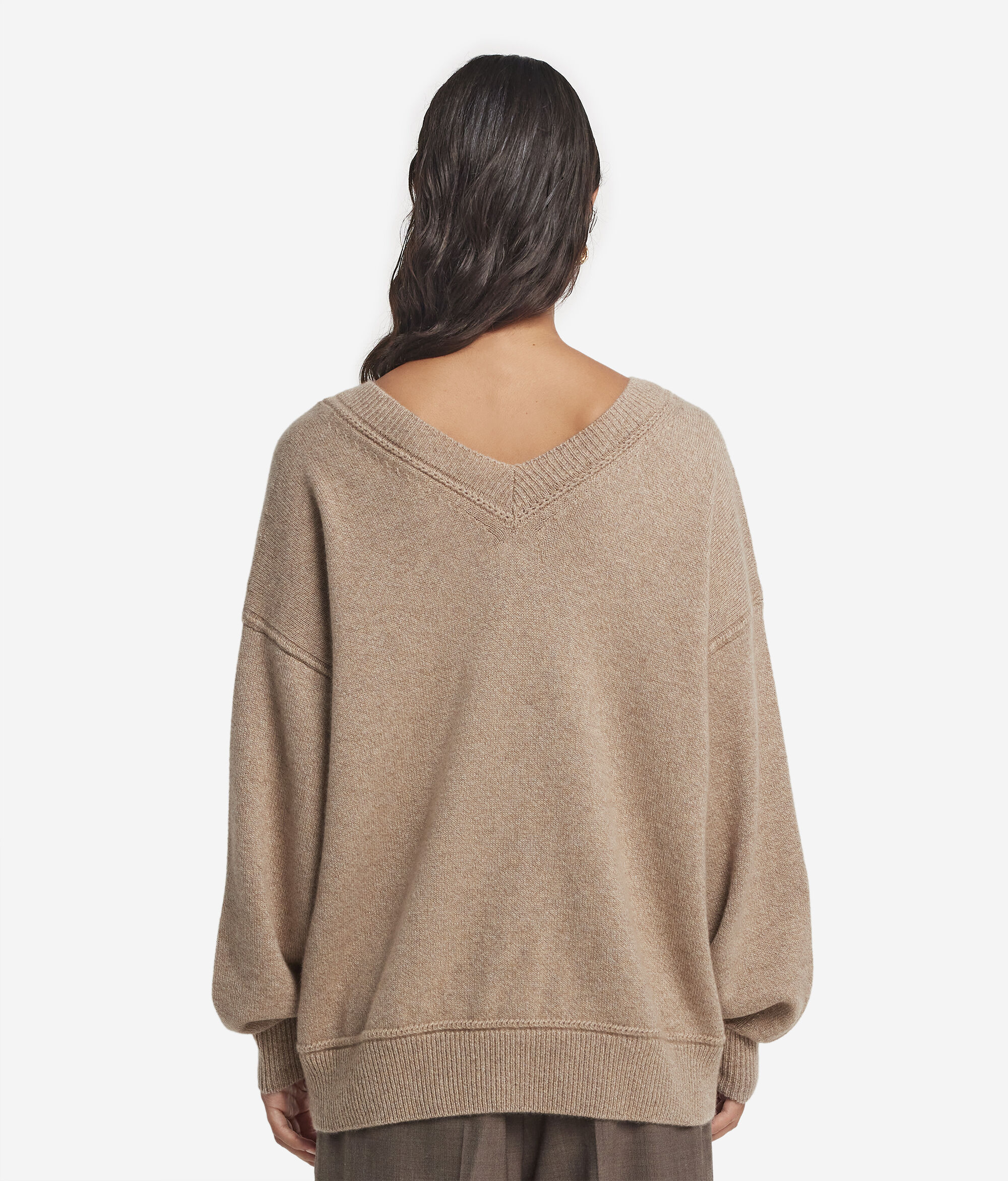 La fibra natural y una extrema suavidad caracterizan este jersey de cashmere ultrasoft que combina sencillez y carácter. El cuello de pico profundo en la parte delantera y trasera rompe los esquemas, volviéndolo femenino y versátil. Las mangas anchas y los hombros caídos le dan un aire relajado, mientras que los detalles de ochos y los bordes acanalados transmiten artesanía. Con su corte holgado y el largo hasta la cadera, es un auténtico comodín: sobre un vaquero holgado, una falda midi o de piel para un look minimalista e impactante.