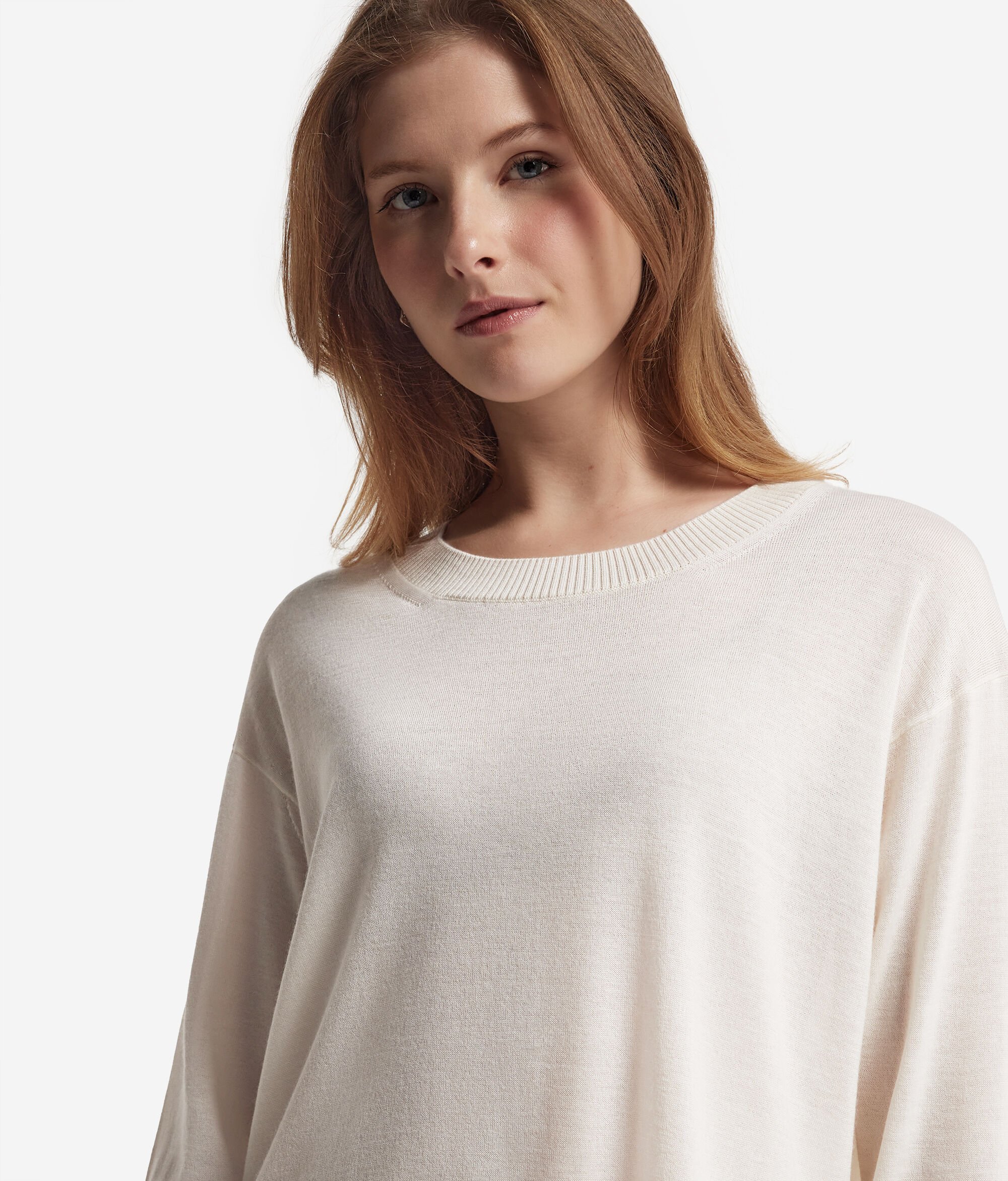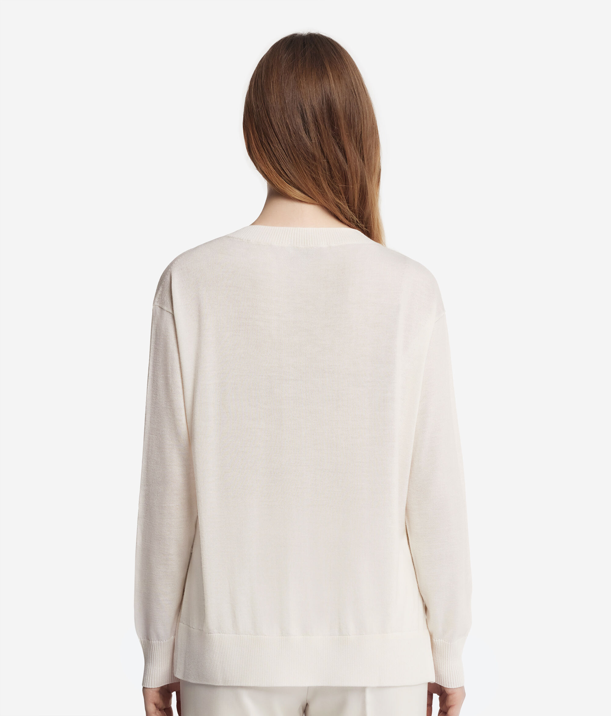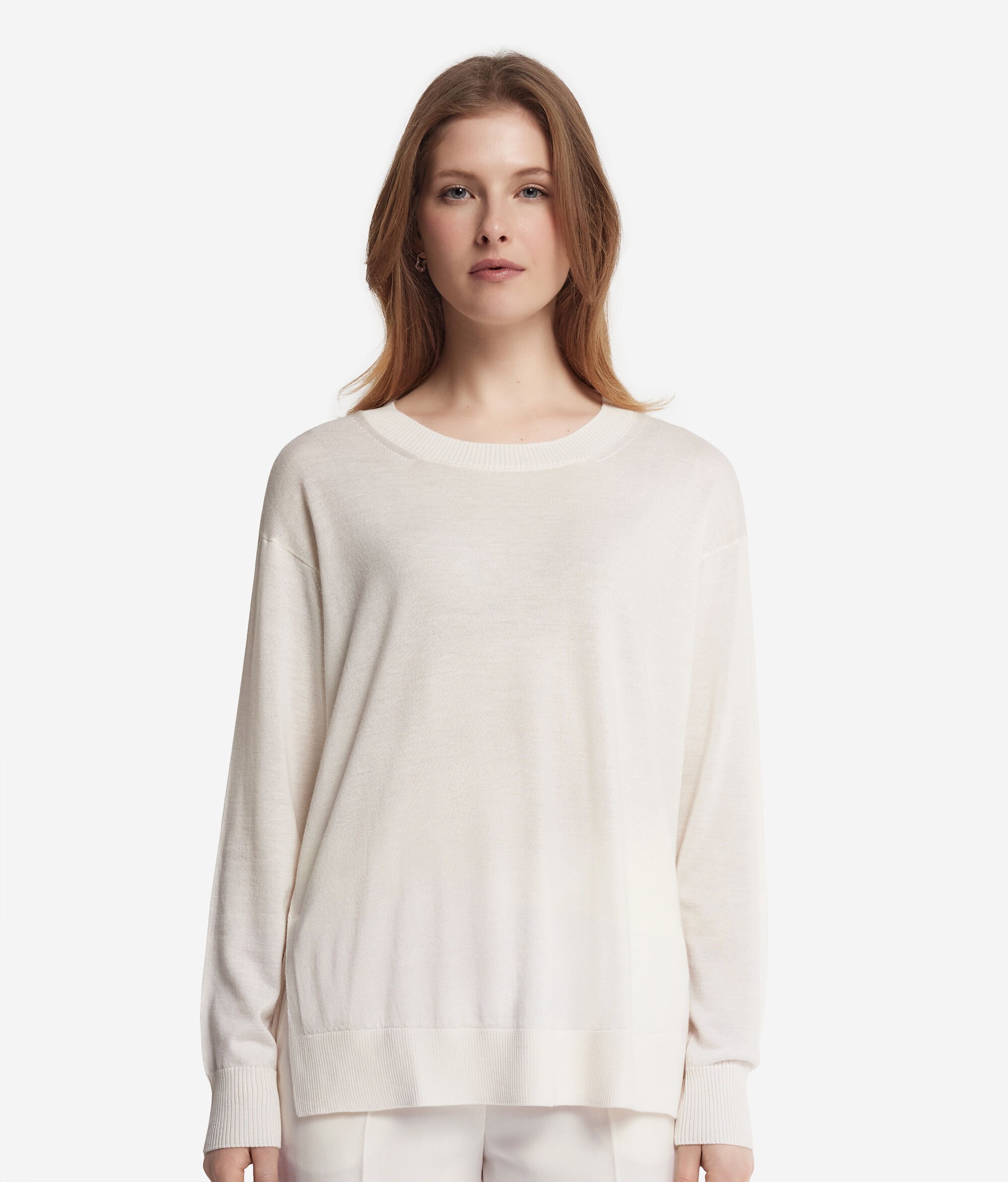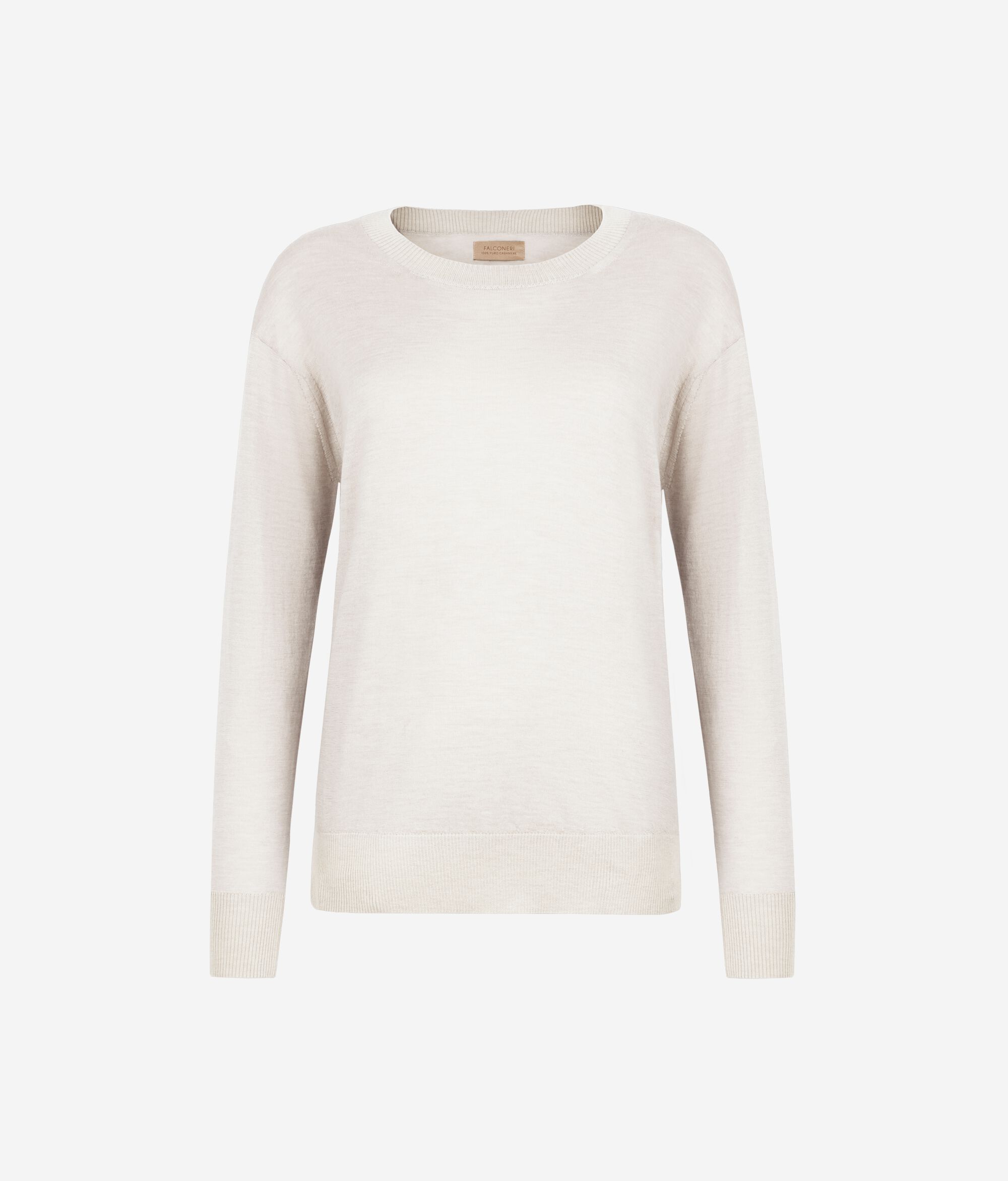 Este jersey con cuello redondo realizado en cashmere ultrafine es un modelo de manga larga con cuello, puños y bajo en punto canalé. Se distingue por sus aberturas laterales. Corte holgado, con hombro ligeramente caído.