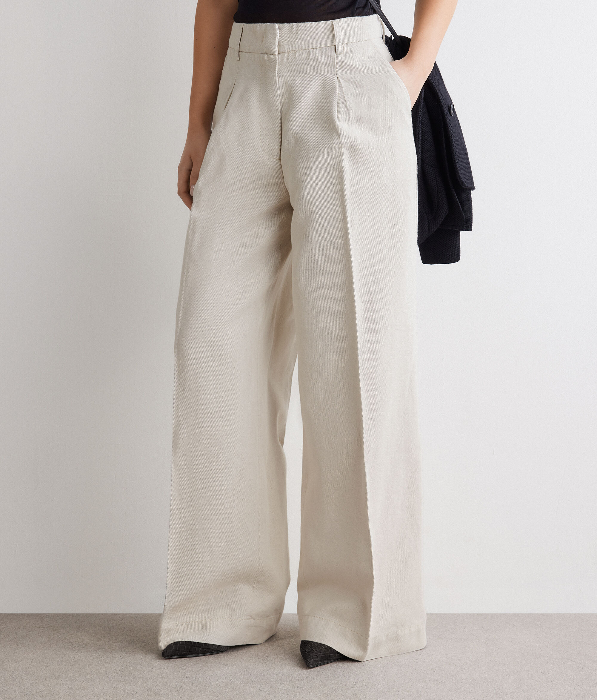 Confeccionado en algodón y lino, este pantalón palazzo con pinzas combina diseño y fluidez en una silueta sofisticada. La cinturilla con trabillas y el elástico de la espalda garantizan el máximo confort y un corte natural, mientras que el cierre con cremallera, tapeta, contrabotón y corchete asegura un ajuste impecable. Los bolsillos franceses del delantero y los bolsillos posteriores de ojal completan la prenda con elegantes detalles sartoriales.