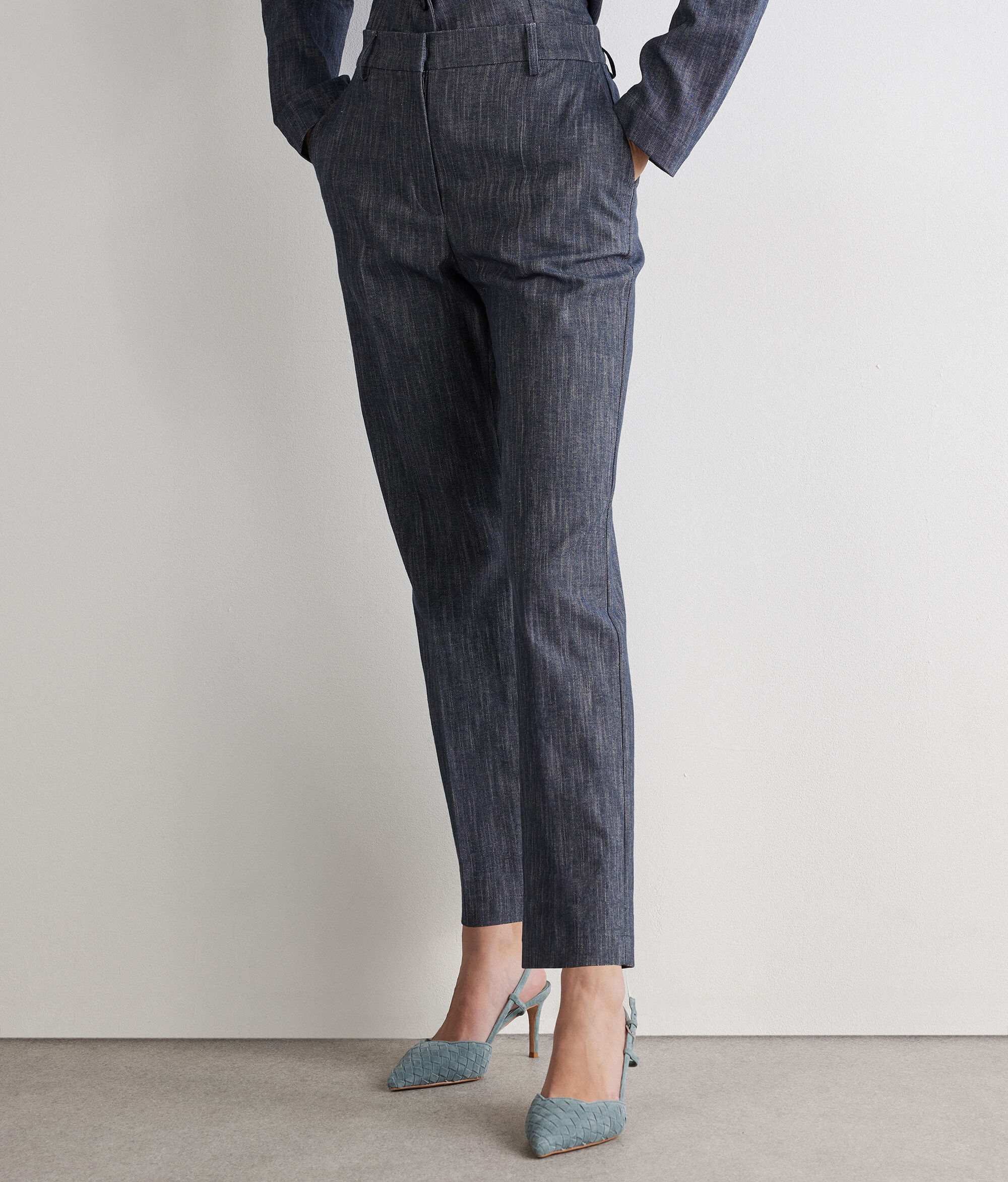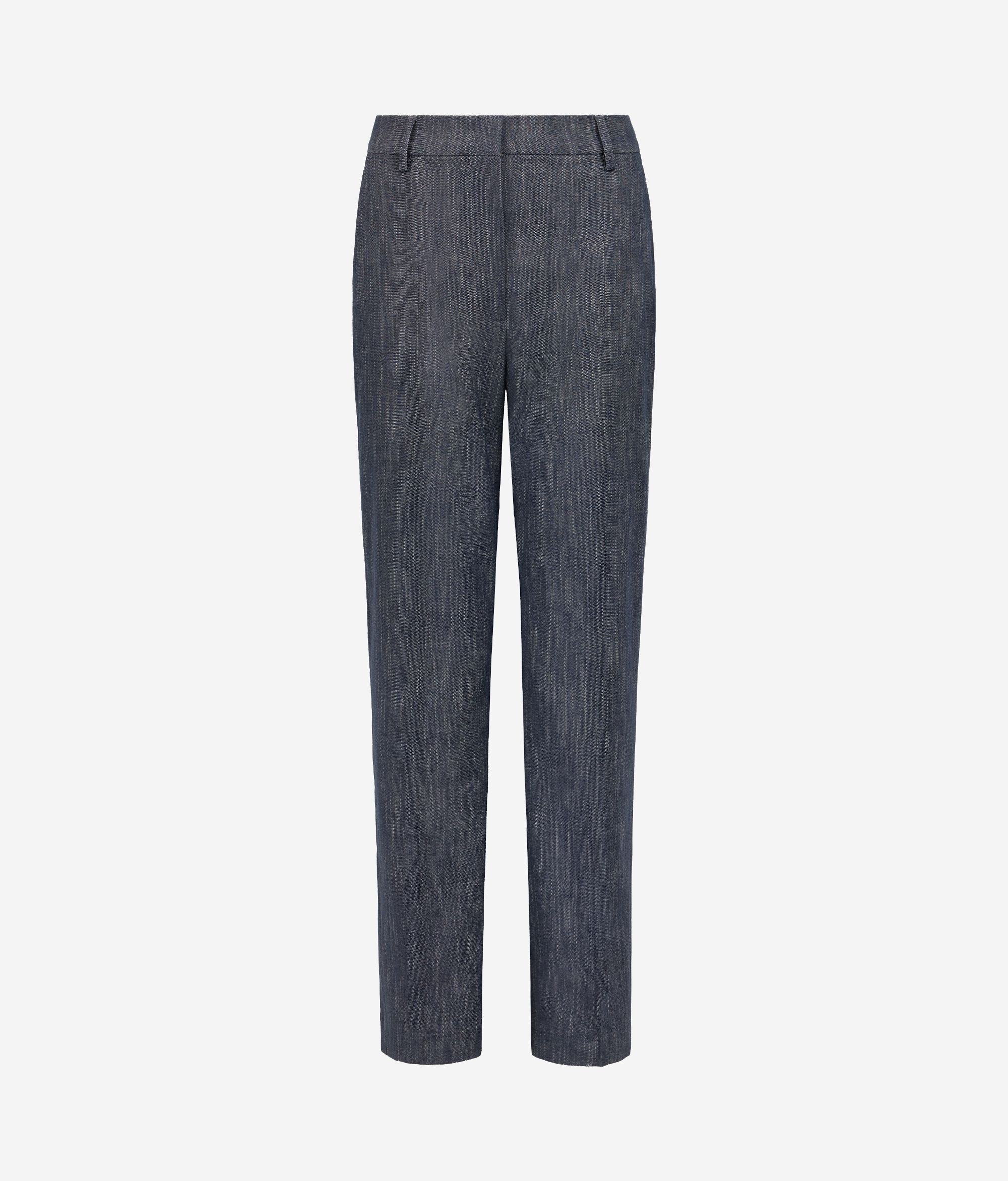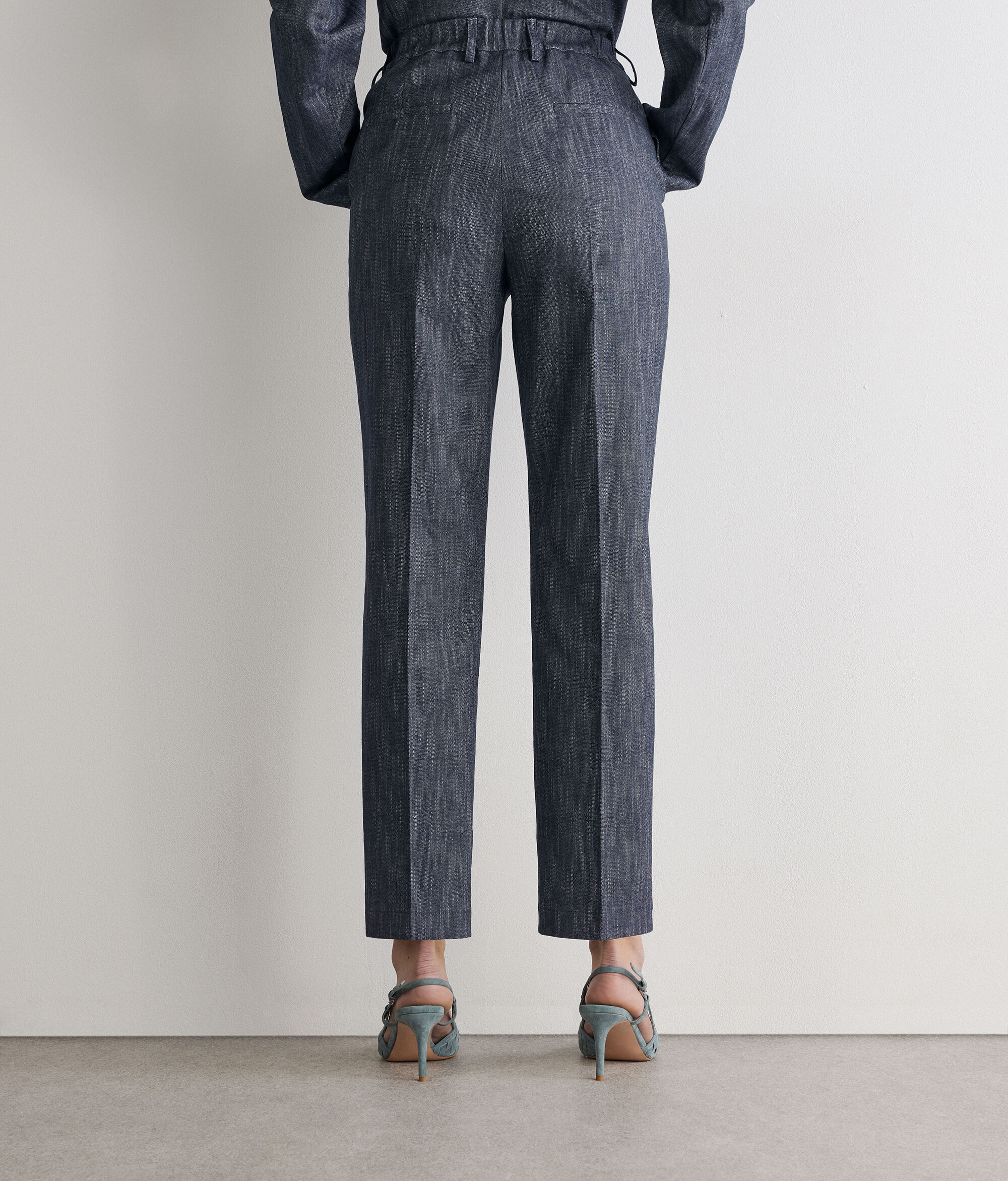 Este pantalón pitillo de algodón flameado efecto denim combina estructura y confort. El talle con cinturilla y elástico posterior se integra armoniosamente con los bolsillos franceses del delantero y los bolsillos de ojal de la espalda. La raya central y el cierre de cremallera y corchete completan esta prenda de corte estándar, ideal para lucir un estilo contemporáneo y sofisticado.