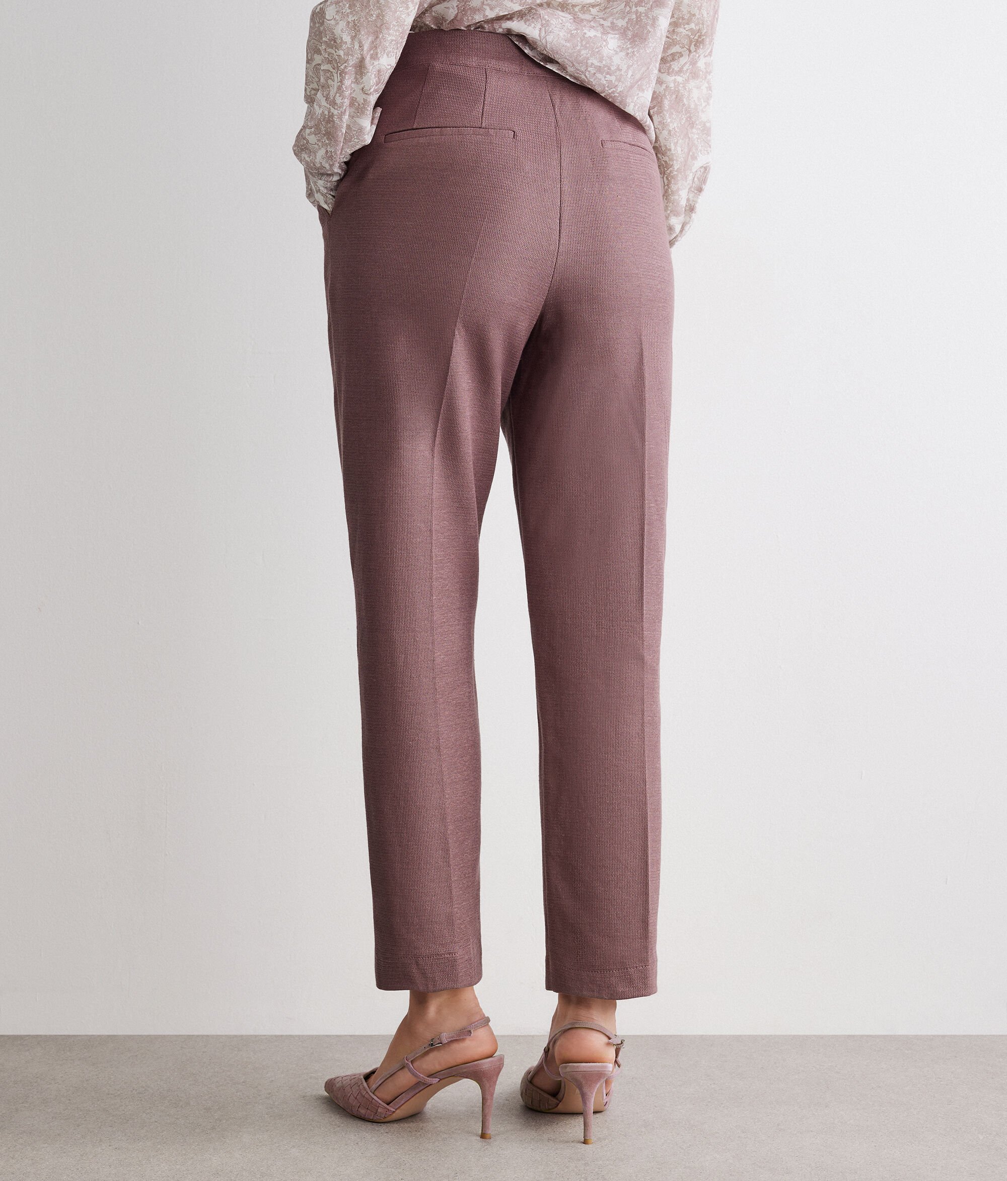 Confeccionado en un exclusivo tejido waffle de lino y algodón, este pantalón pitillo mantiene un perfecto equilibrio entre ligereza y textura. La cinturilla elástica de la espalda asegura un ajuste perfecto, mientras que los bolsillos franceses del delantero y los falsos bolsillos de la espalda añaden detalles distintivos. La cremallera, el botón y la raya del delantero y la espalda definen una silueta moderna, ideal para lucir looks elegantes y sofisticados.