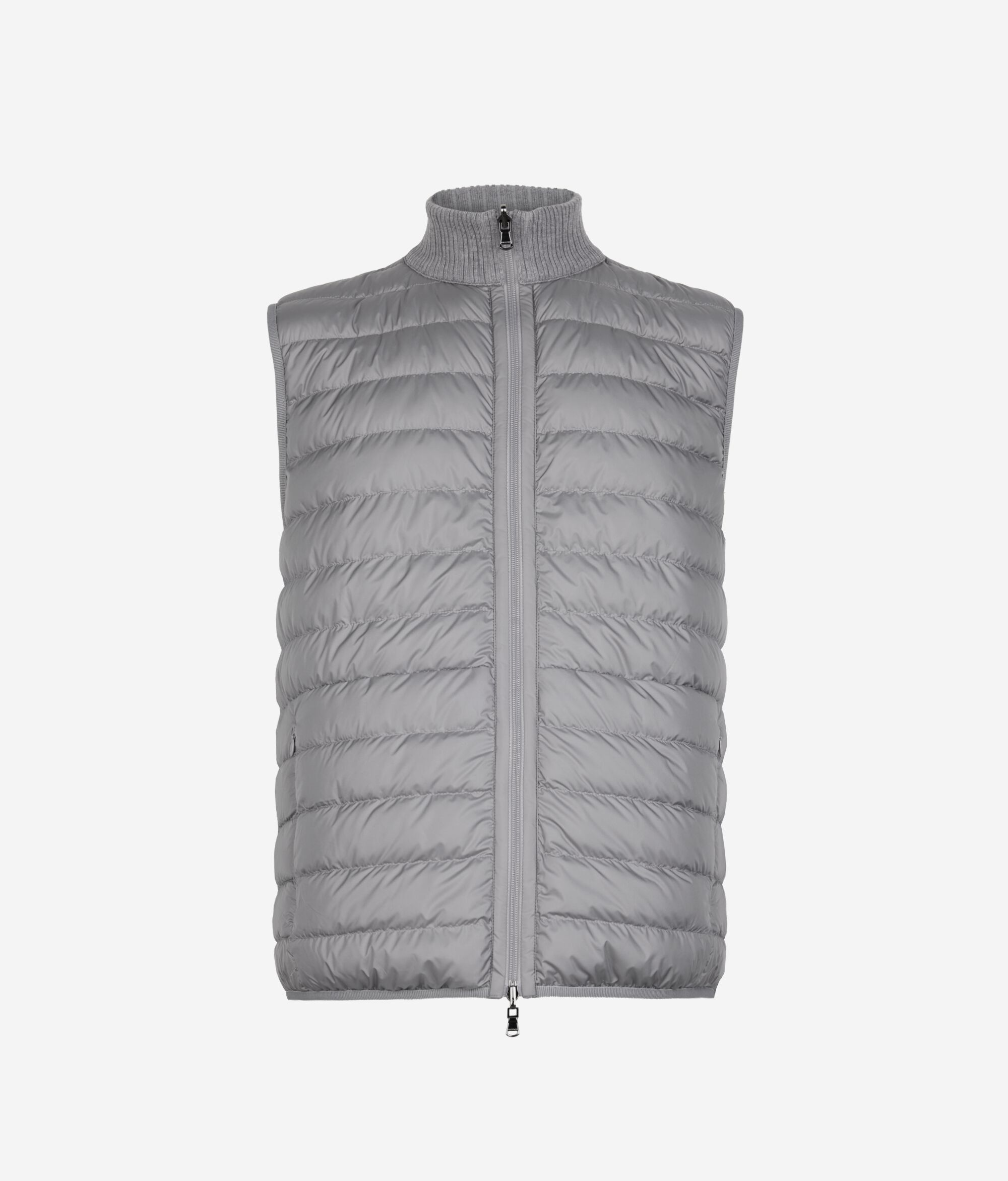 Este plumífero sin mangas reversible ofrece una mezcla perfecta de elegancia y funcionalidad. Confeccionado en tejido técnico mate por un lado y en cashmere ultrafine con punto en relieve por el otro, presenta un contraste de materiales sofisticado y contemporáneo. El cuello alto de punto de cashmere, la cremallera de doble carro y los bolsillos invisibles aportan detalles prácticos y elegantes, mientras que su corte entallado con remates de tira elástica completan su diseño elegante y versátil.