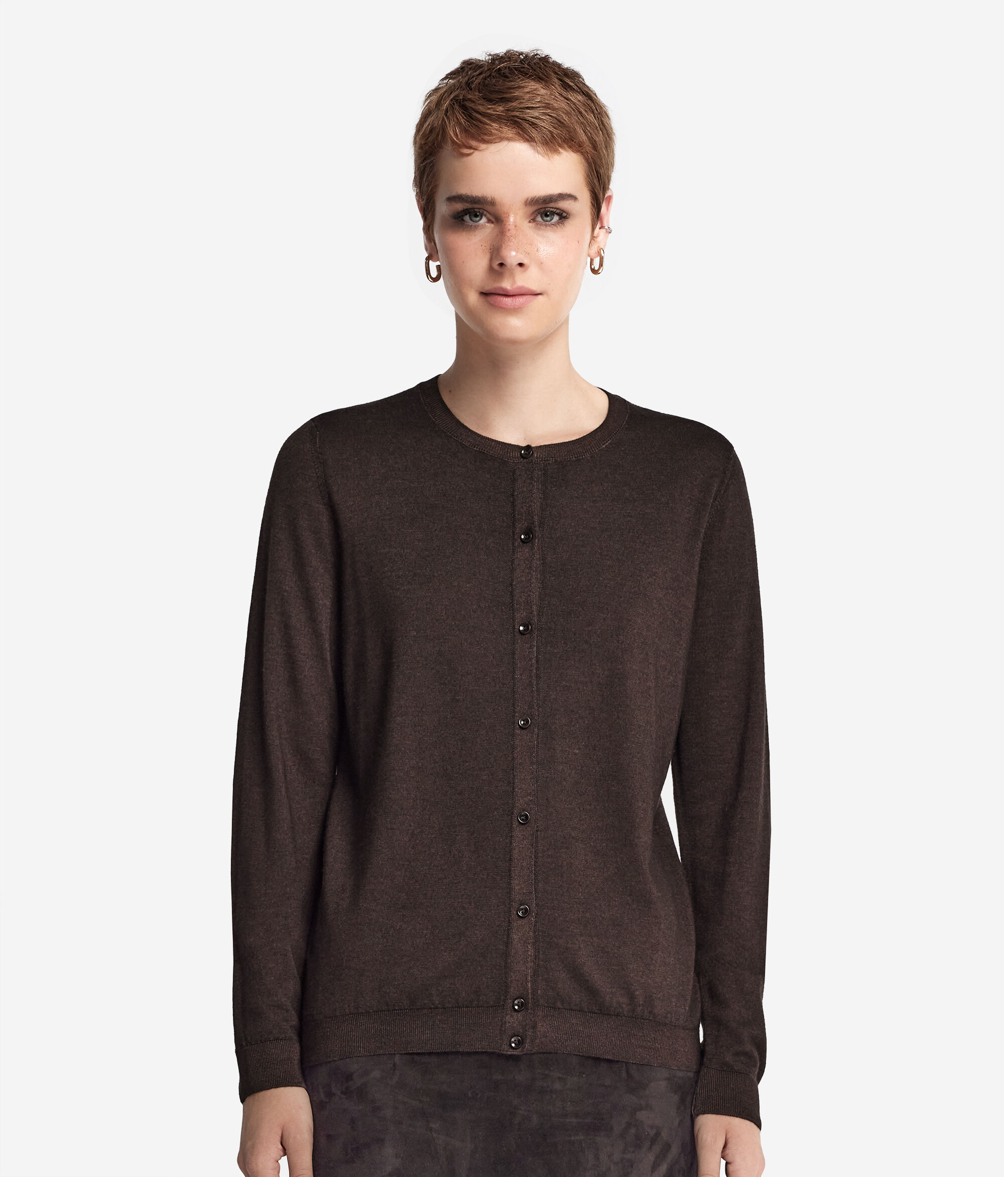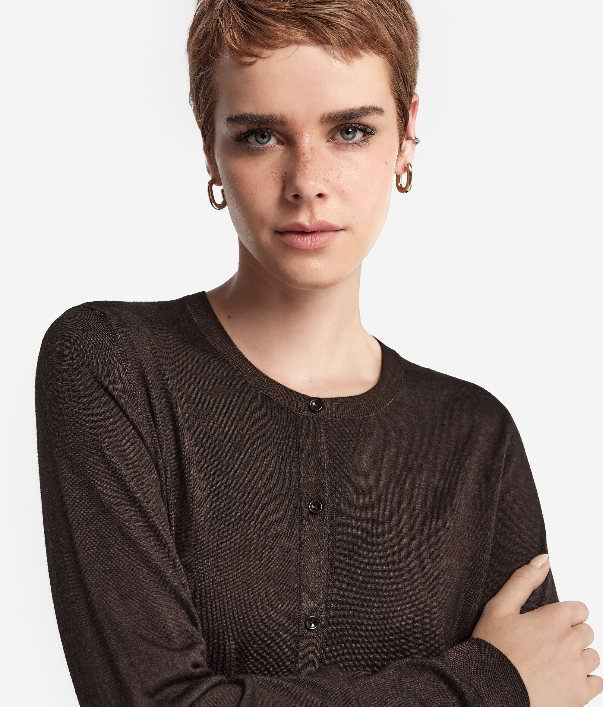 Ce gilet pour femme est confectionné en cachemire ultra-fin, une matière prestigieuse qui garantit une douceur incomparable et une légèreté exceptionnelle. Son col rond classique lui confère une élégance intemporelle et un tombé harmonieux. Sa fermeture à boutons assortis, discrets et raffinés, lui assure un fini soigné et s'intègre parfaitement à la silhouette. Les fines côtes présentes sur l’encolure, les poignets et le bas de ce cardigan en cachemire pour femme lui apportent une touche structurée et raffinée. Sa coupe ajustée met en valeur la silhouette tout en restant confortable et fluide, à la fois idéale pour un porté quotidien ou des occasions plus habillées. Disponible dans une palette de couleurs sobres et intemporelles, ce gilet à col rond pour femme Falconeri est un incontournable du vestiaire féminin. Il se porte seul, boutonné pour un look chic et épuré, ou ouvert sur un top en soie pour une allure plus décontractée. Polyvalent, il s’associe aussi bien à un jean qu’à un pantalon tailleur.