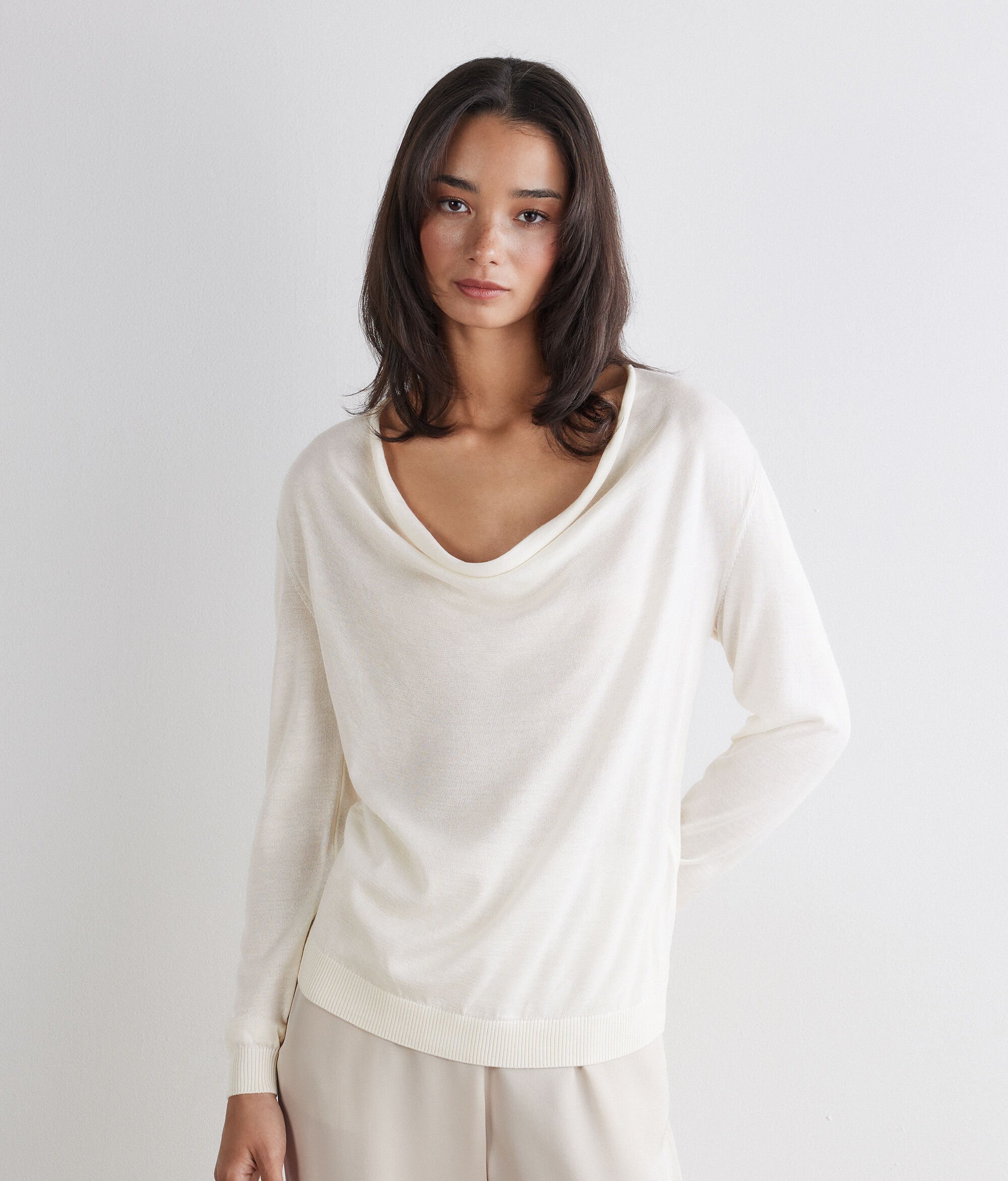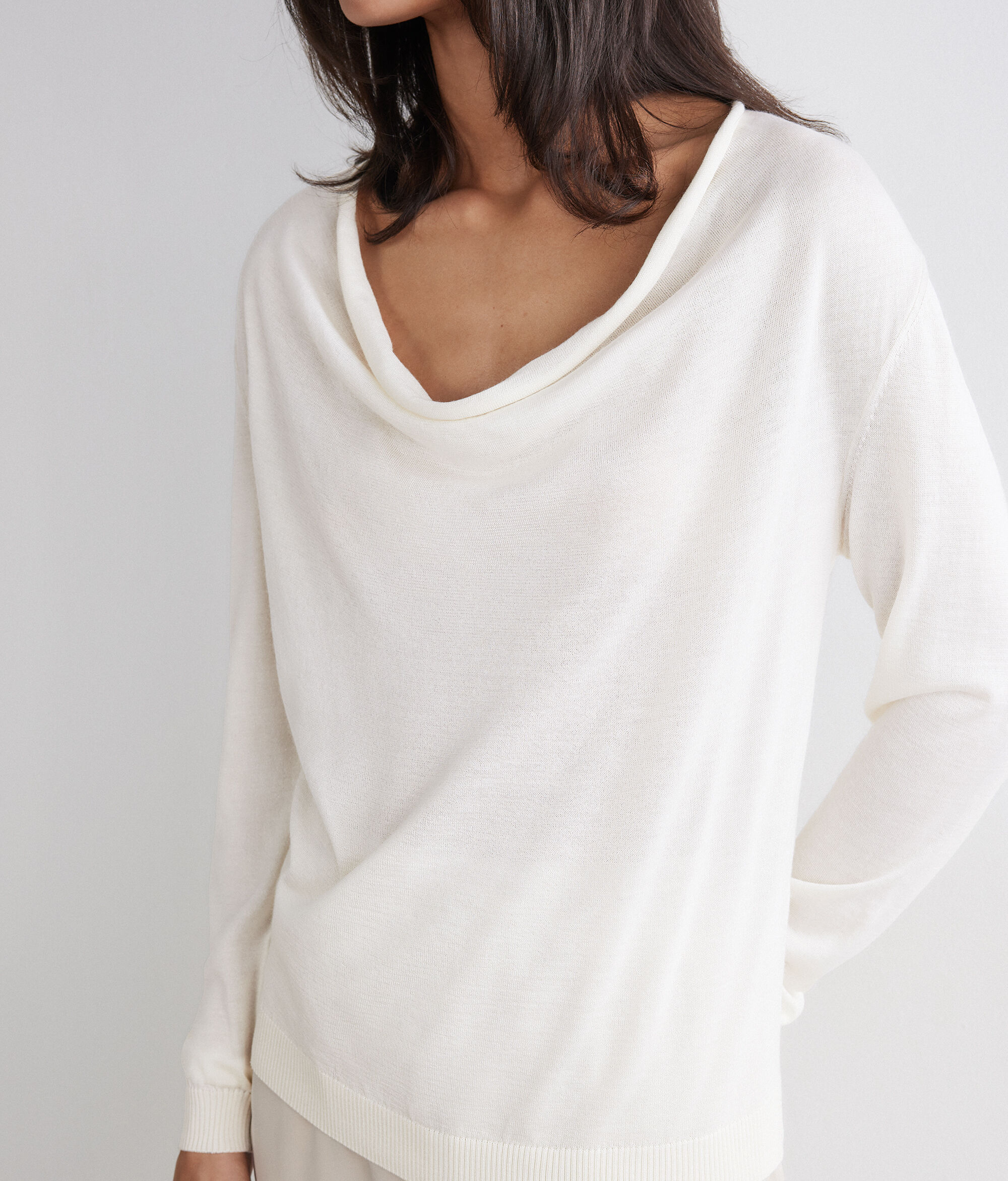 Pull en luxueux mélange de cachemire et de soie doux sur la peau au charme sophistiqué. L'encolure drapée crée un élégant jeu de volumes, tandis que les finitions côtelées sur le bas et les poignets apposent une touche finale soignée au vêtement. La texture ultra-légère de la matière, associée à la coupe standard, garantit un résultat confortable et agréable à porter.