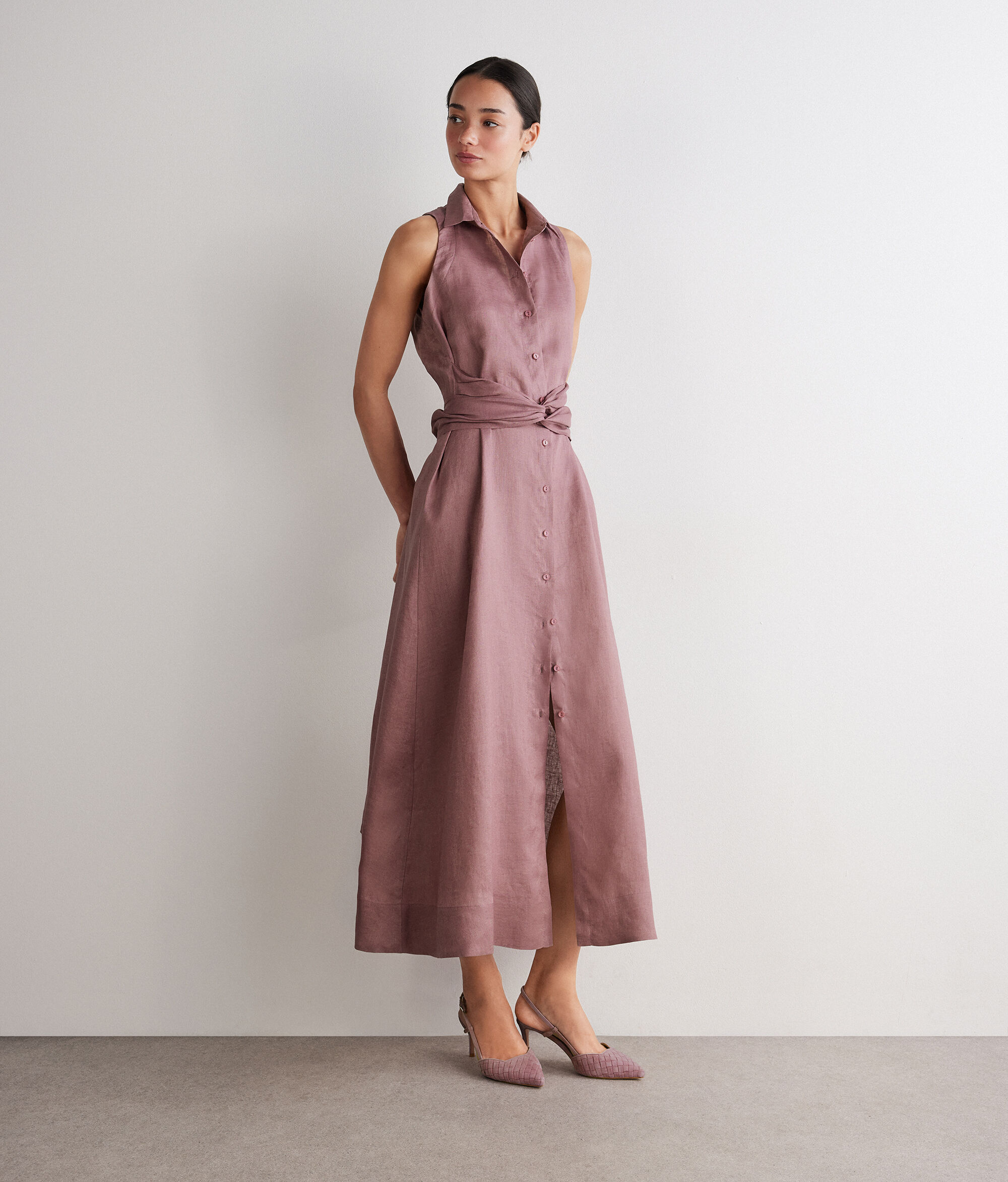 Légère et raffinée, cette robe en lin naturellement respirant est une pièce délicate idéale pour les journées chaudes. Un col classique et une fermeture avant à boutons lui confèrent une élégance intemporelle. Sa ceinture souligne gracieusement le tour de taille, tandis que sa jupe ample crée un effet de mouvement fluide.
