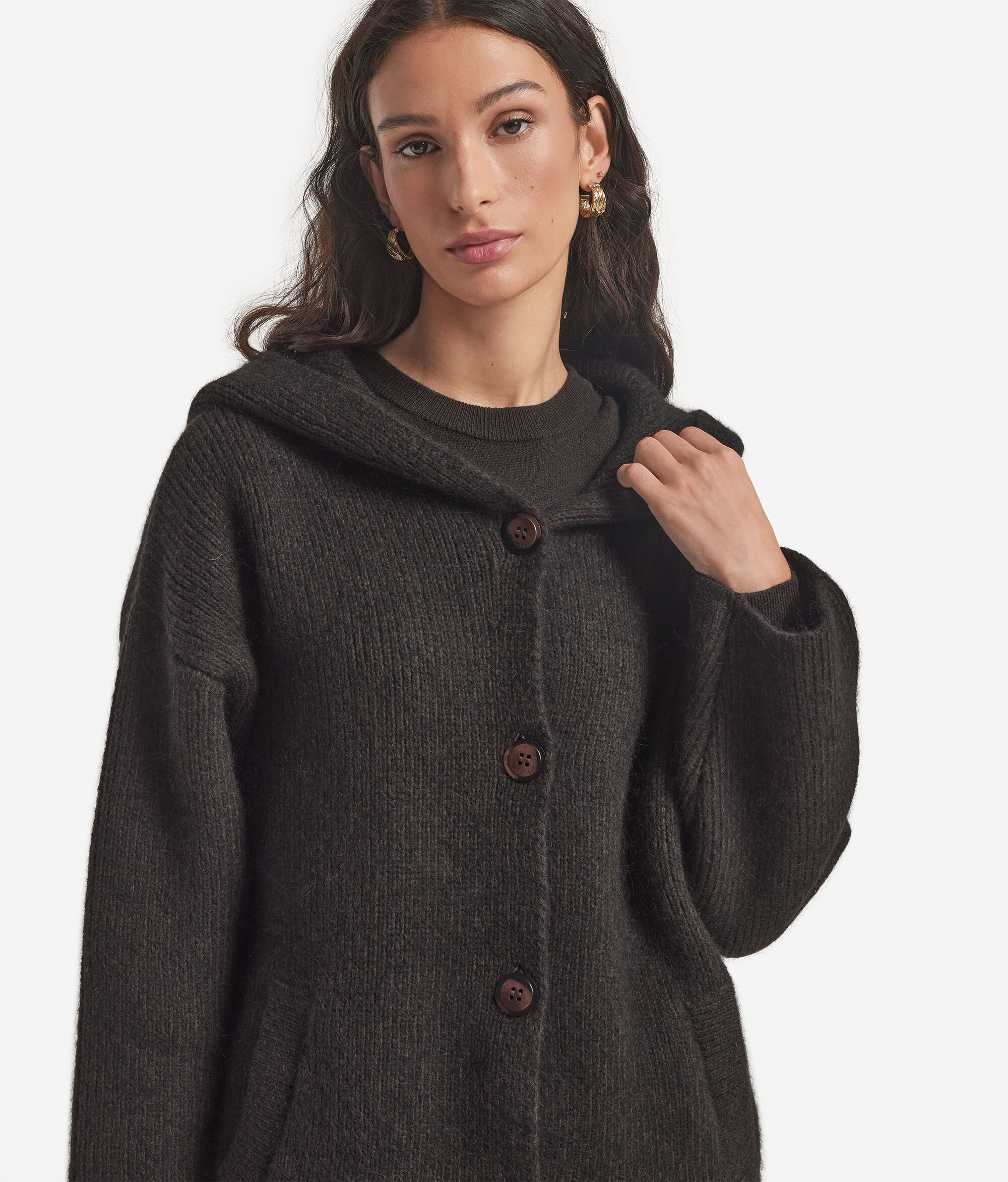 A style inspired by a timeless feel defines the design of this alpaca wool hooded coat. The shawl collar, dropped shoulders and loose fit create a fluid and cosy silhouette. A single-breasted button fastening, front welt pockets and hip length complete a relaxed yet elegantly feminine design.