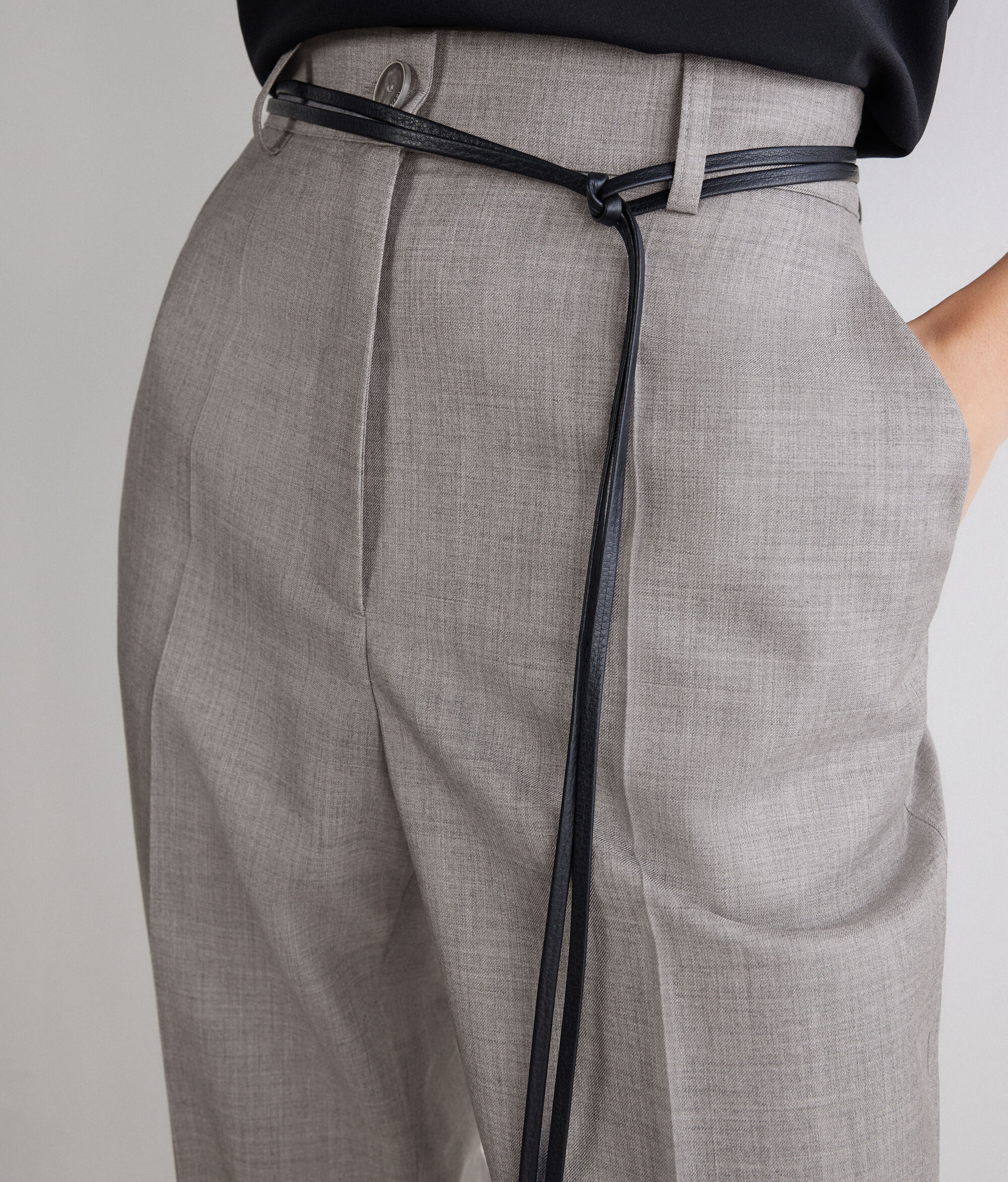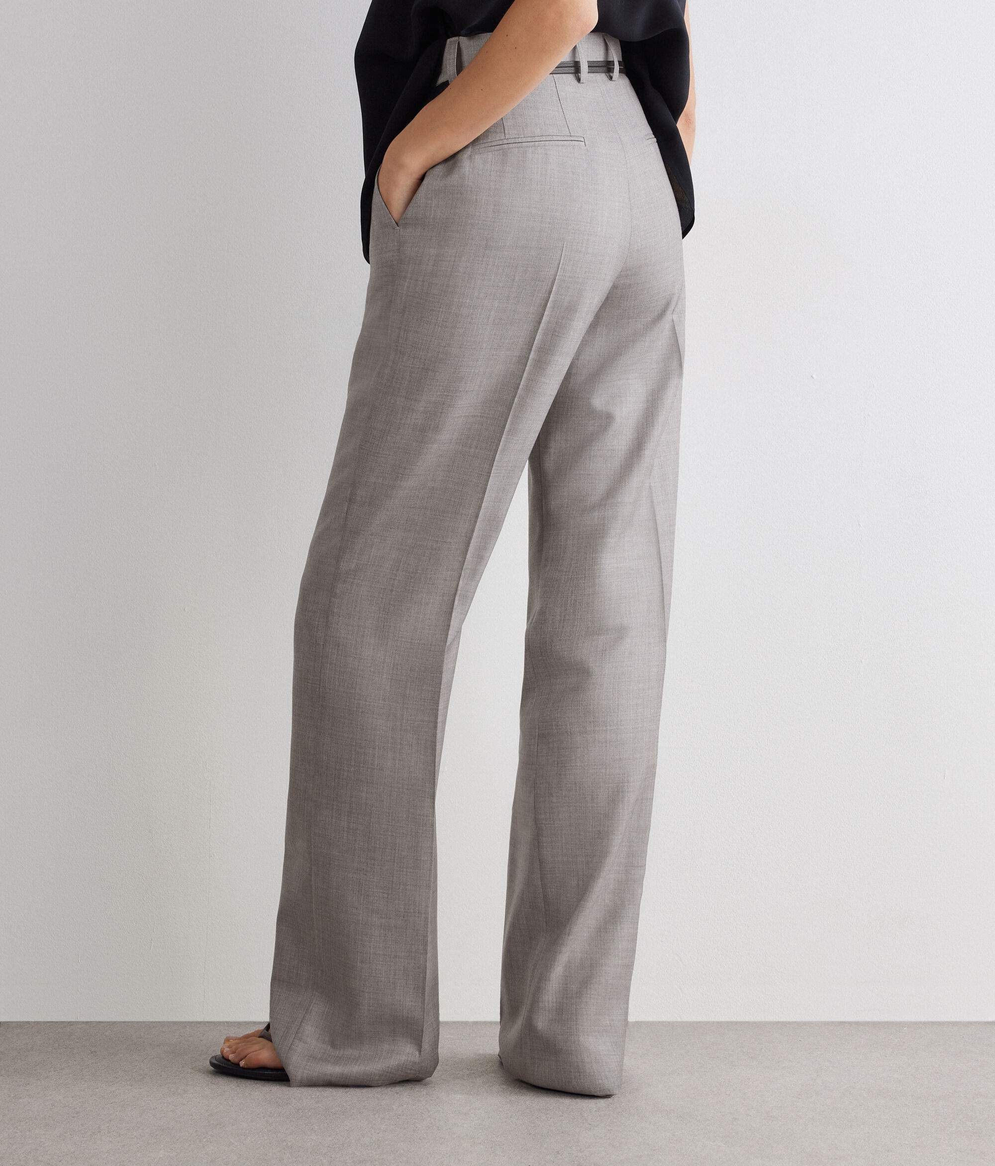 Tailored straight-cut trousers in cashmere silk, enhanced by the pleat at the front and back. The zip, flap and button fastening, together with the waistband with belt loops, defines the design, completed by slant pockets at the front and mock double welt pockets at the back.