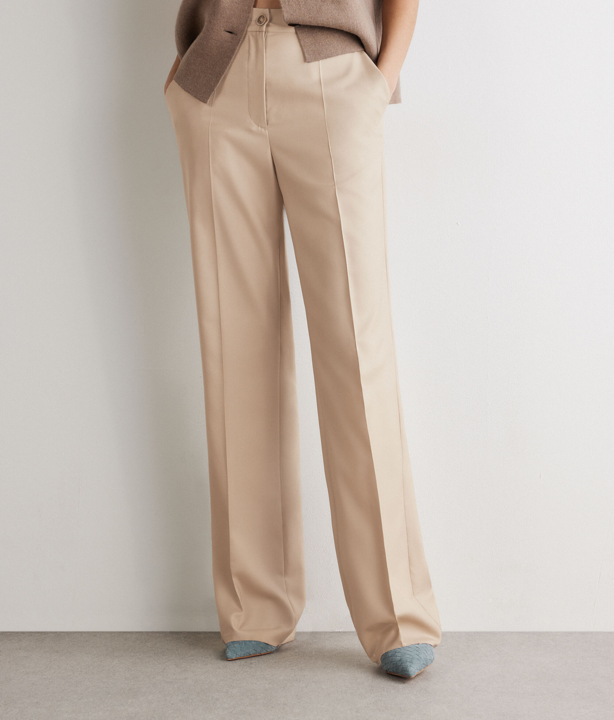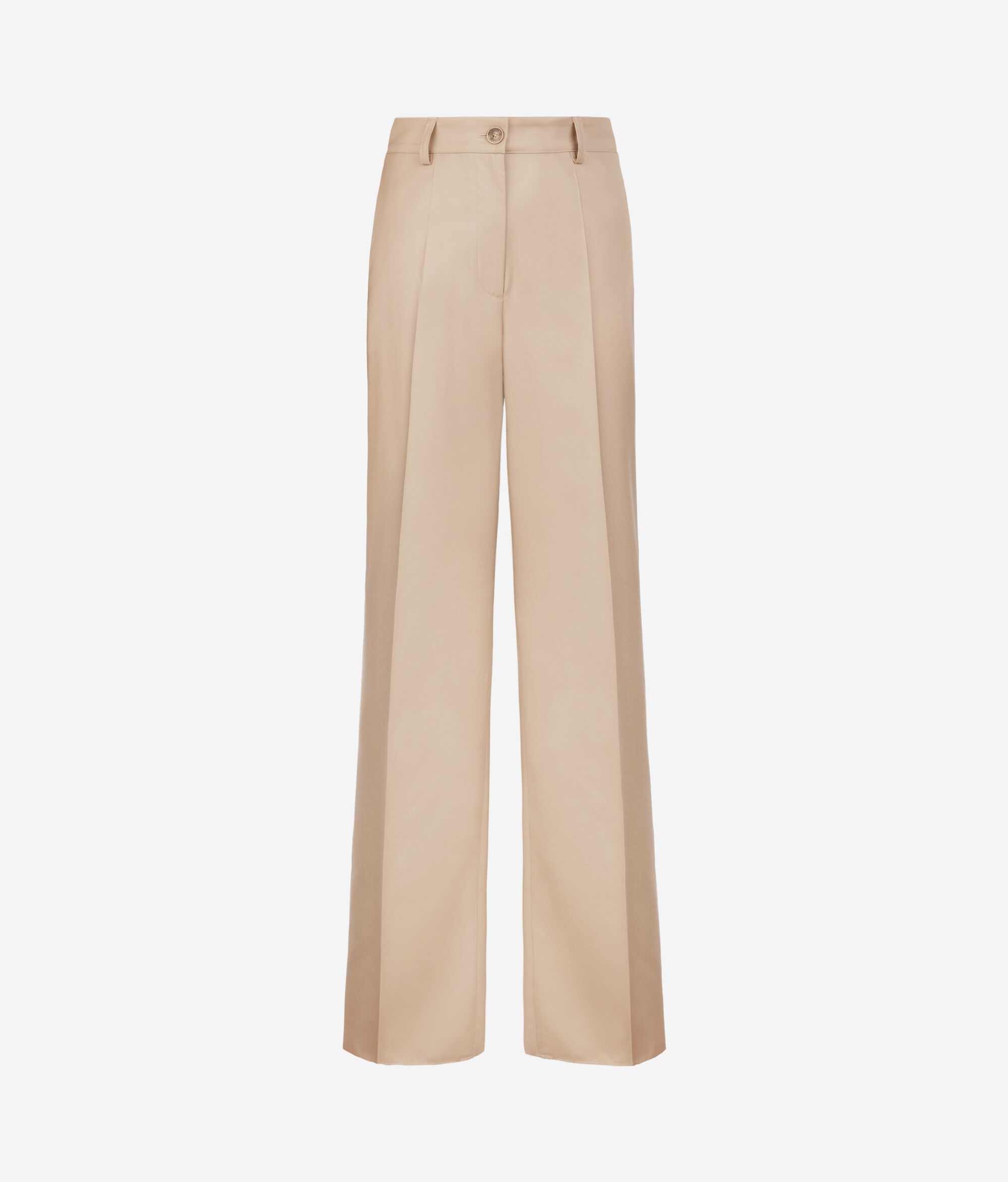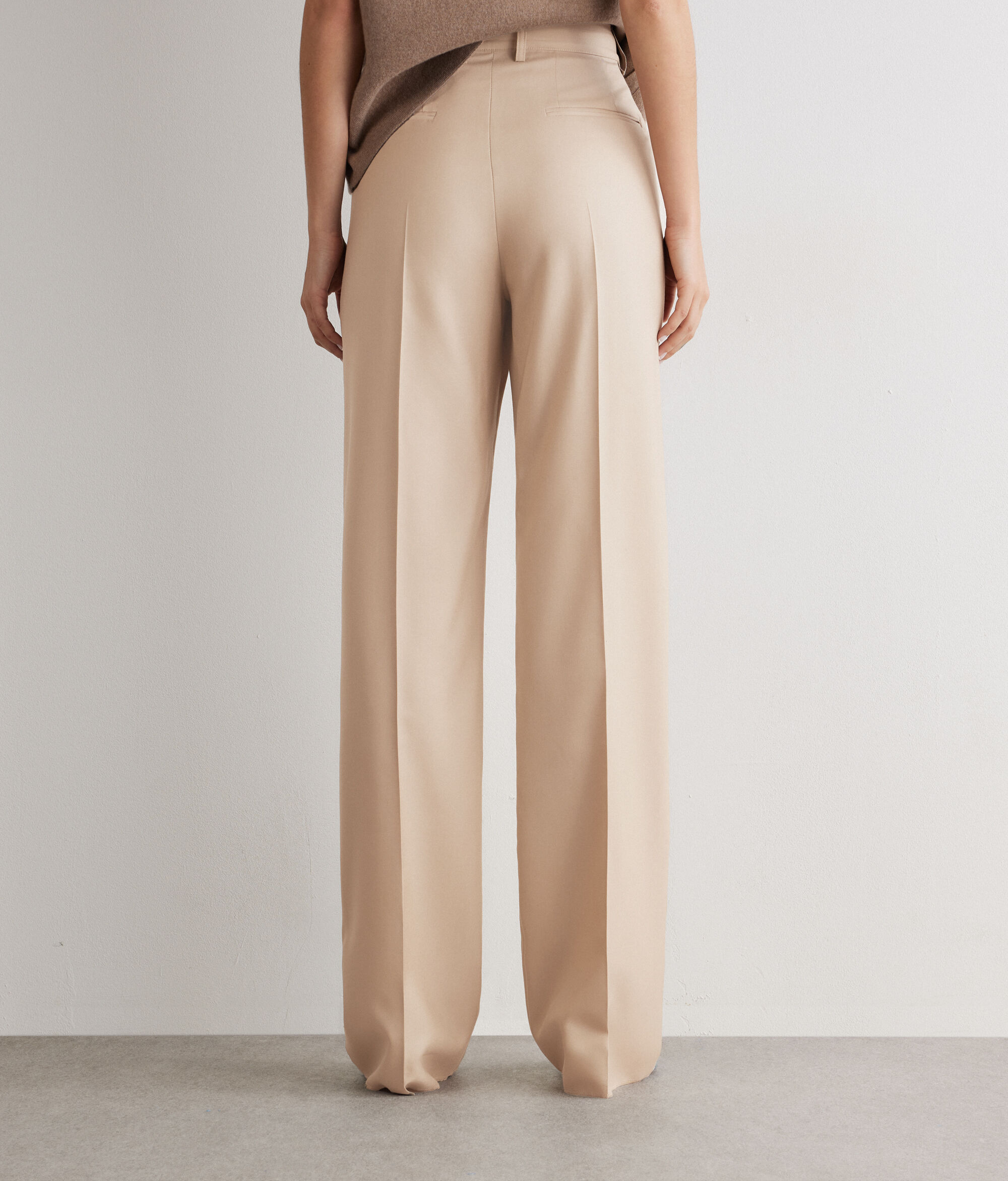 Tailored straight-cut trousers in cashmere silk, enhanced by the pleat at the front and back. The zip, flap and button fastening, together with the waistband with belt loops, defines the design, completed by slant pockets at the front and mock double welt pockets at the back.