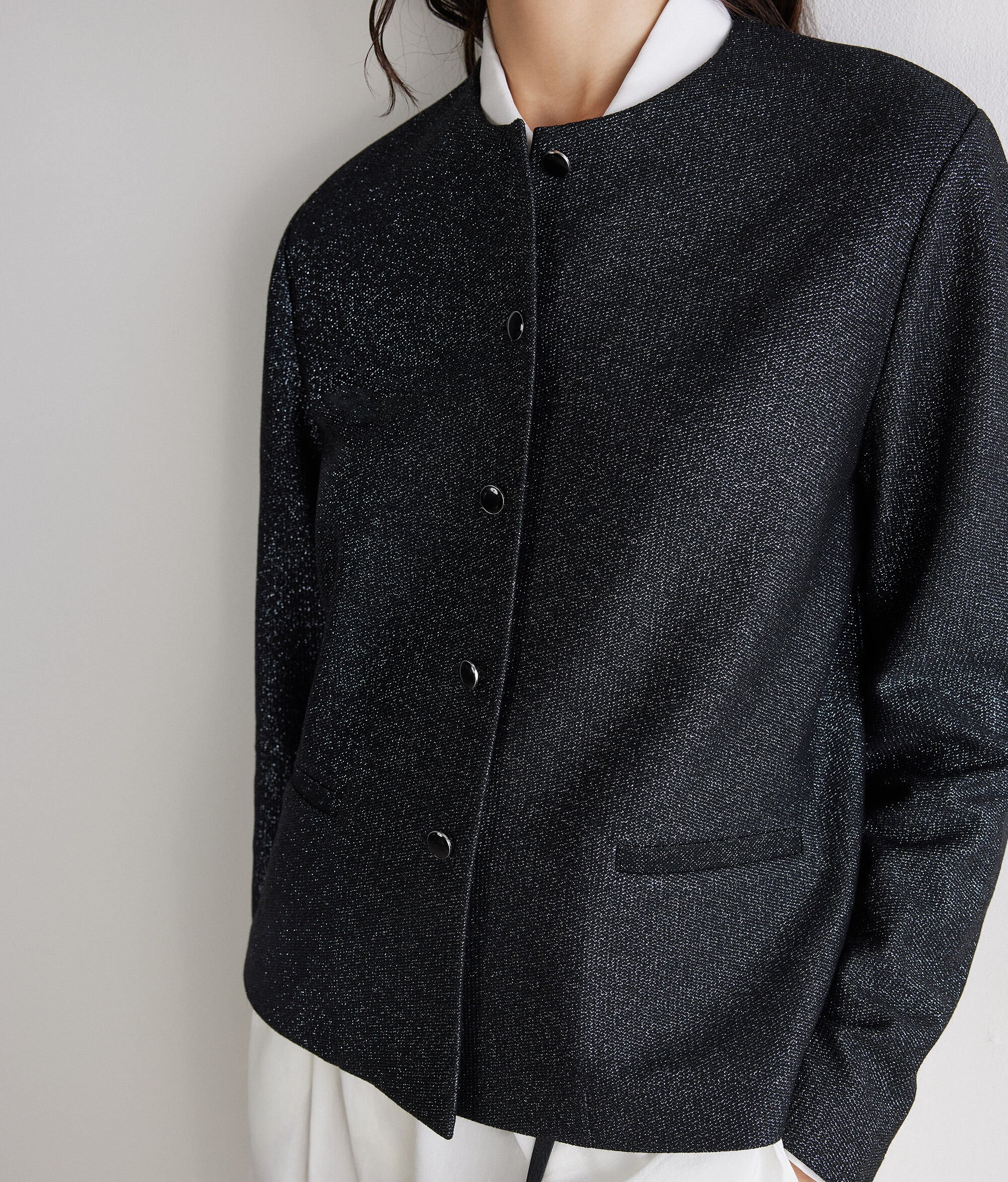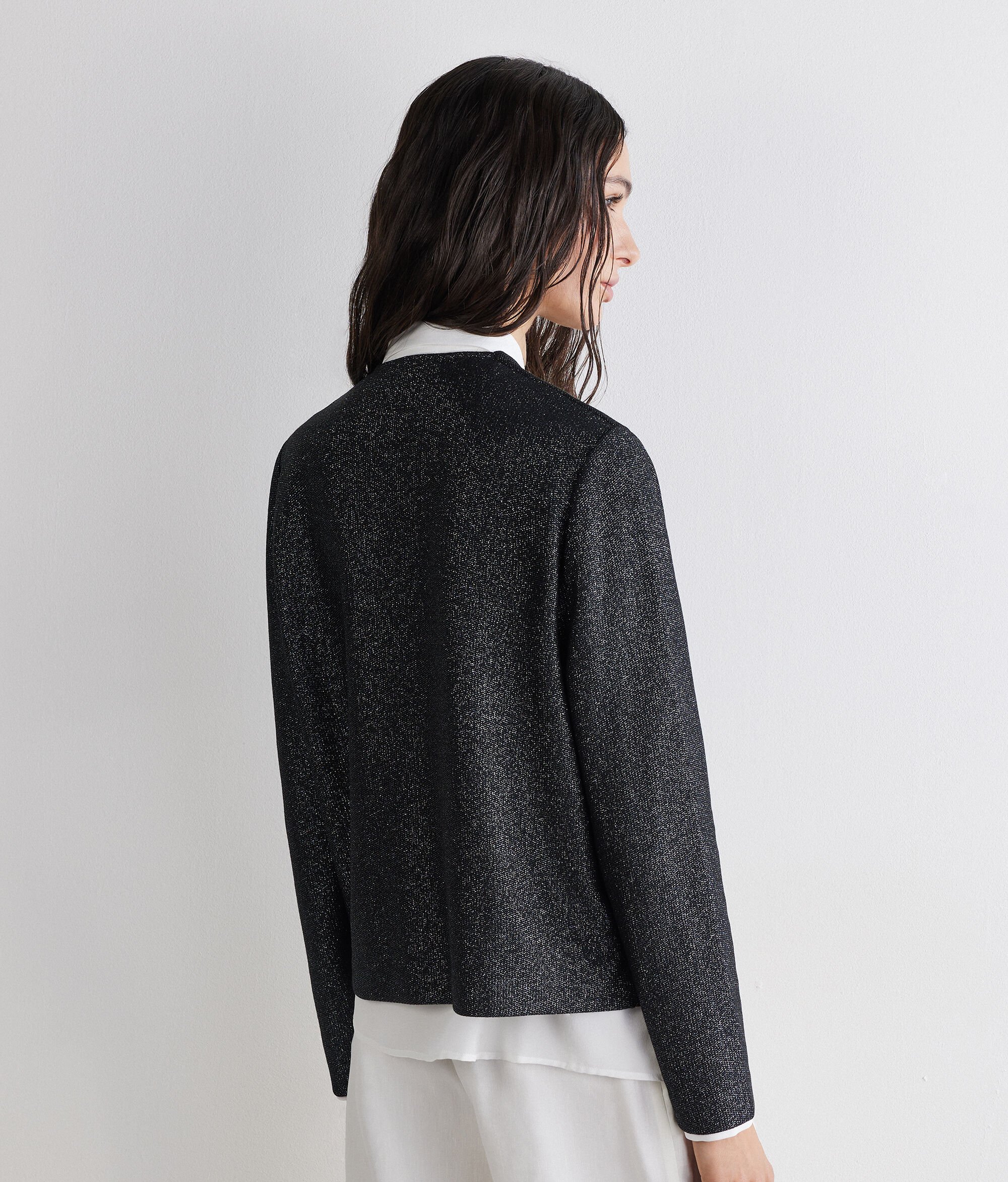 Cotton knit jacket embellished with lamé yarn for a bright and refined texture. The simple crew neck and single-breasted fastening with tonal enamel buttons create a clean and elegant silhouette. Welt pockets keep the profile understated, while the crop length and regular fit create modern, sophisticated proportions.