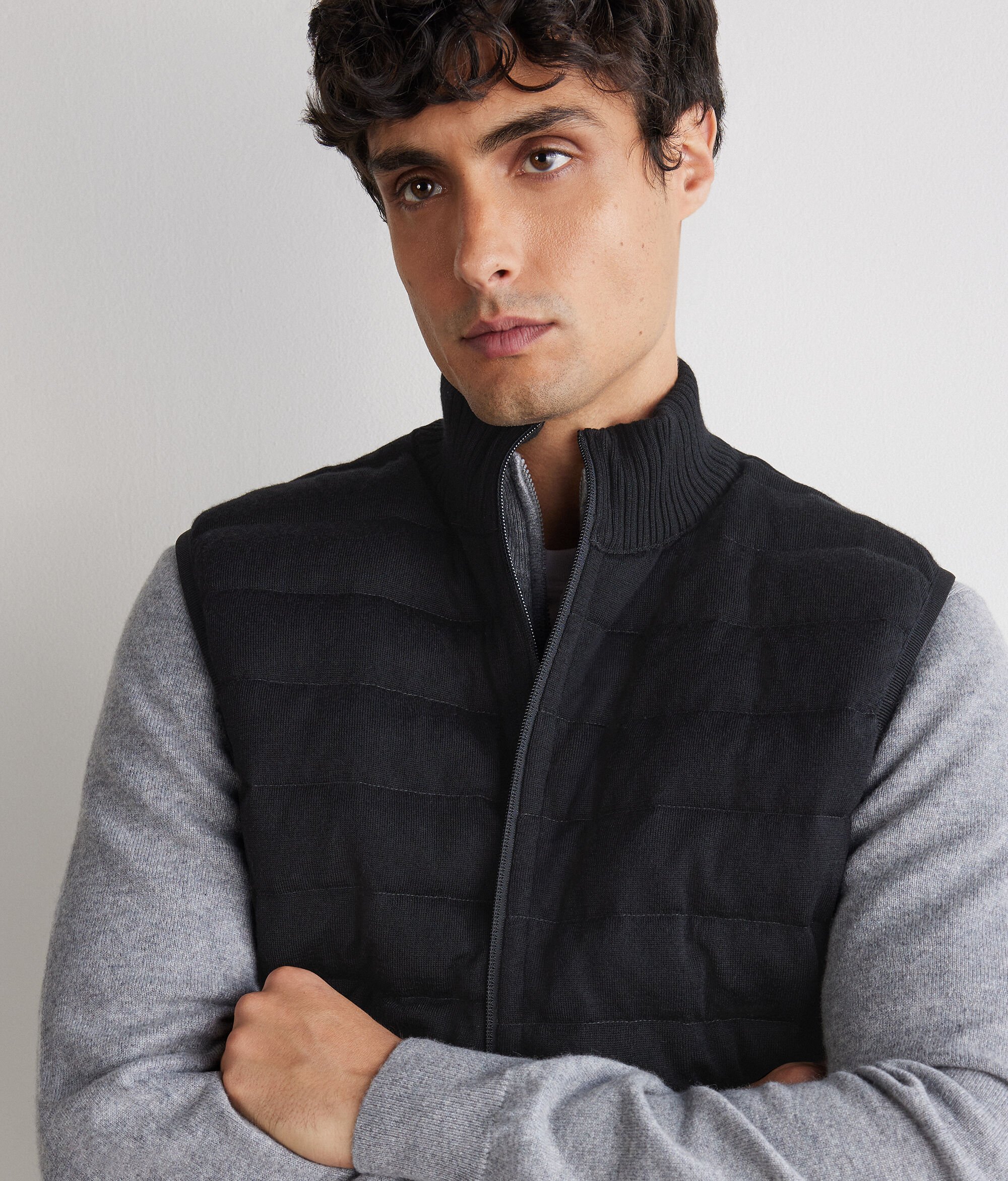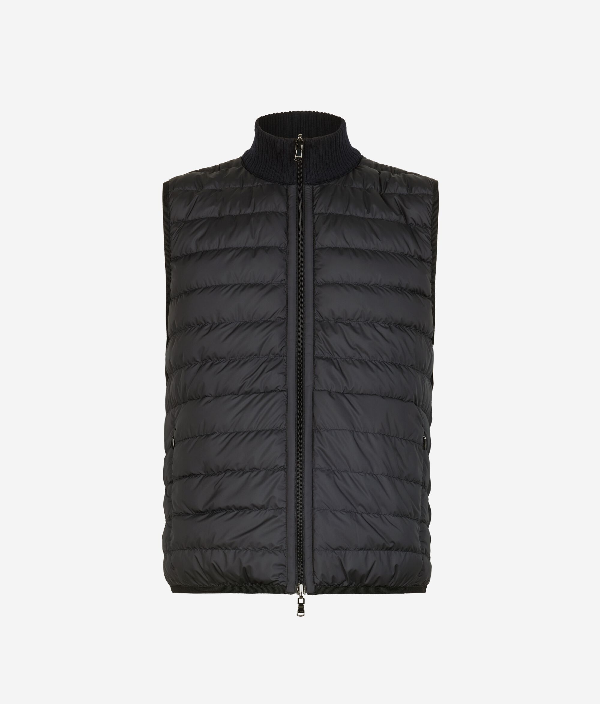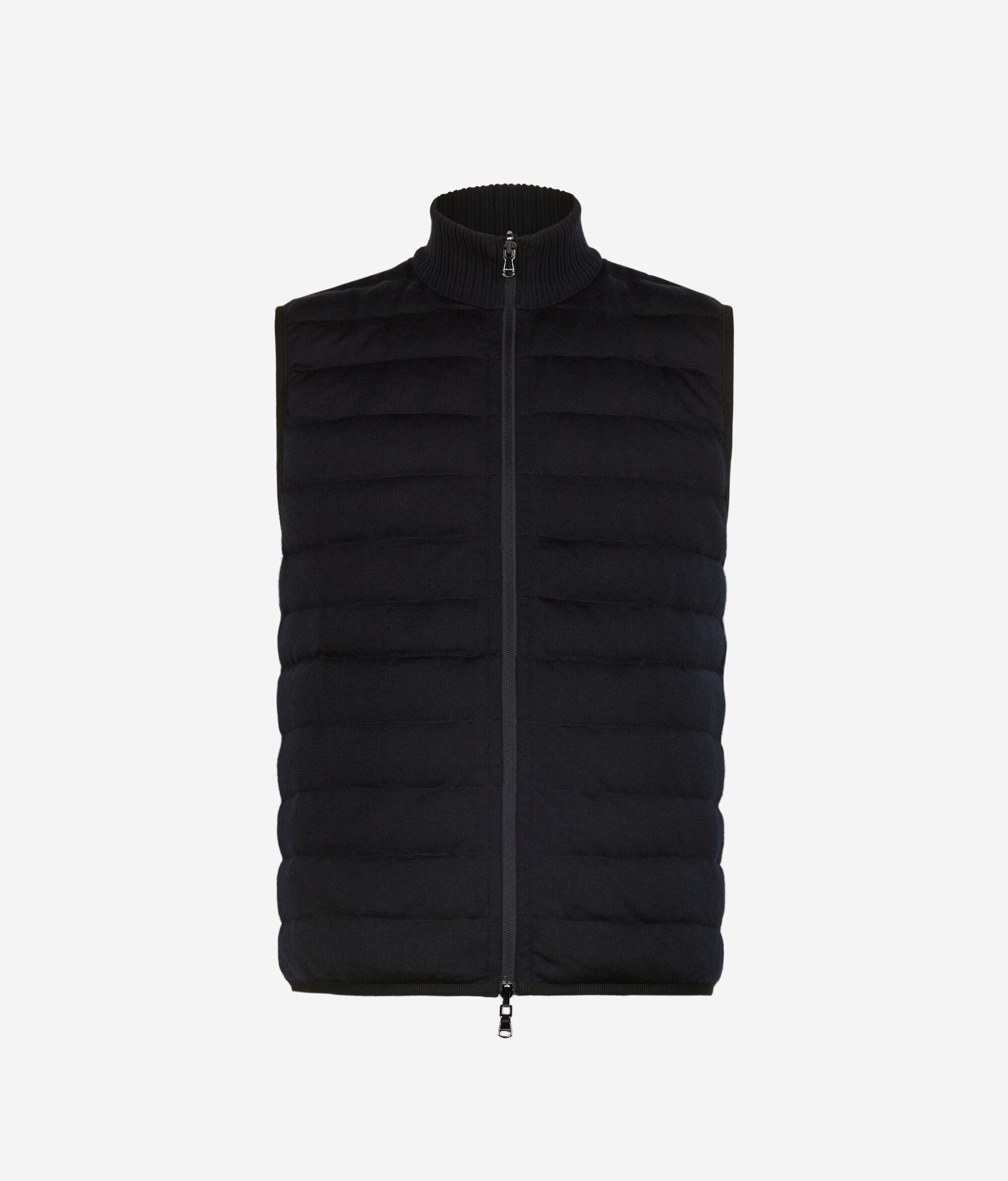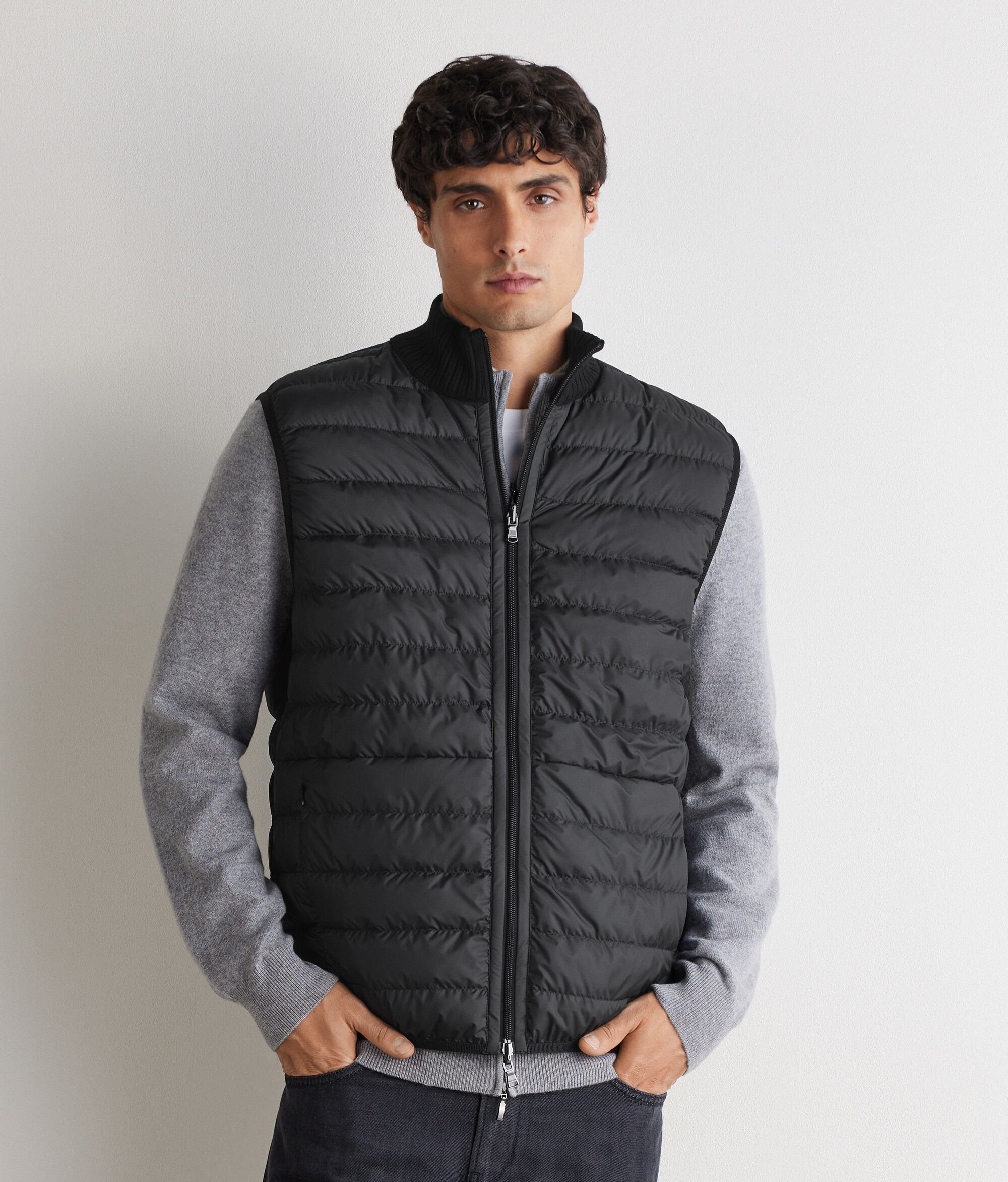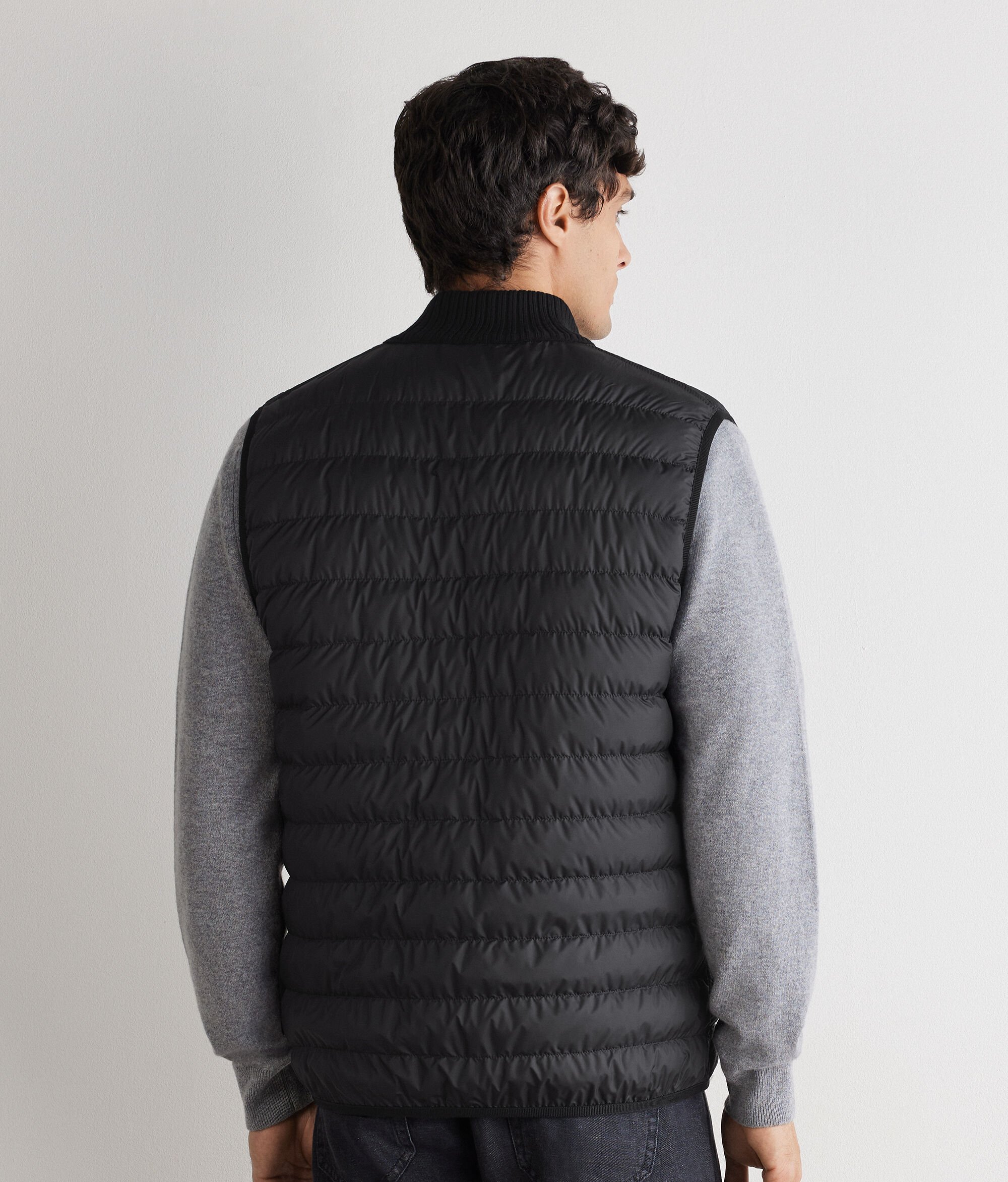 Reversible sleeveless down jacket – the perfect mix of functionality and sophistication. With one side in matte technical fabric and the other in woven Ultrafine Cashmere: a sophisticated and contemporary contrast of yarns. The high cashmere knit collar, double-slider zip and invisible pockets define practical and elegant details, while elasticated waistband finishes and a slim fit complete a versatile garment with a refined design.