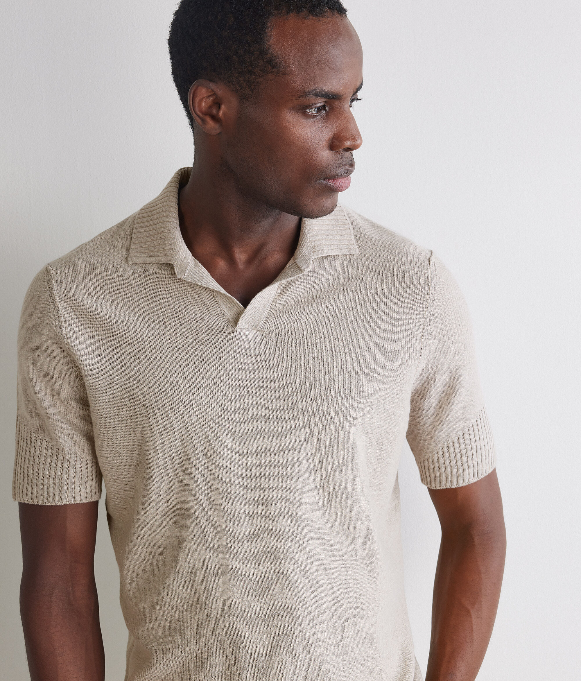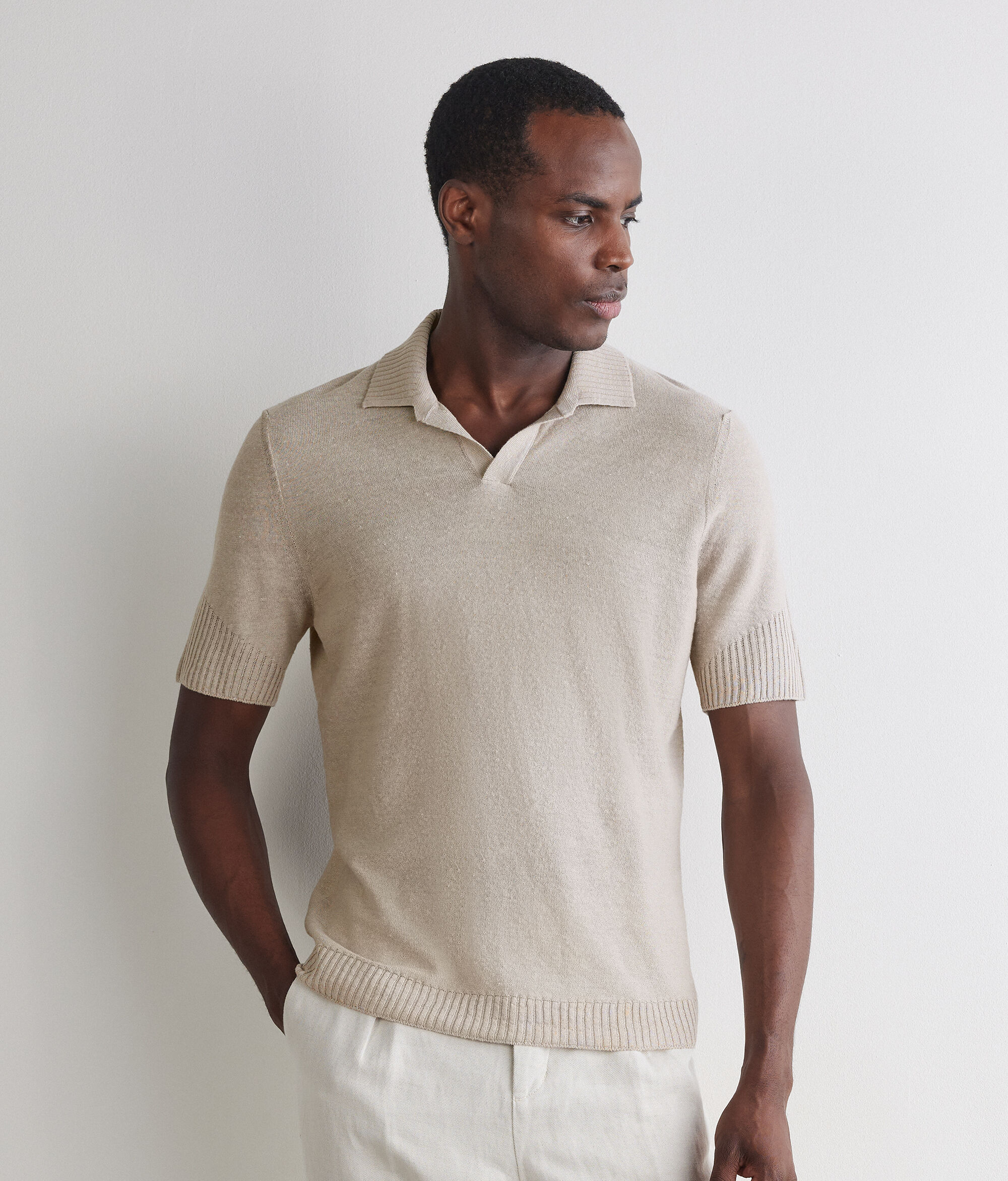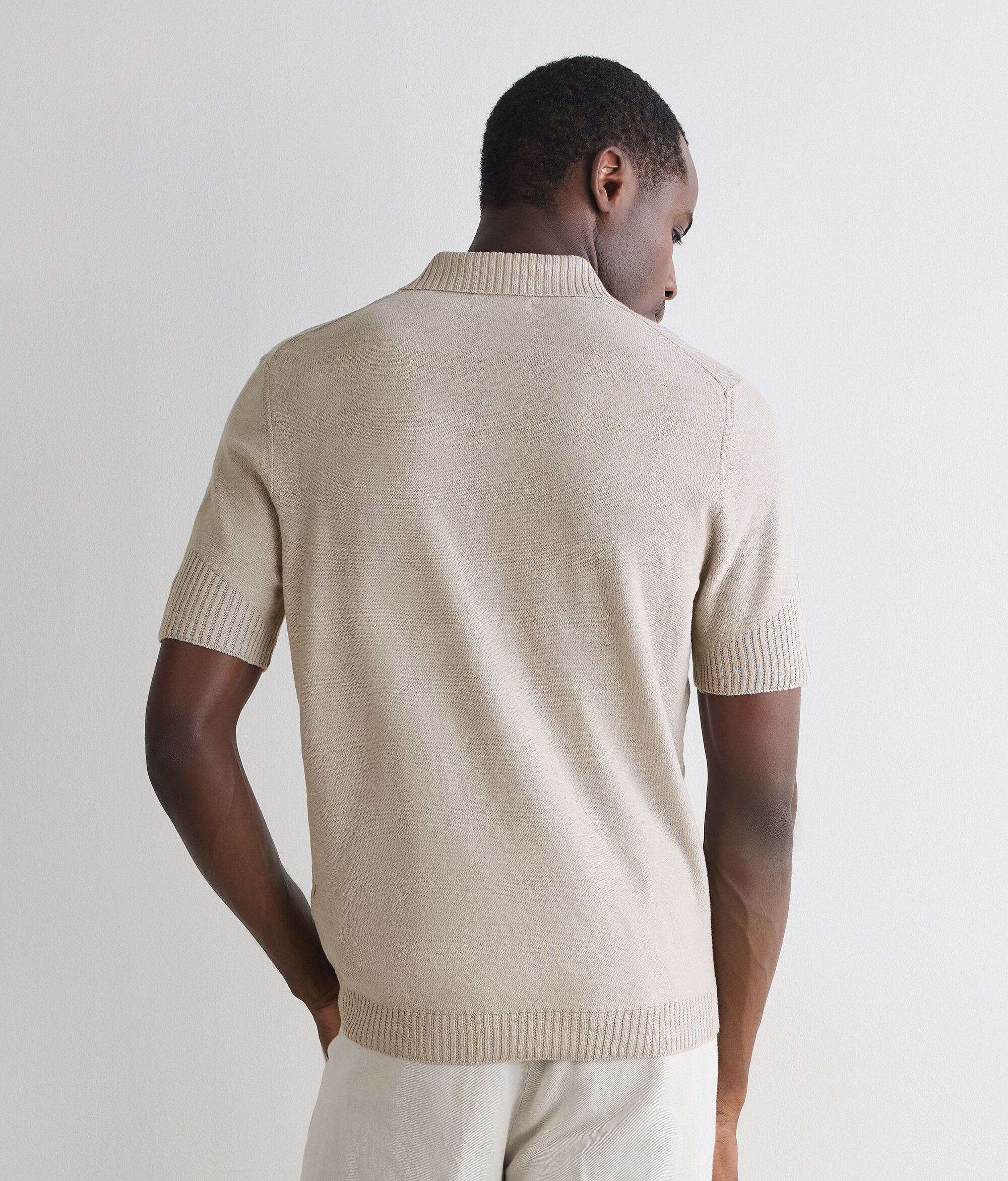 Ribbed polo shirt in linen and cotton (65% linen, 35% cotton). The triangular detailing on the bottom of the sleeve adds a distinctive touch to the regular-fit model.