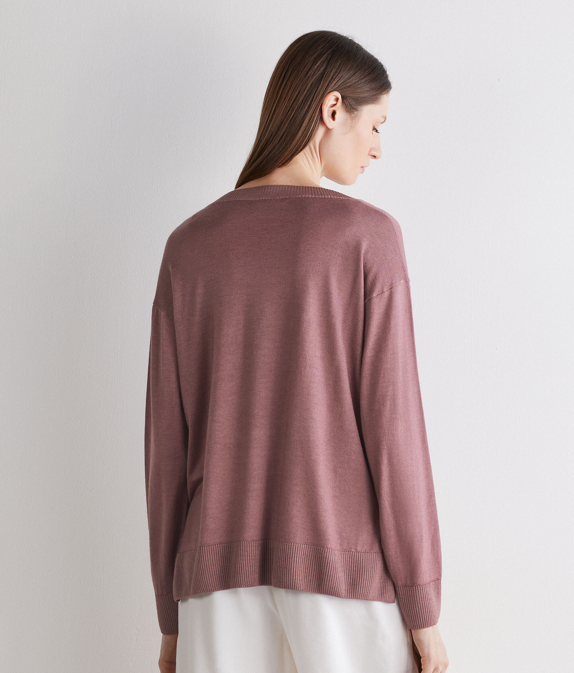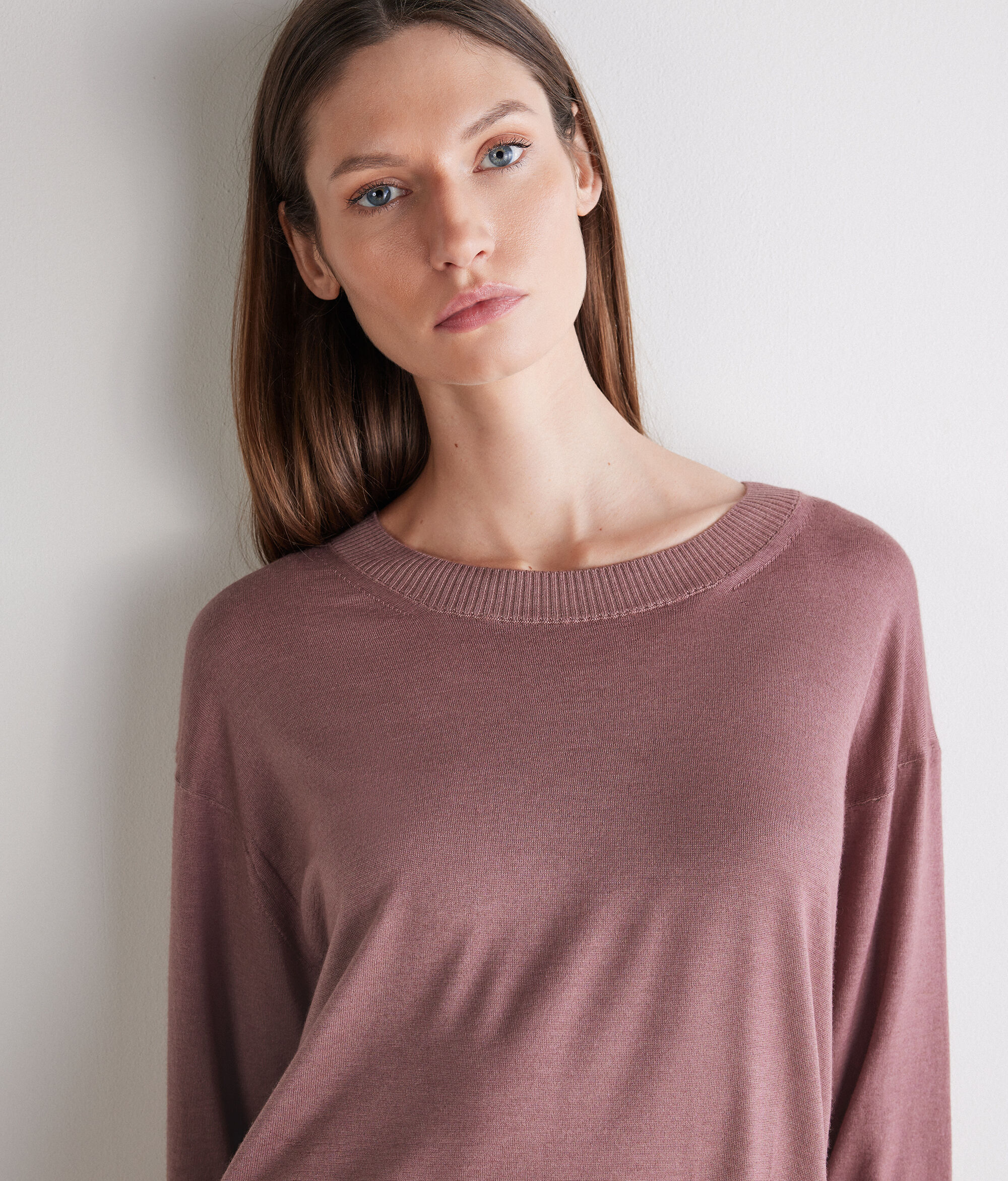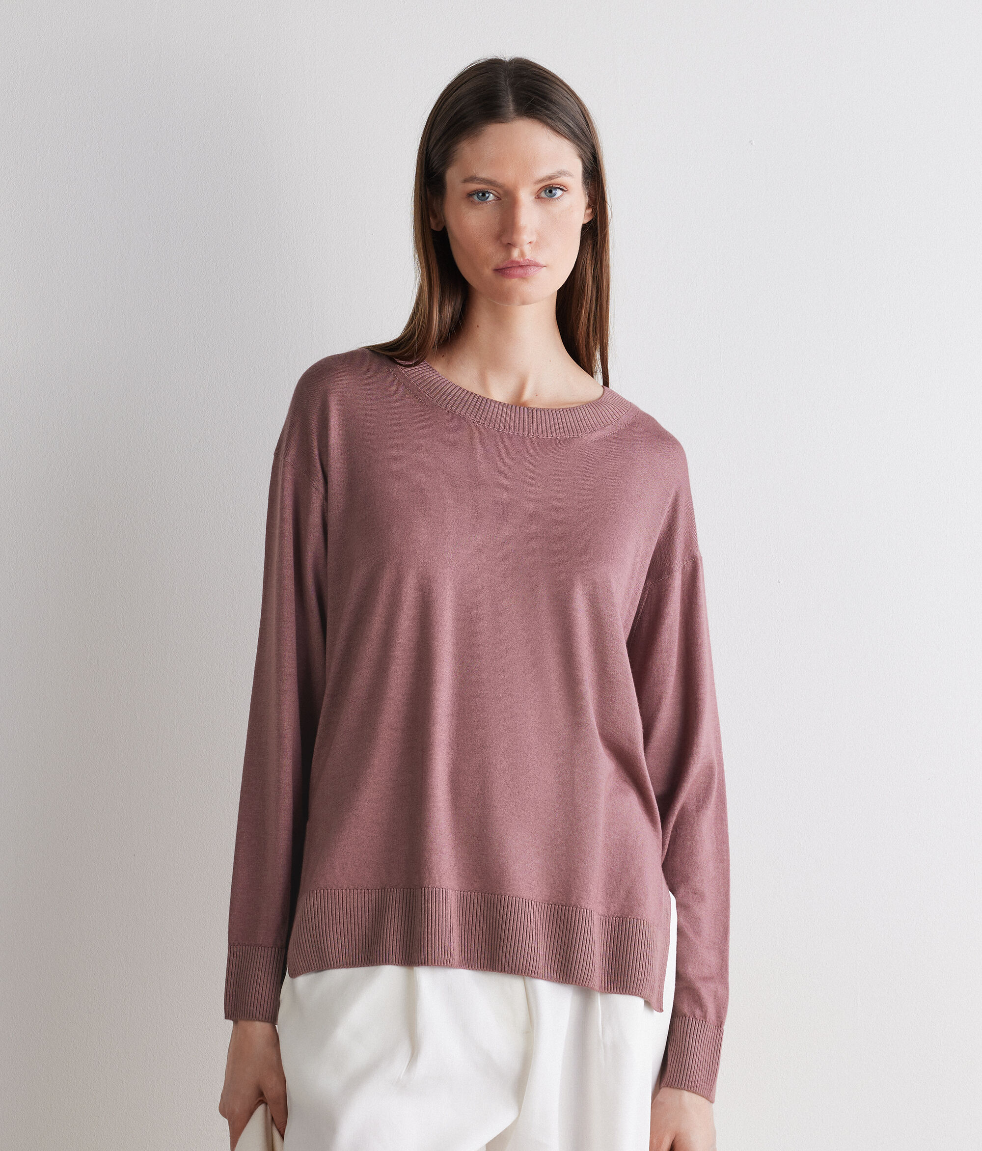 Round-neck jumper in Ultrafine Cashmere with long sleeves and ribbing on the neckline, cuffs and hem. This piece stands out for its side slits. The shoulders are slightly dropped, and it has a regular fit.