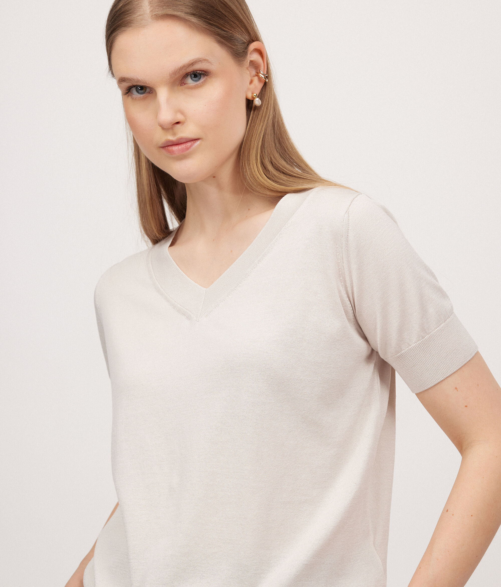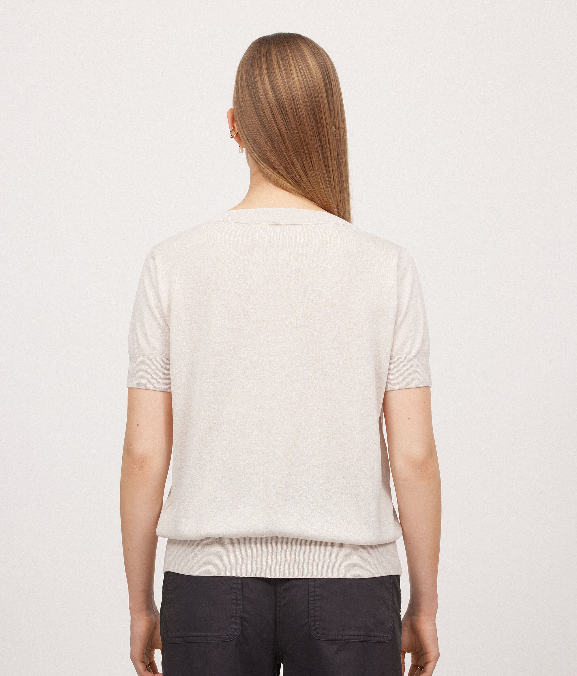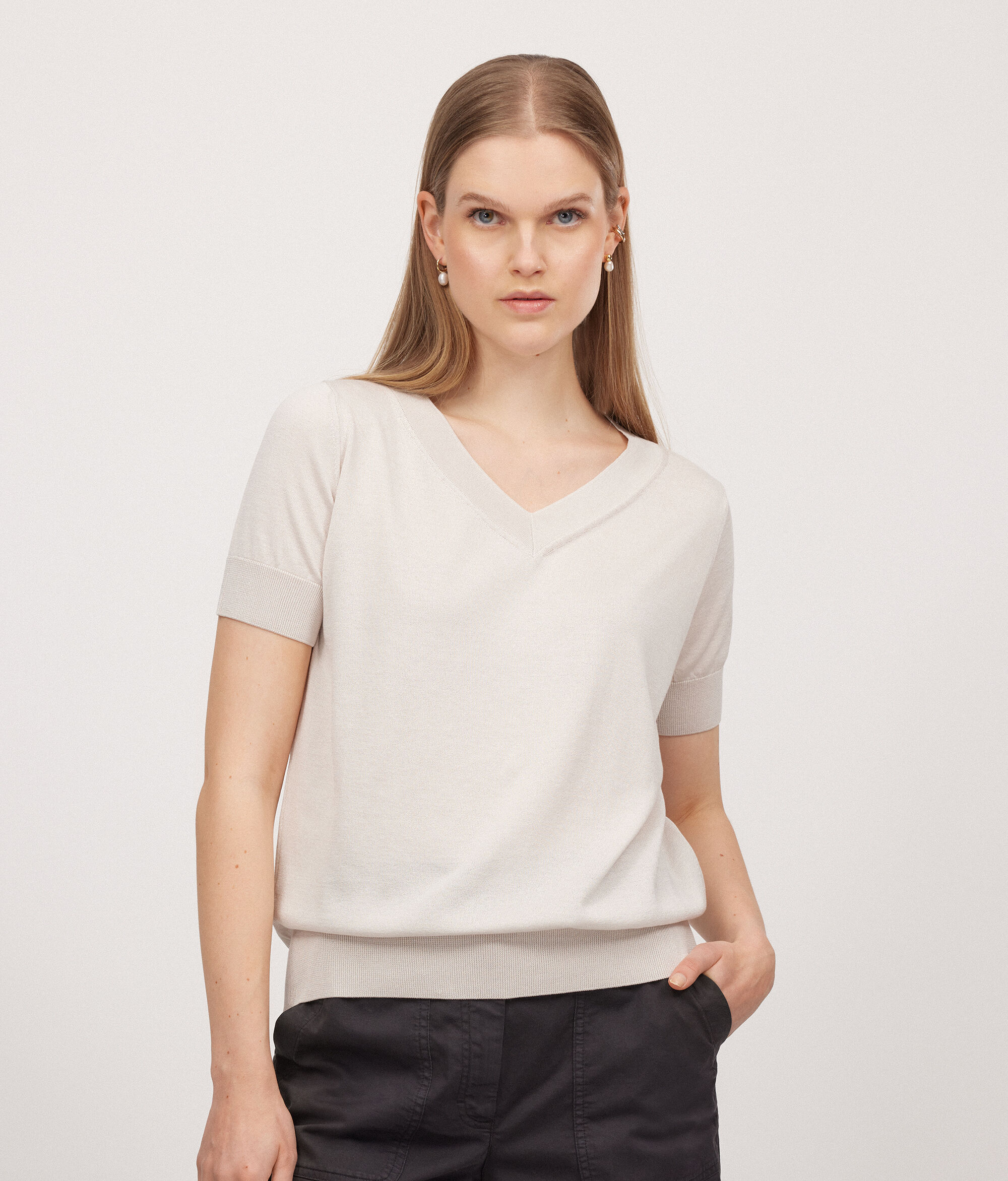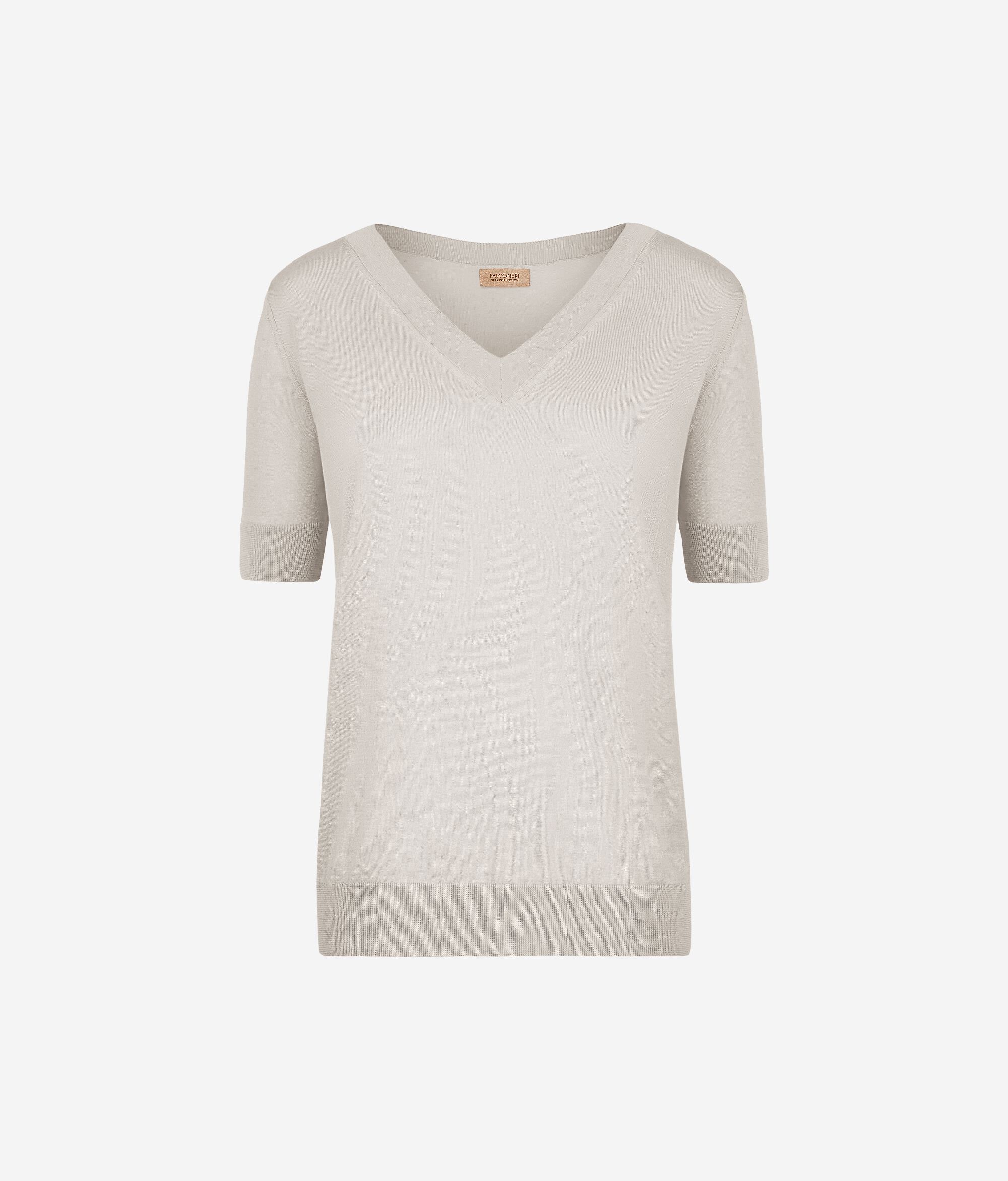 Short-Sleeved V-Neck Silk and Cotton Jumper
