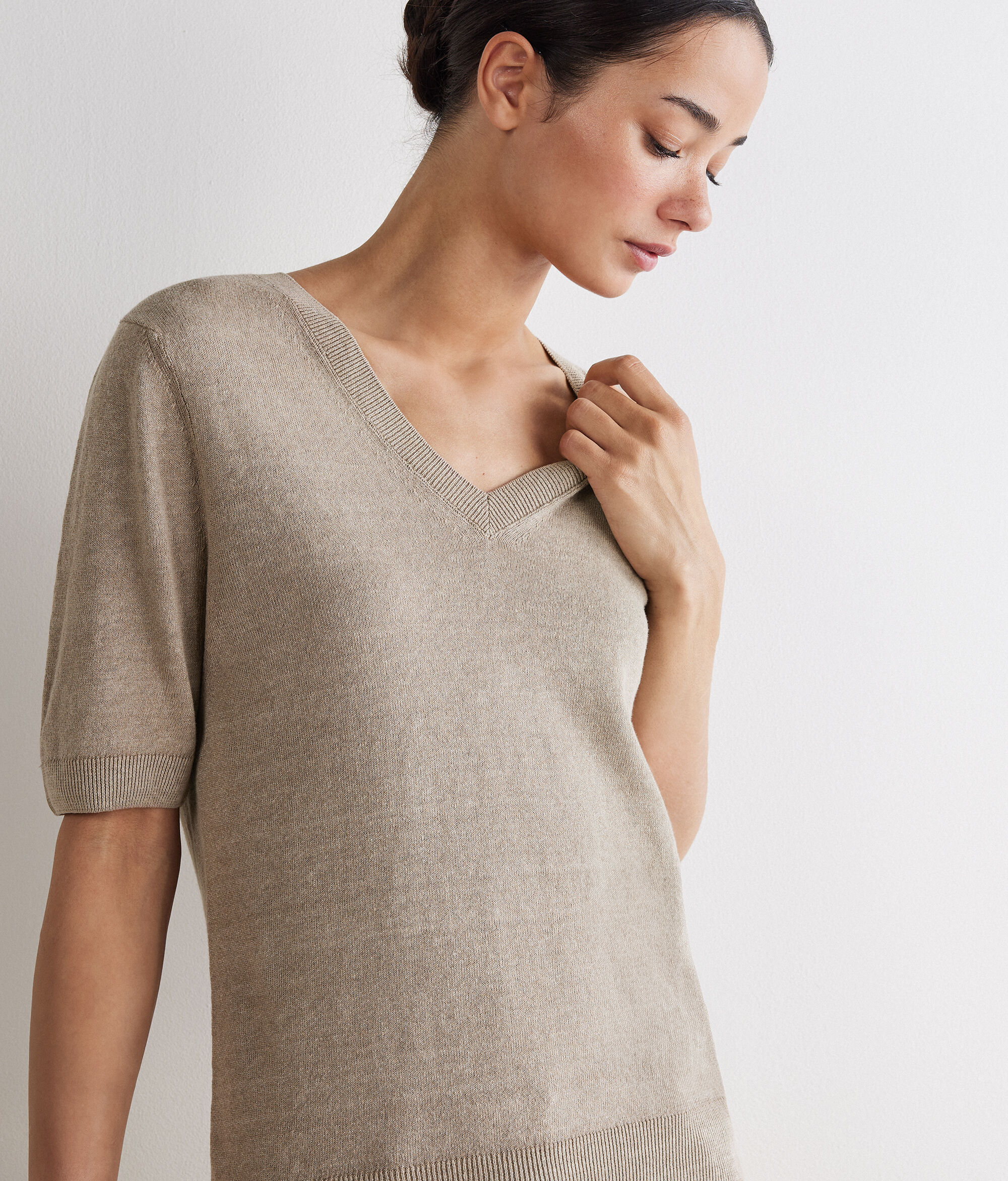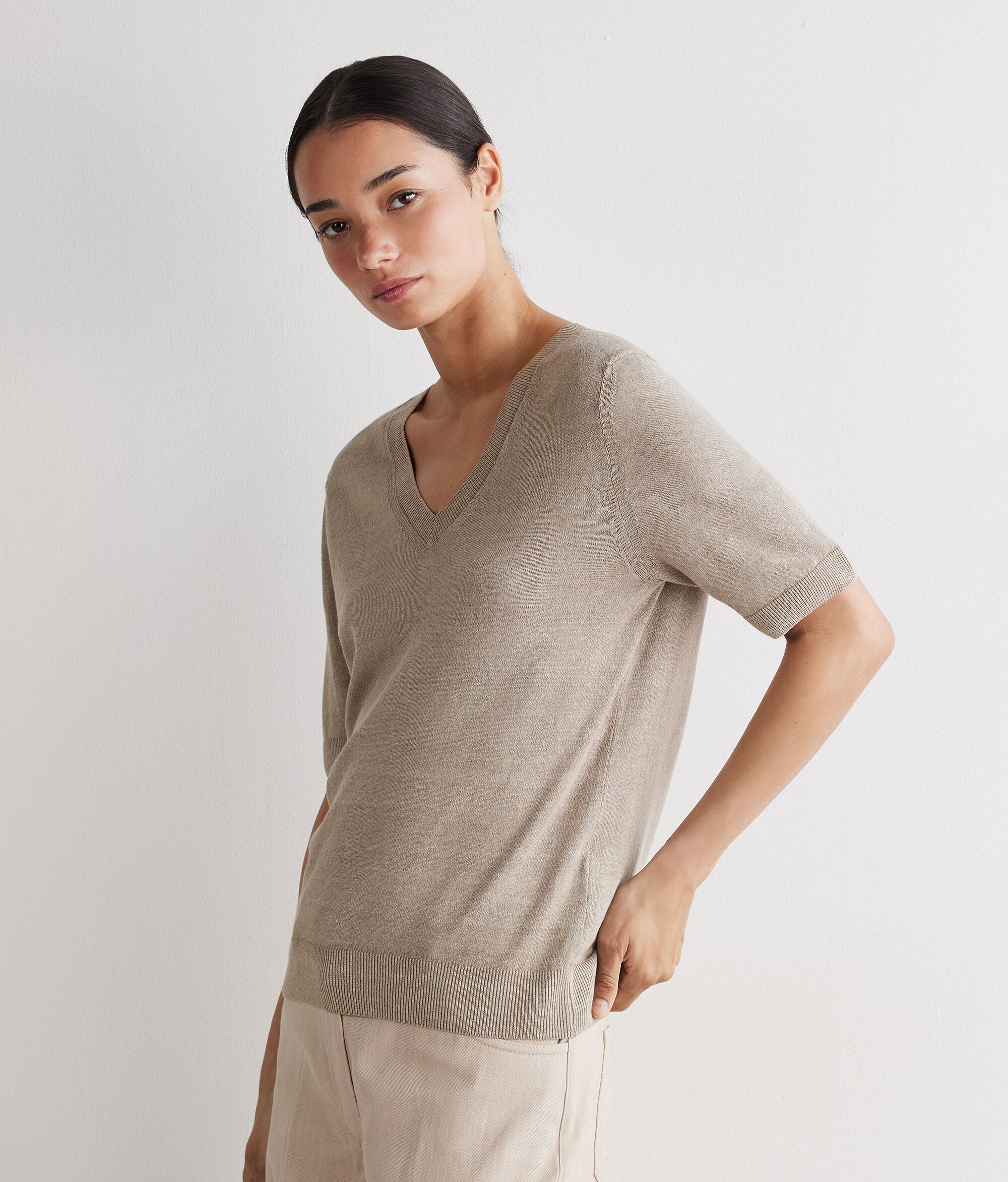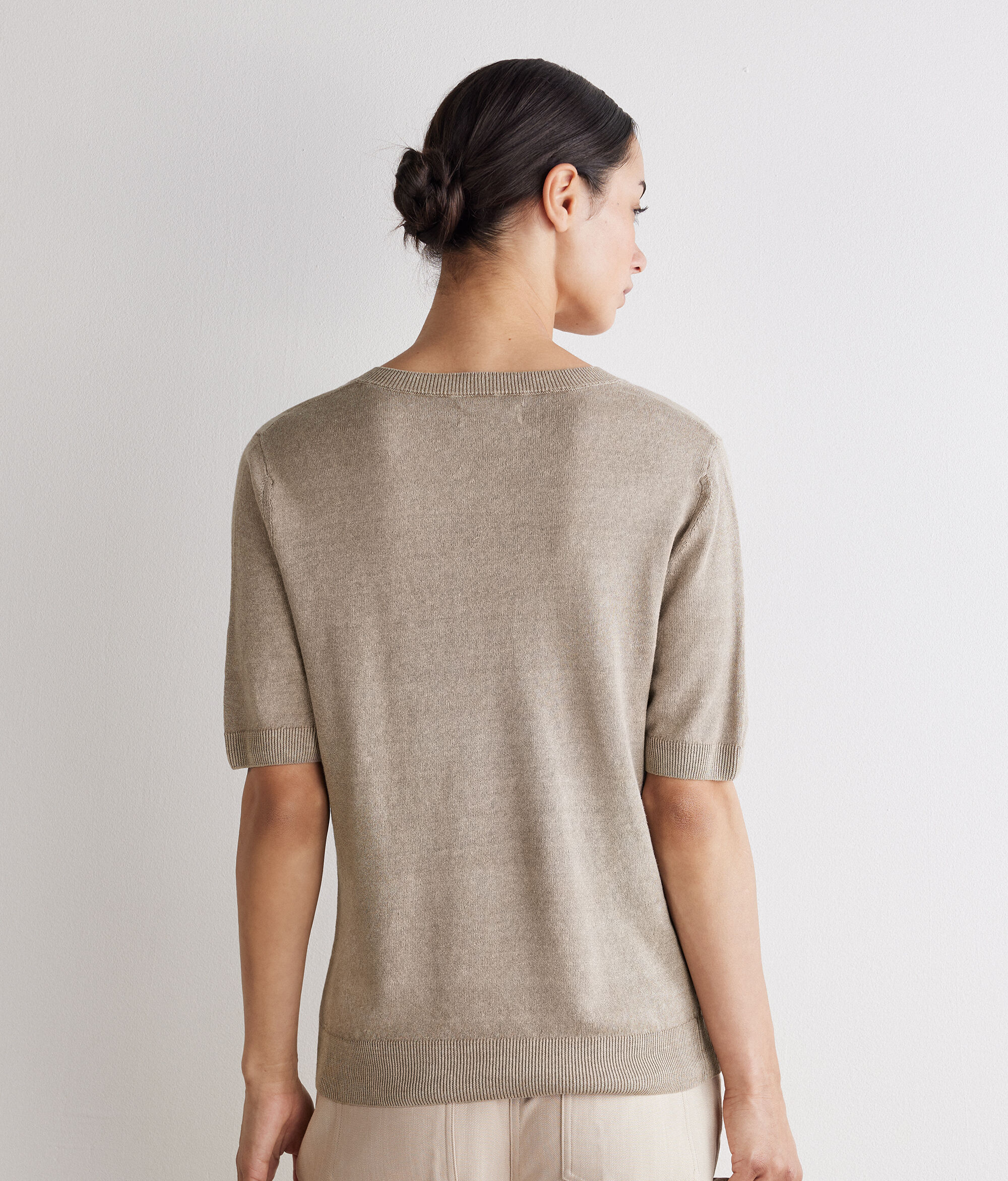 Minimalist and sophisticated, this linen and cotton t-shirt combines natural freshness and contemporary style. The V neck sets off the neckline with simplicity, while the short kimono sleeves bring a soft, feminine line. The rib finishes on hem and sleeves add a crafted touch to the design, rounded off by a relaxed fit and length that skims the hips.