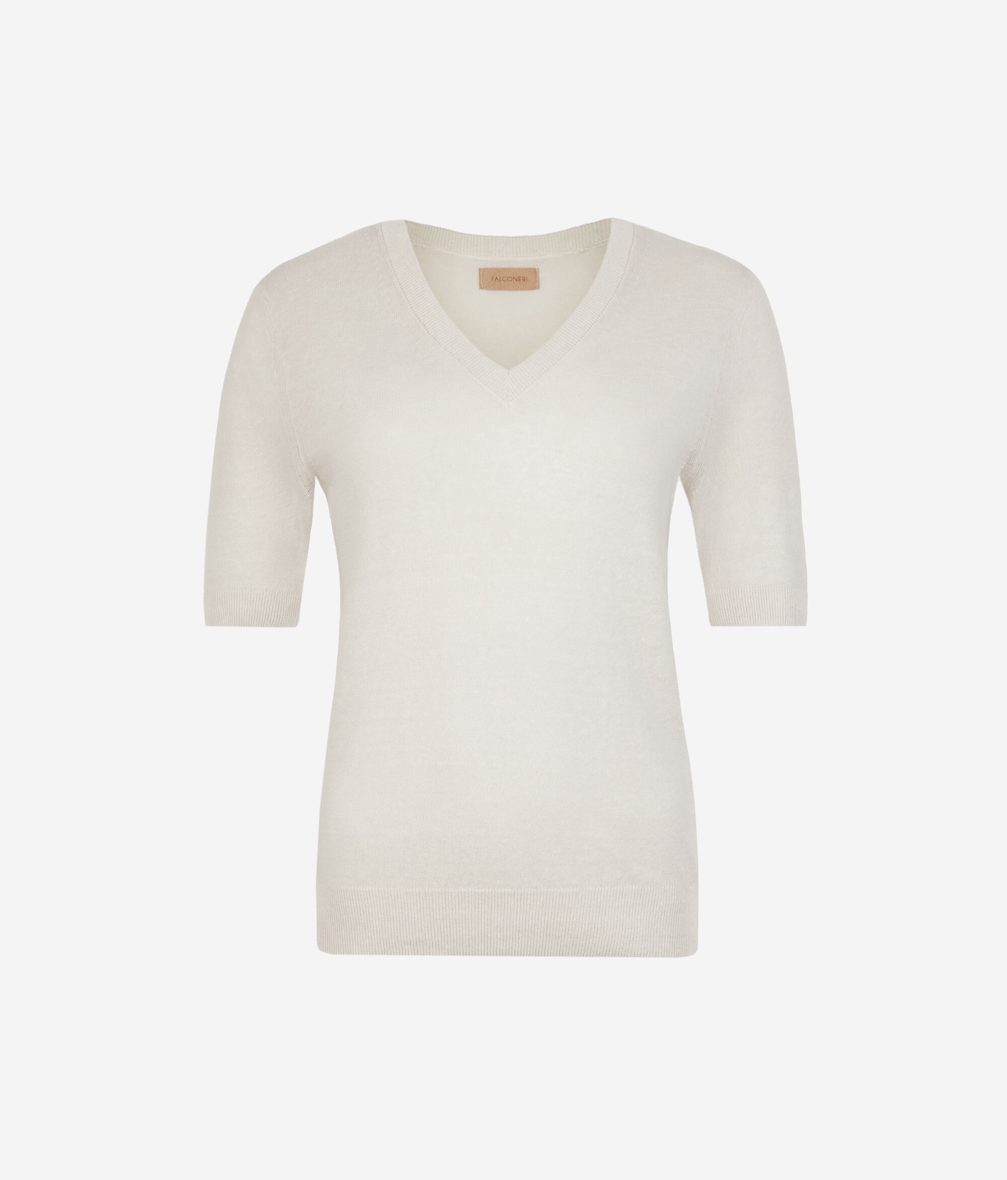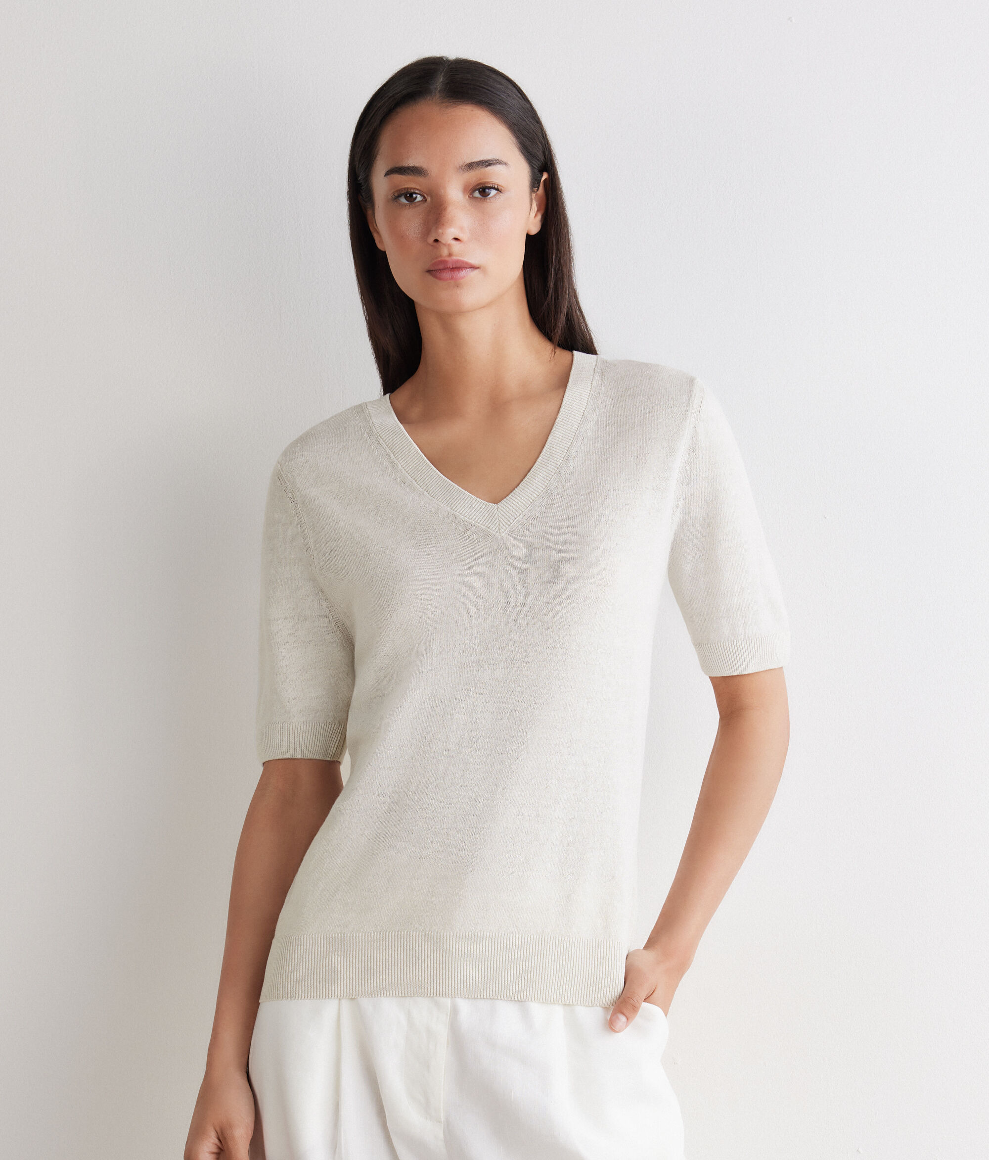 Minimalist and sophisticated, this linen and cotton t-shirt combines natural freshness and contemporary style. The V neck sets off the neckline with simplicity, while the short kimono sleeves bring a soft, feminine line. The rib finishes on hem and sleeves add a crafted touch to the design, rounded off by a relaxed fit and length that skims the hips.