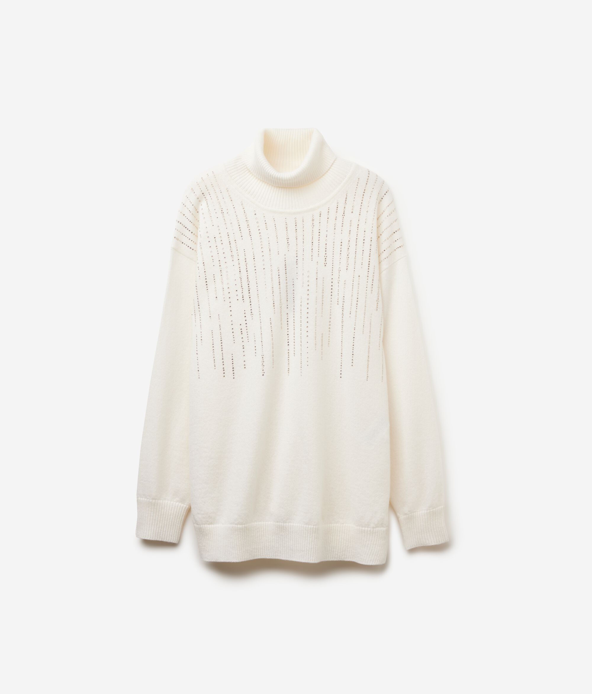 Αυτό το απαλό και άνετο ζιβάγκο από Ultrasoft Cashmere είναι ο τέλειος συνδυασμός μεταξύ κομψότητας και μοντέρνου στυλ. Η ελαφρώς χαμηλή μανικοκόλληση δημιουργεί μια χαλαρή και σύγχρονη γραμμή, ενώ τα απλικέ στρας στο μπροστινό μέρος, με εντυπωσιακό ντεγκραντέ εφέ, προσθέτουν μια πινελιά λάμψης που δεν περνά απαρατήρητη. Ο γιακάς, η μπορντούρα και οι μανσέτες με πλέξη λάστιχο δημιουργούν μια εκλεπτυσμένη πινελιά, ενώ τα σκισίματα στο κάτω μέρος προσδίδουν στο ρούχο χαλαρή εφαρμογή.