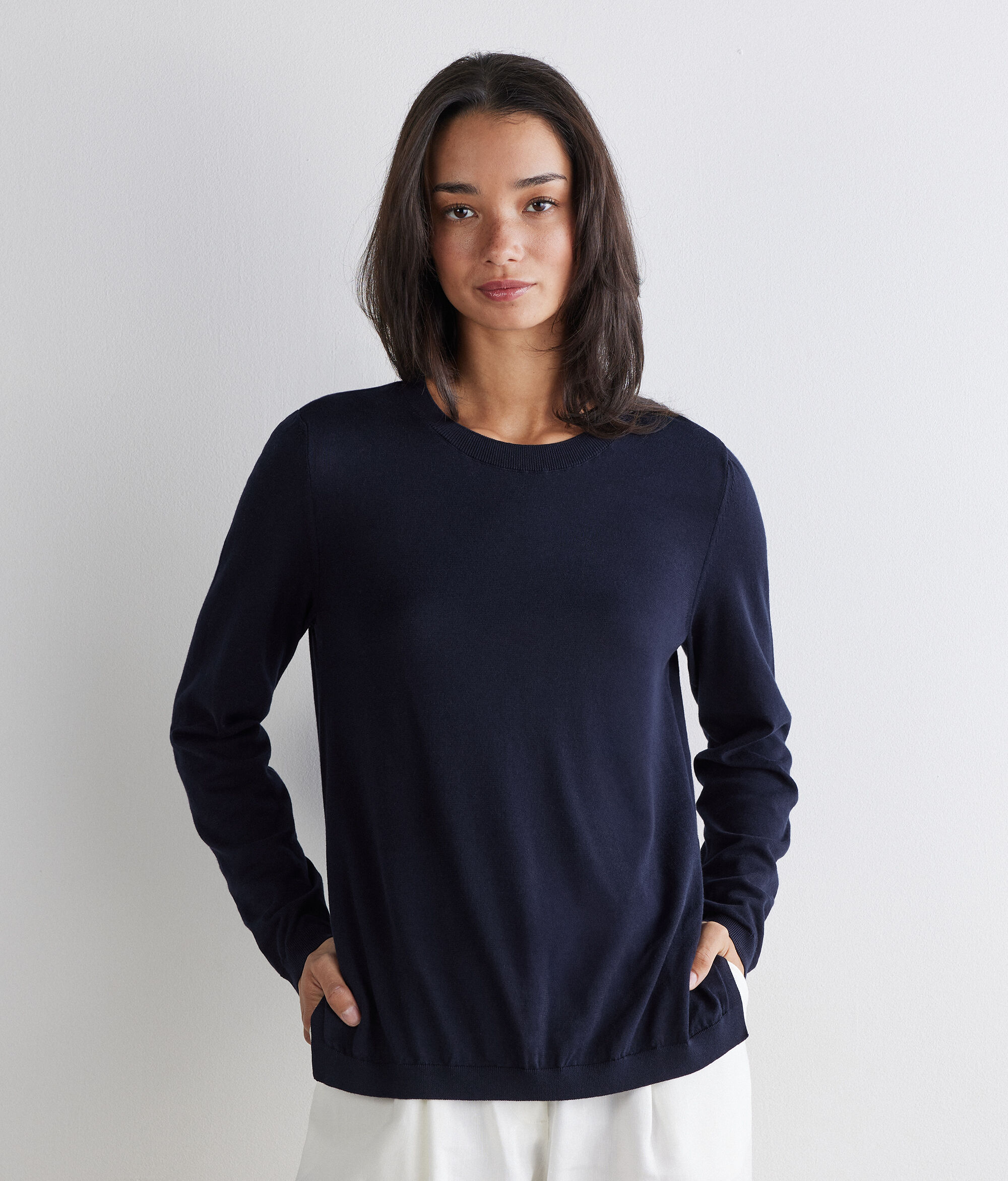 Μπλούζα από μαλακό βαμβάκι, λιτή και ευέλικτη. Η κλασική στρογγυλή λαιμόκοψη και τα ριμπ φινιρίσματα τονίζουν τη γραμμή, ενώ η κανονική εφαρμογή κάνει το κομμάτι ιδανικό για να φορεθεί μόνο του ή ως βάση για look με layering.
