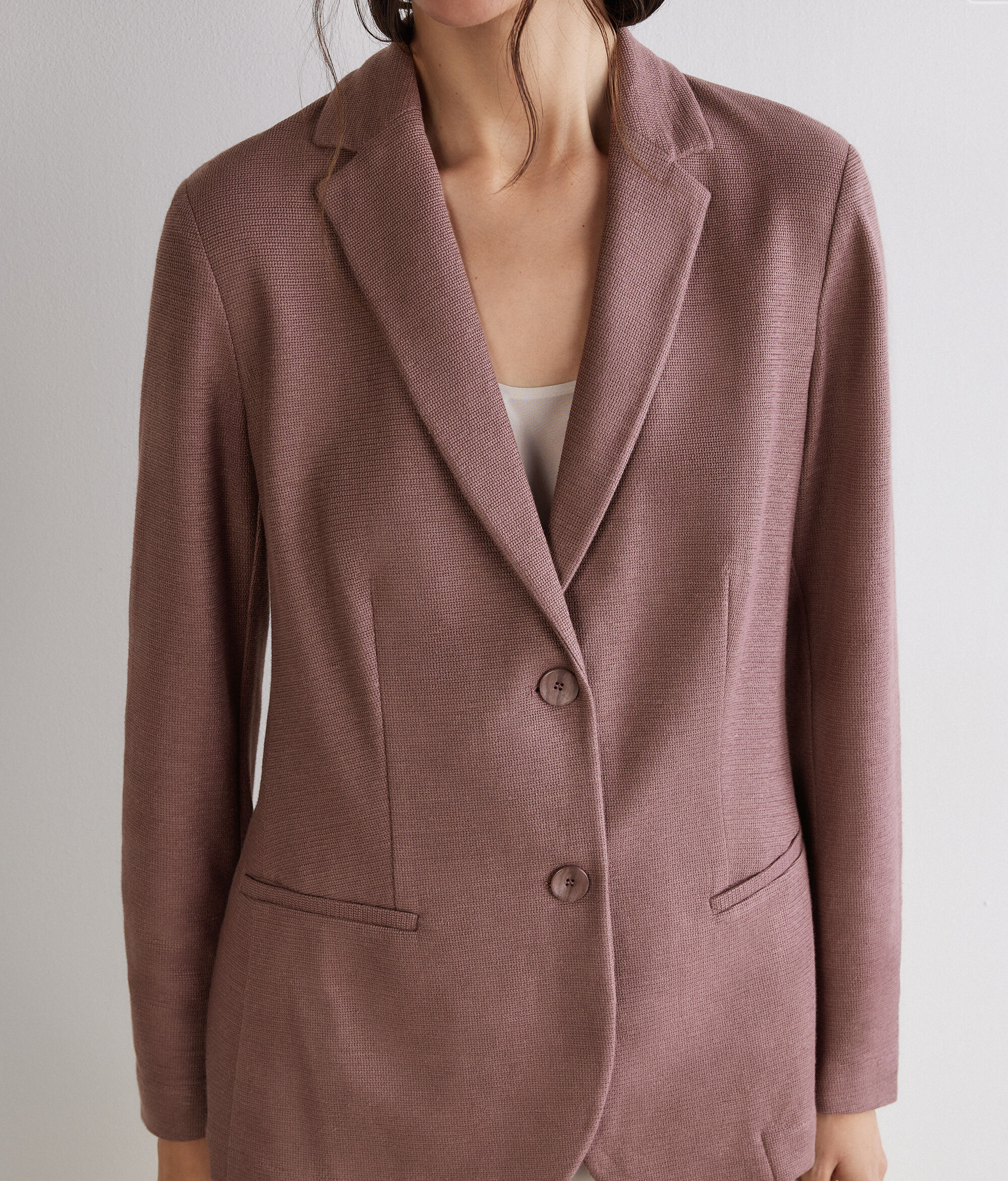 Σακάκι από λινό και βαμβακερό γκοφρέ ύφασμα, ελαφρύ και με εκλεπτυσμένη γοητεία. Το κλασικό πέτο και το μονόπετο κλείσιμο με δύο κουμπιά διαμορφώνουν μια κομψή γραμμή, ενώ οι ρελιαστές τσέπες προσθέτουν υφή και χαρακτήρα. Το σκίσιμο στο πίσω μέρος και η στενή εφαρμογή ολοκληρώνουν το ρούχο, μετατρέποντάς το σε ένα βασικό κομμάτι με έντονη γοητεία.