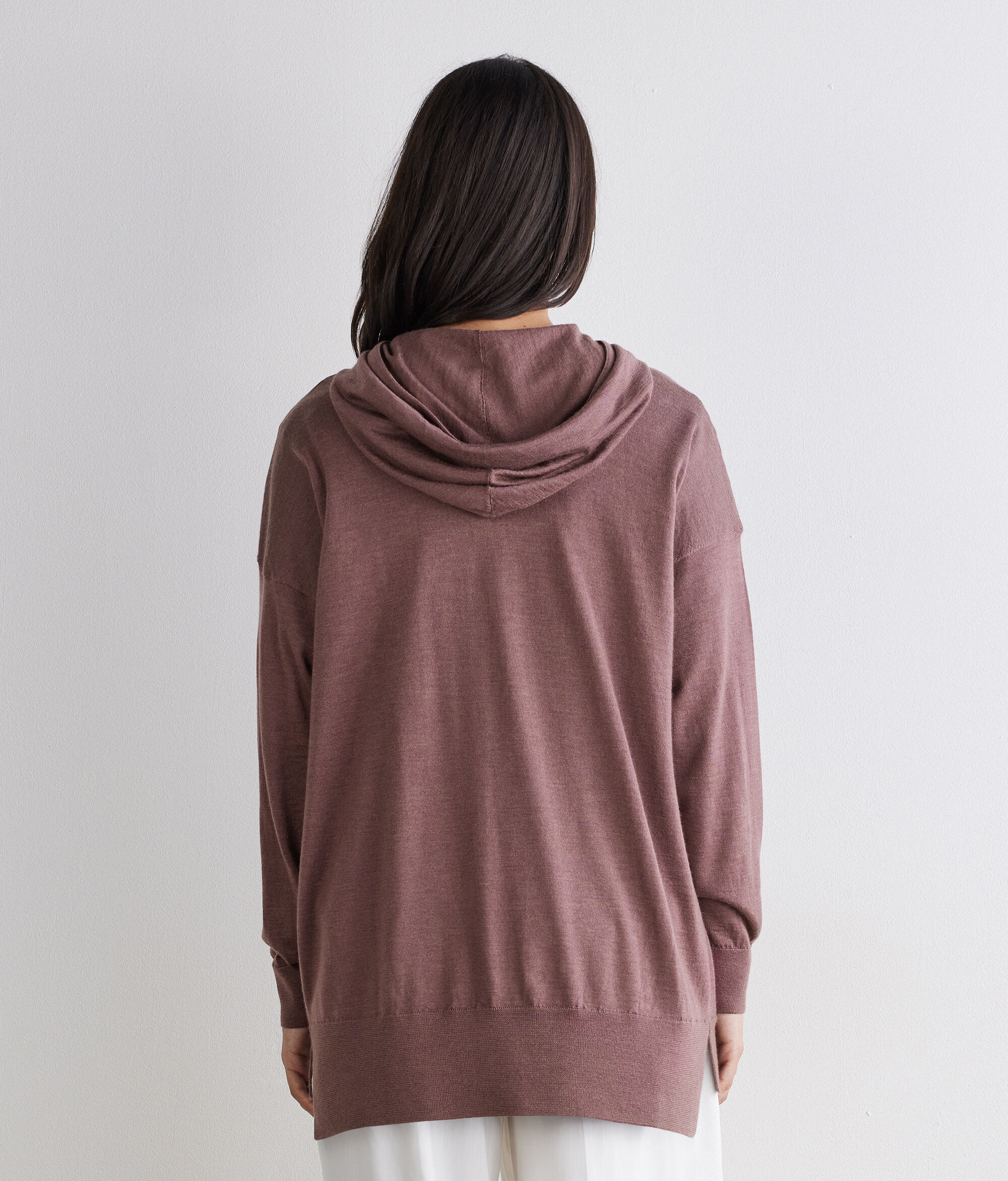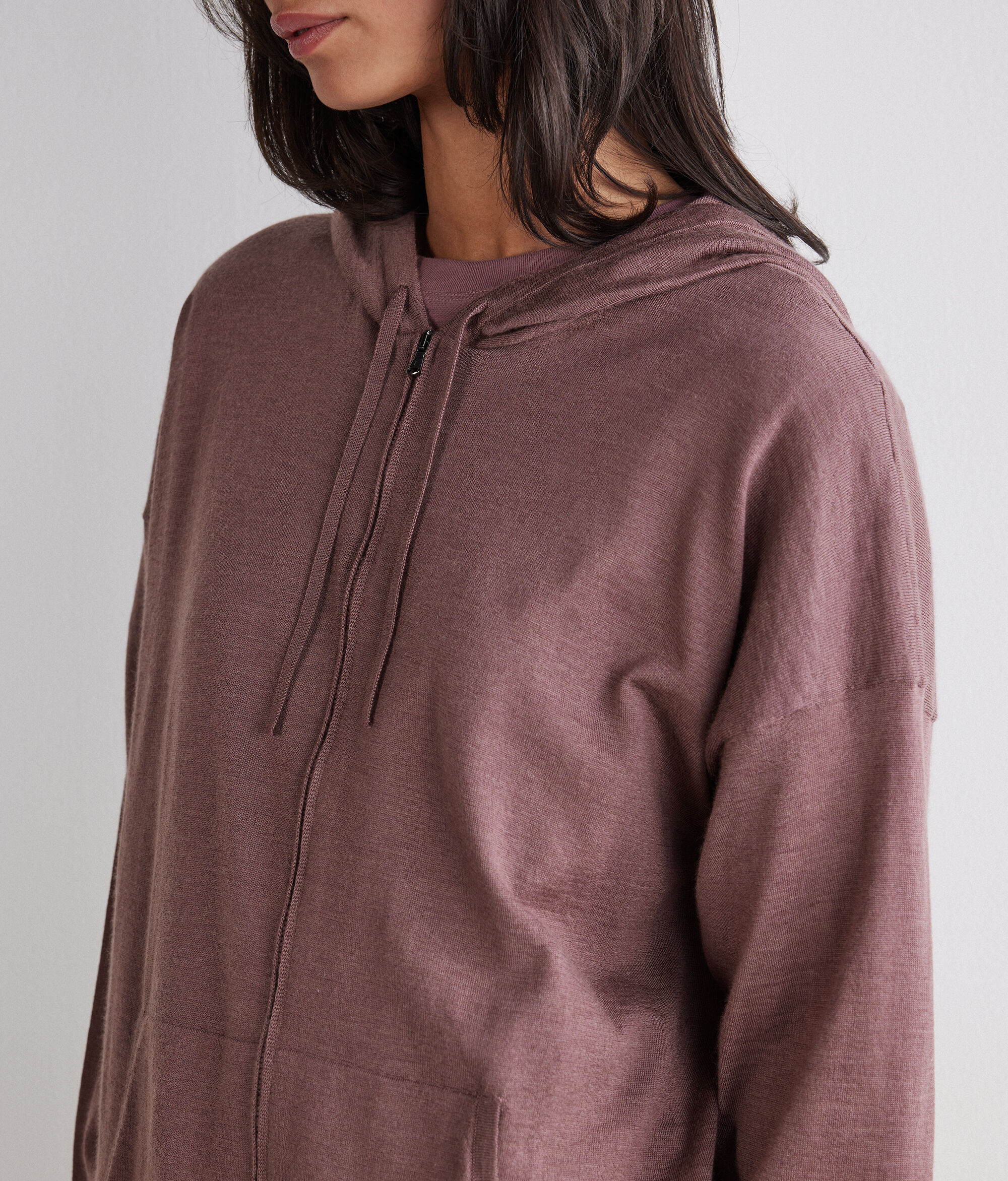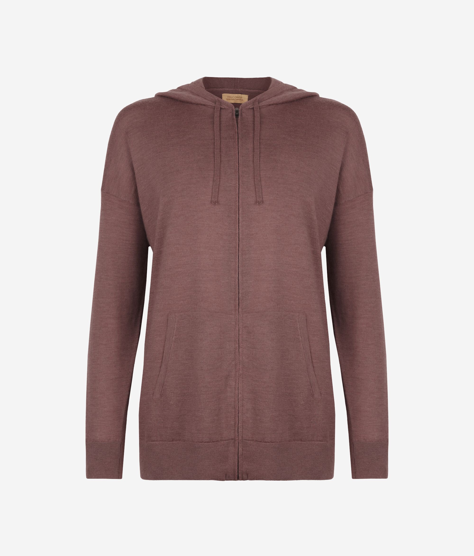 Φούτερ από Ultrafine Cashmere με κουκούλα. Το ρούχο έχει άνοιγμα με φερμουάρ μέχρι το κάτω μέρος, ανοιχτές πλαϊνές τσέπες και ελαφρώς ζαπονέ μανίκια. Χαλαρή εφαρμογή.