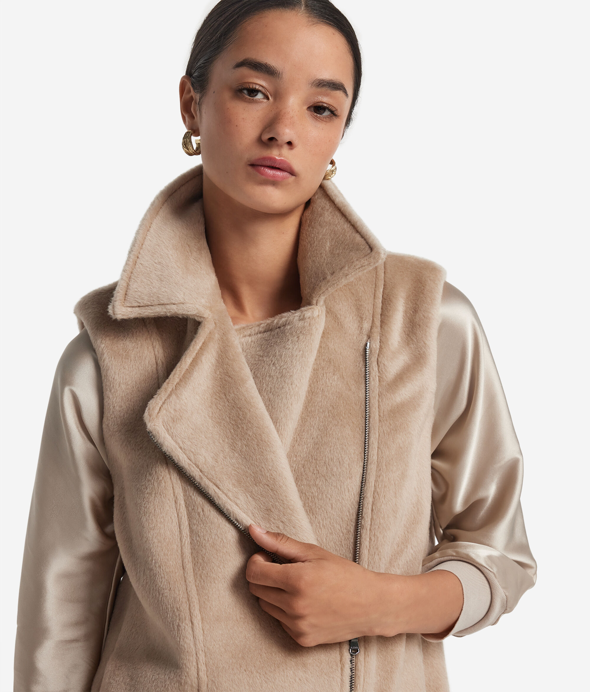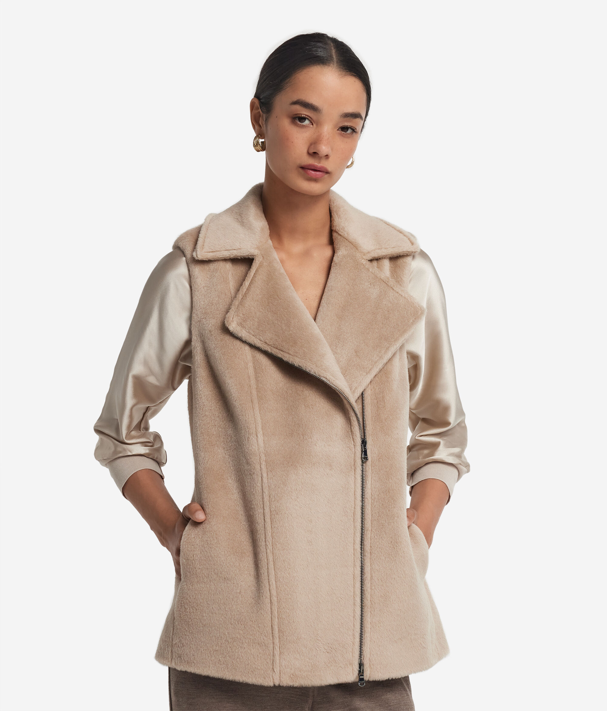 Με δυναμικό και εκλεπτυσμένο στυλ, αυτό το αμάνικο biker τζάκετ συνδυάζει χαρακτήρα και απαλότητα χάρη στο ύφασμα με γούνινο εφέ από υψηλής ποιότητας μαλλί αλπακά. Το σχέδιο εμπλουτίζεται από φαρδύ γιακά με πέτο και διαγώνιο μεταλλικό φερμουάρ, για μια τολμηρή και μοναδική πινελιά. Οι ρελιαστές τσέπες στα πλάγια διατηρούν το στυλ απλό και λειτουργικό, σε απόλυτη αρμονία με την κανονική γραμμή που εφαρμόζει ισορροπημένα χωρίς να μαρκάρει.