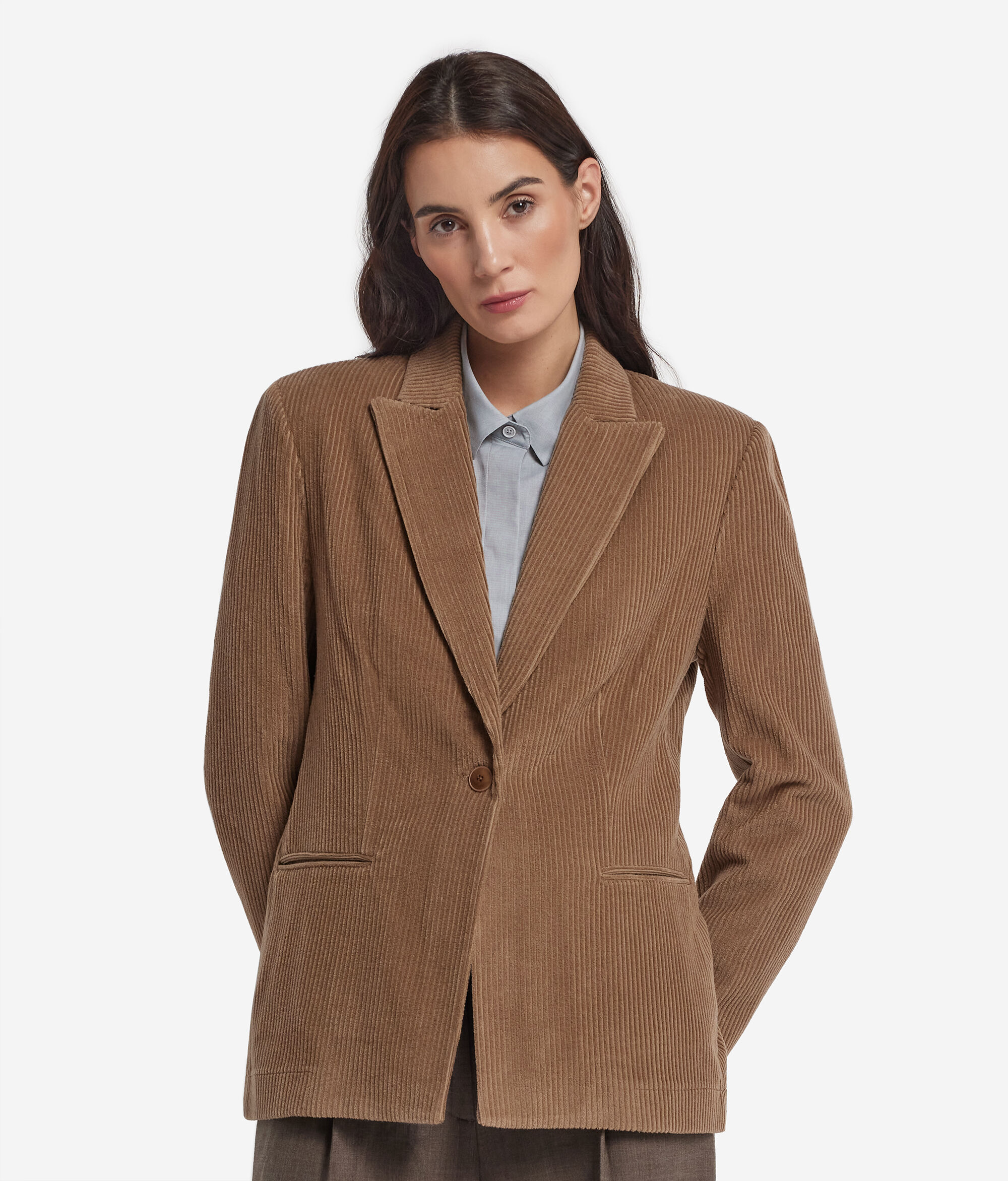 Odjevni predmet koji interpretira krojačku tradiciju sa suvremenom elegancijom. Izrađena od vunenog i kašmirskog baršuna, ova se jakna ističe mekom i blago sjajnom teksturom koja spaja toplinu i profinjenost. Klasični rever i kopčanje na jedan gumb oblikuju čistu i suvremenu siluetu, dok prošiveni džepovi dodaju elegantan i profinjen detalj.