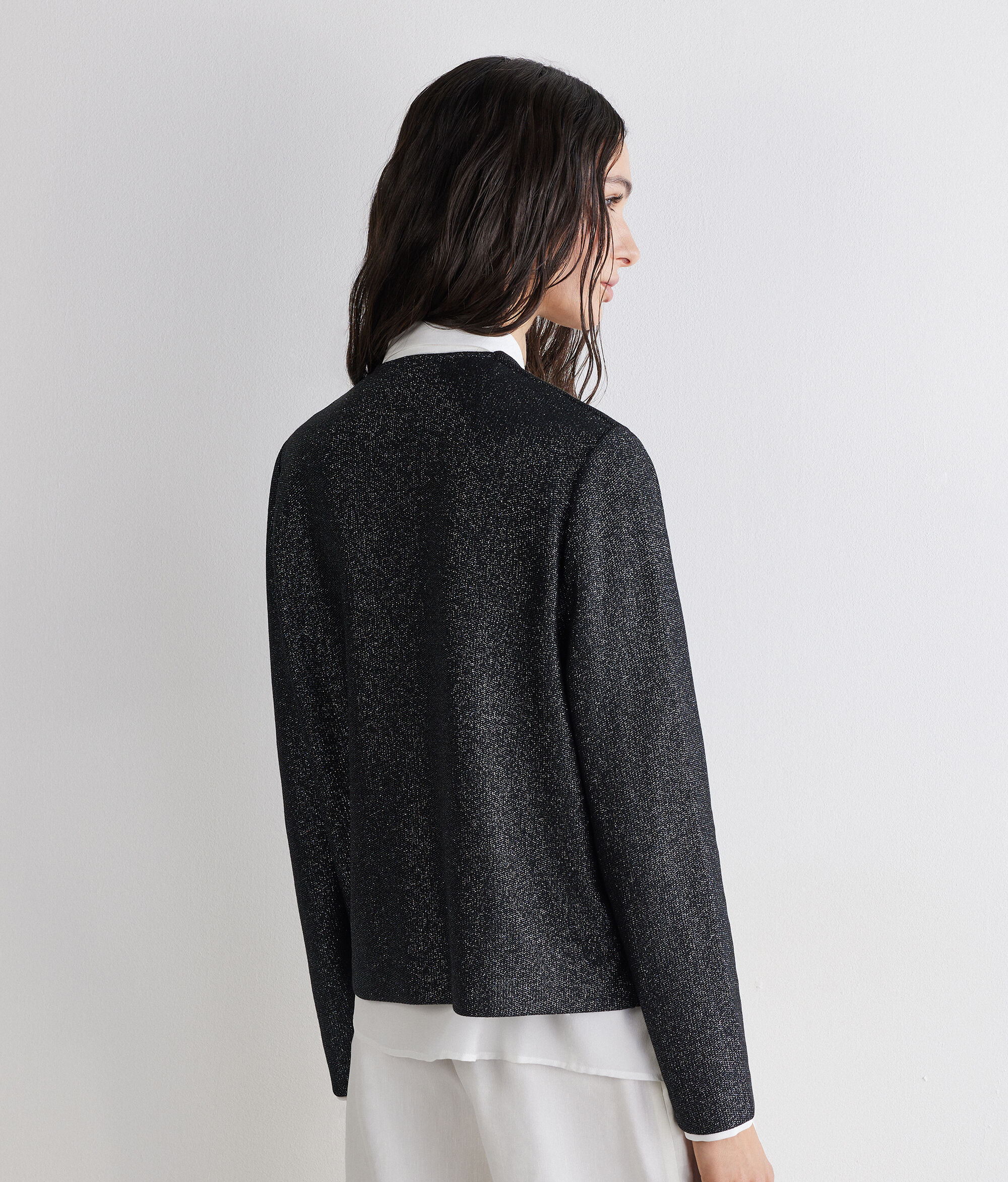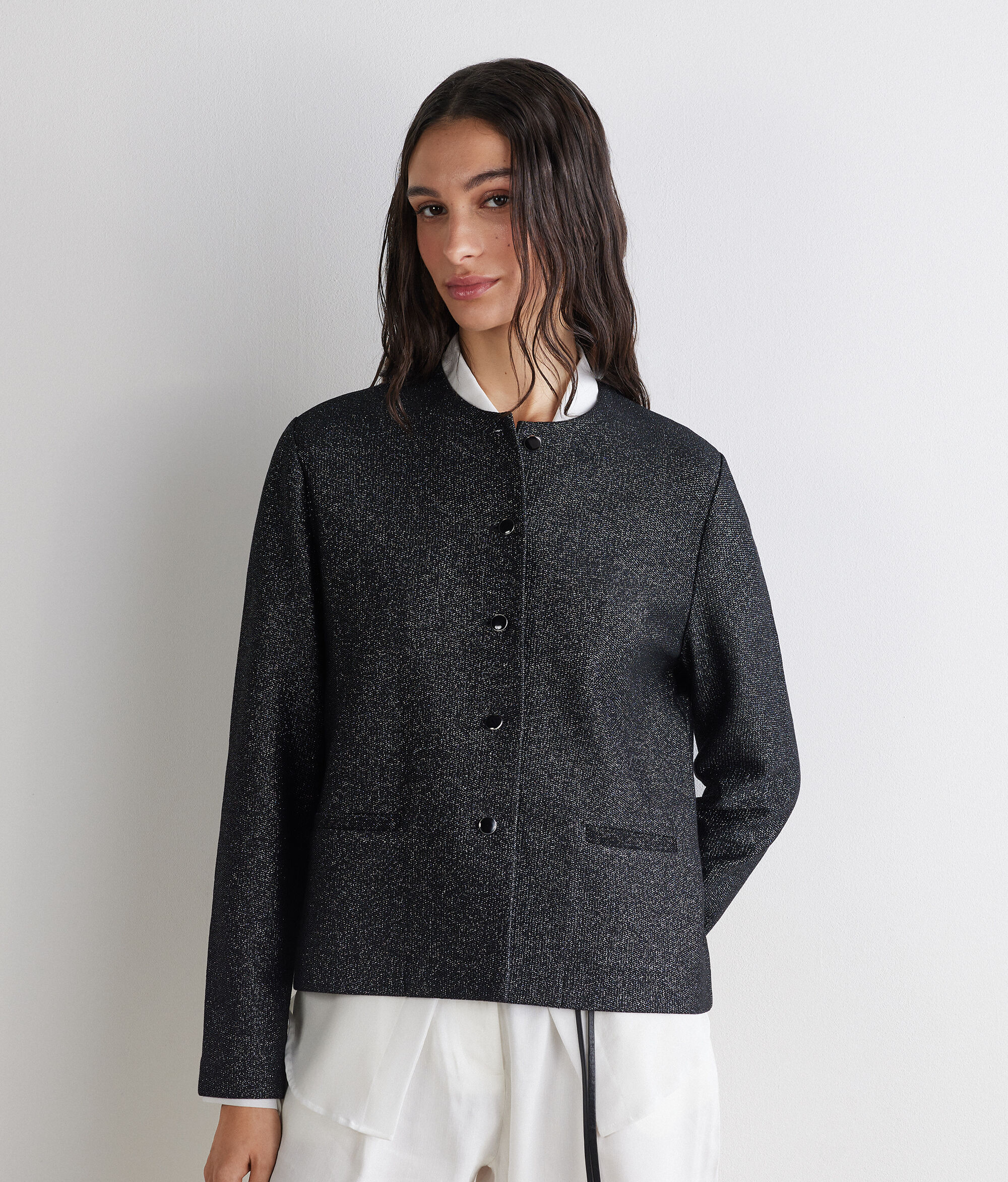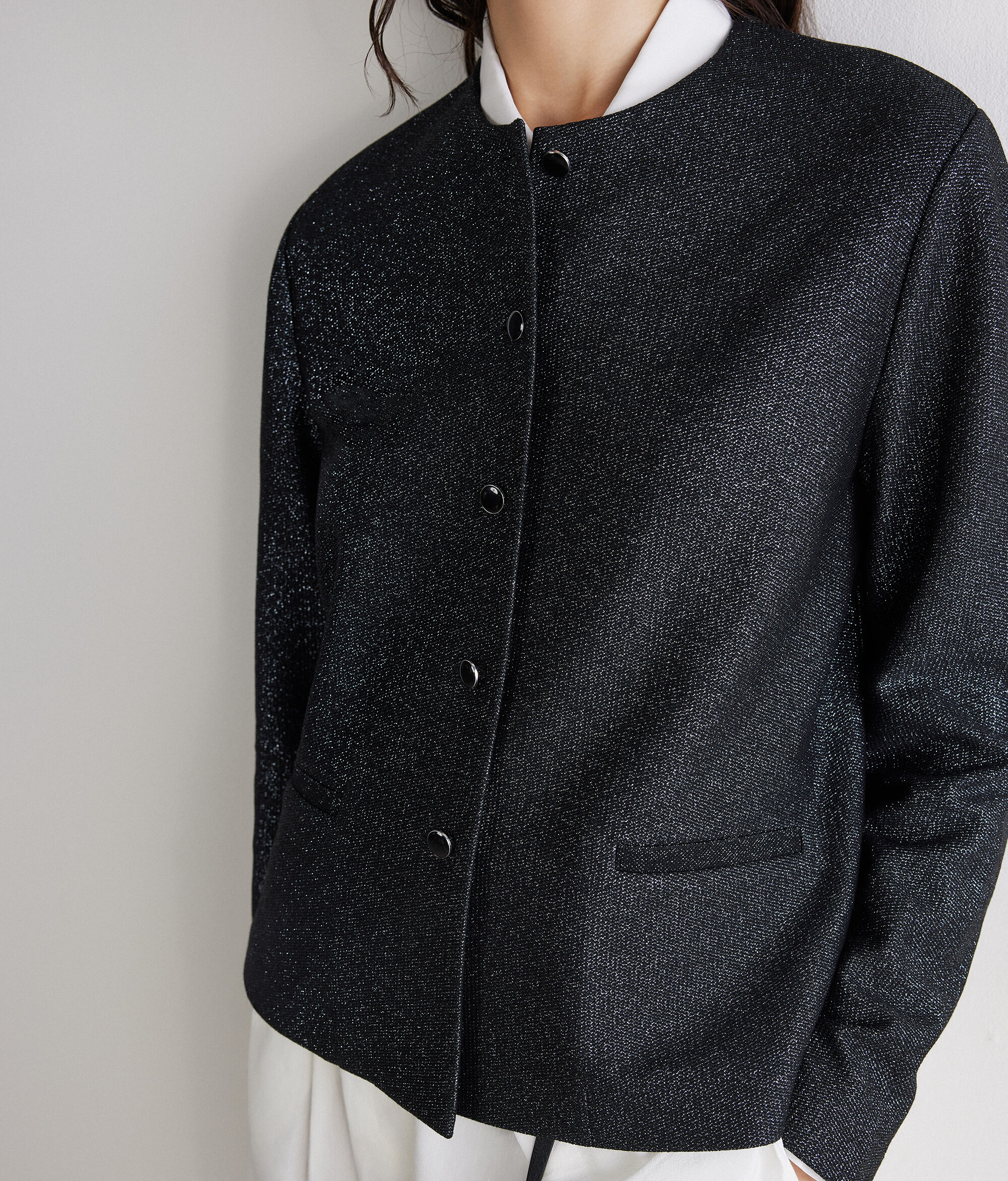 Crop sako od pamučne pletenine oplemenjen nitima laméa za profinjenu, sjajnu teksturu. Okrugli ovratnik i jednoredno kopčanje s emajliranim gumbima u tonu definiraju čiste i elegantne linije. Džepovi s rubom zadržavaju nenametljiv profil, dok crop duljina i regularni kroj stvaraju moderne, sofisticirane proporcije.