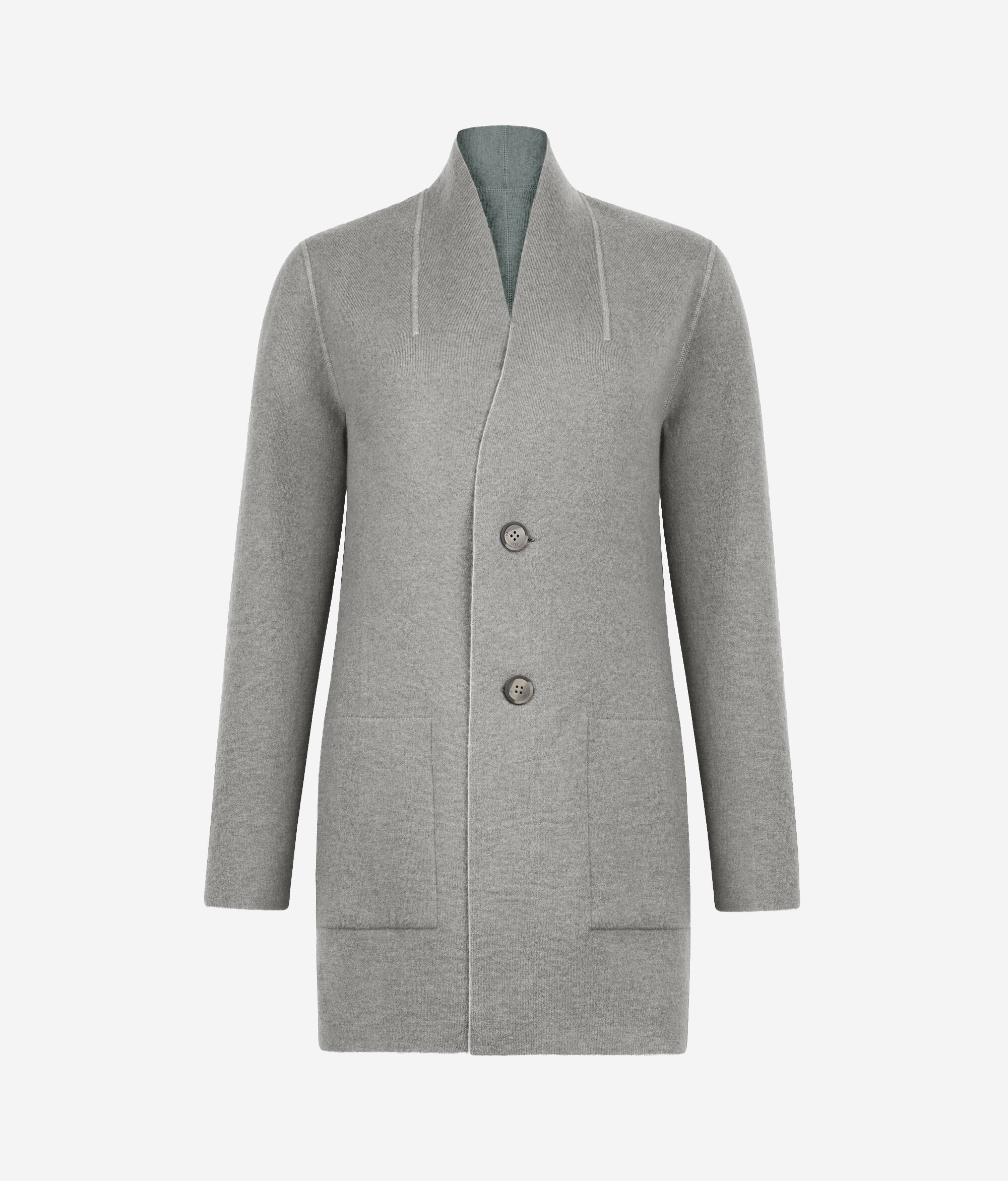 Dvostrani kaput koji spaja dva identiteta u jednom odjevnom komadu. Izrađen od ultramekog kašmira s dvoslojnom tehnikom tubularnog pletiva u dvije boje, pruža nježnost, ugodnu mekoću i profinjeni kontrast. Šal-ovratnik i kopčanje s dva gumba stvaraju elegantnu liniju, dok različiti džepovi s obje strane dodatno ističu njegovu svestranost. S klasičnim krojem, ovaj model prati sezonsku tranziciju ležernim linijama, osmišljenima za svakodnevnu eleganciju.