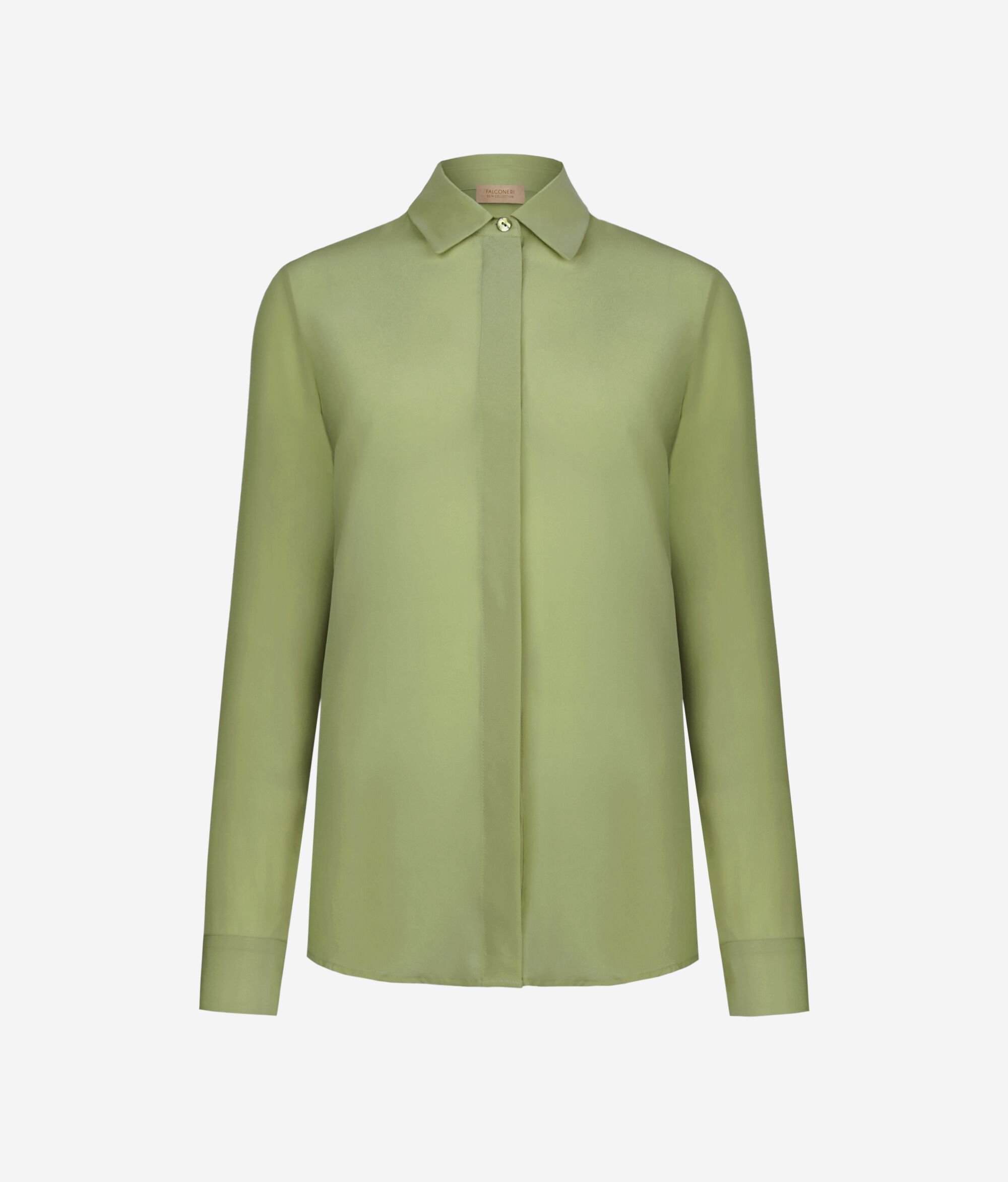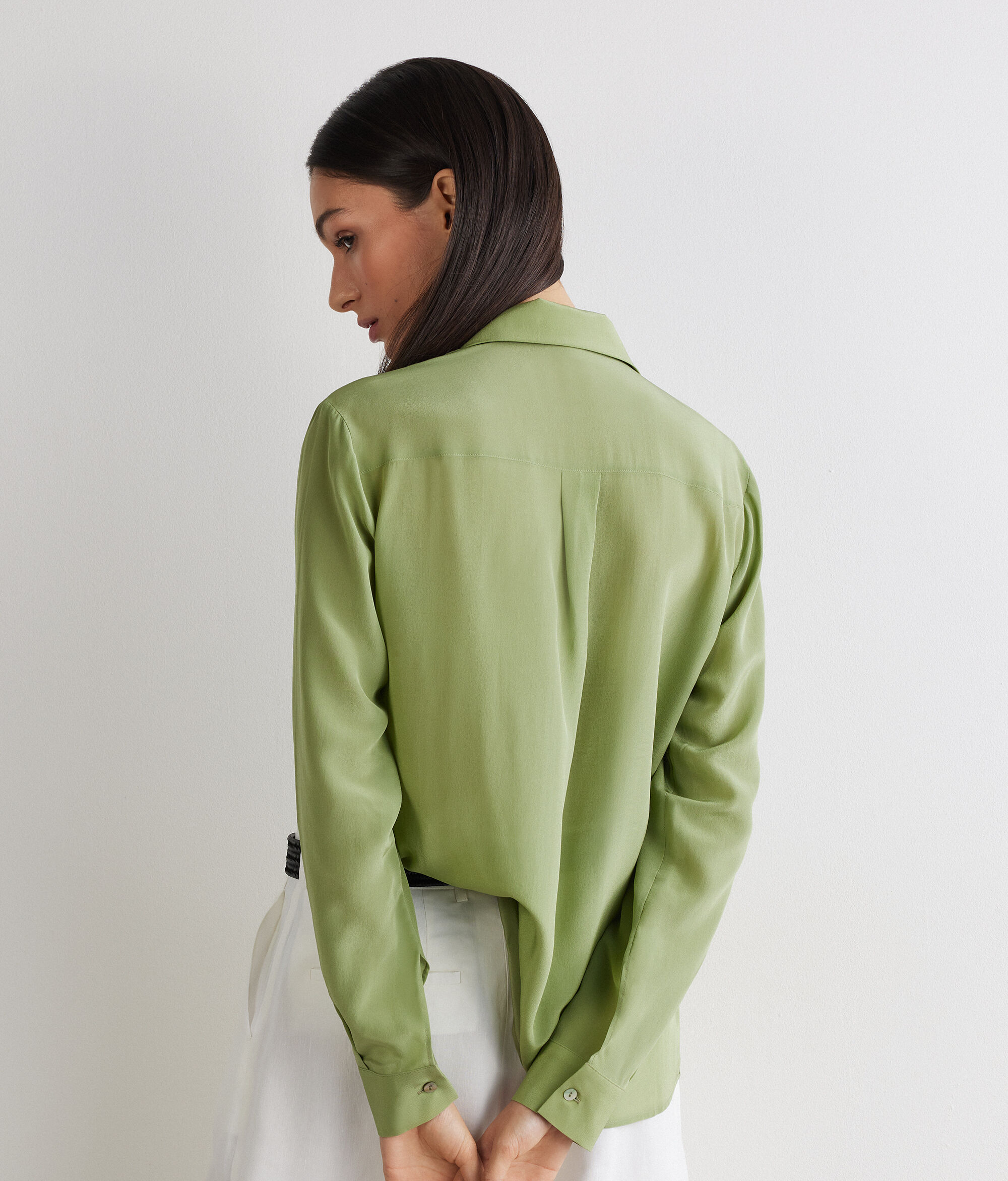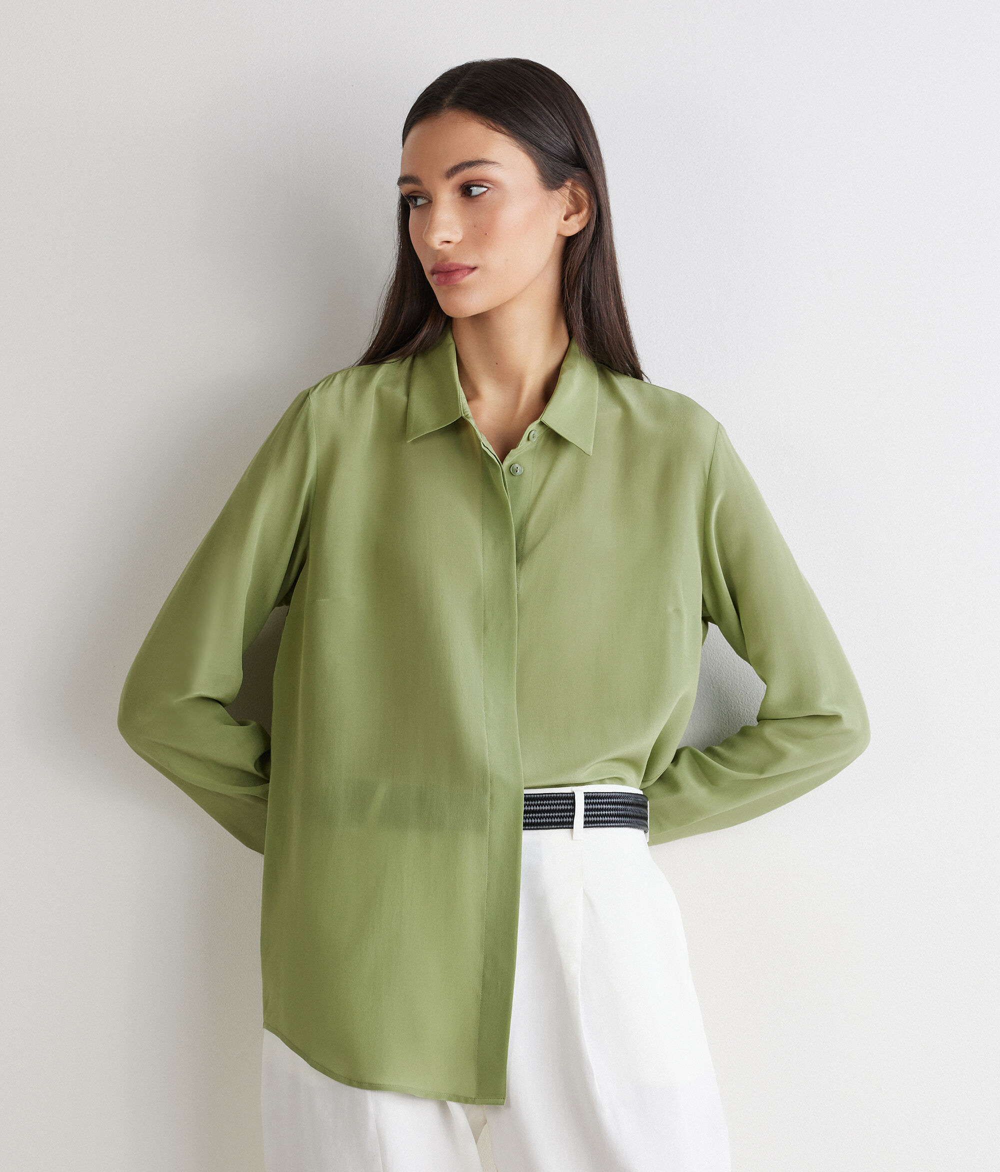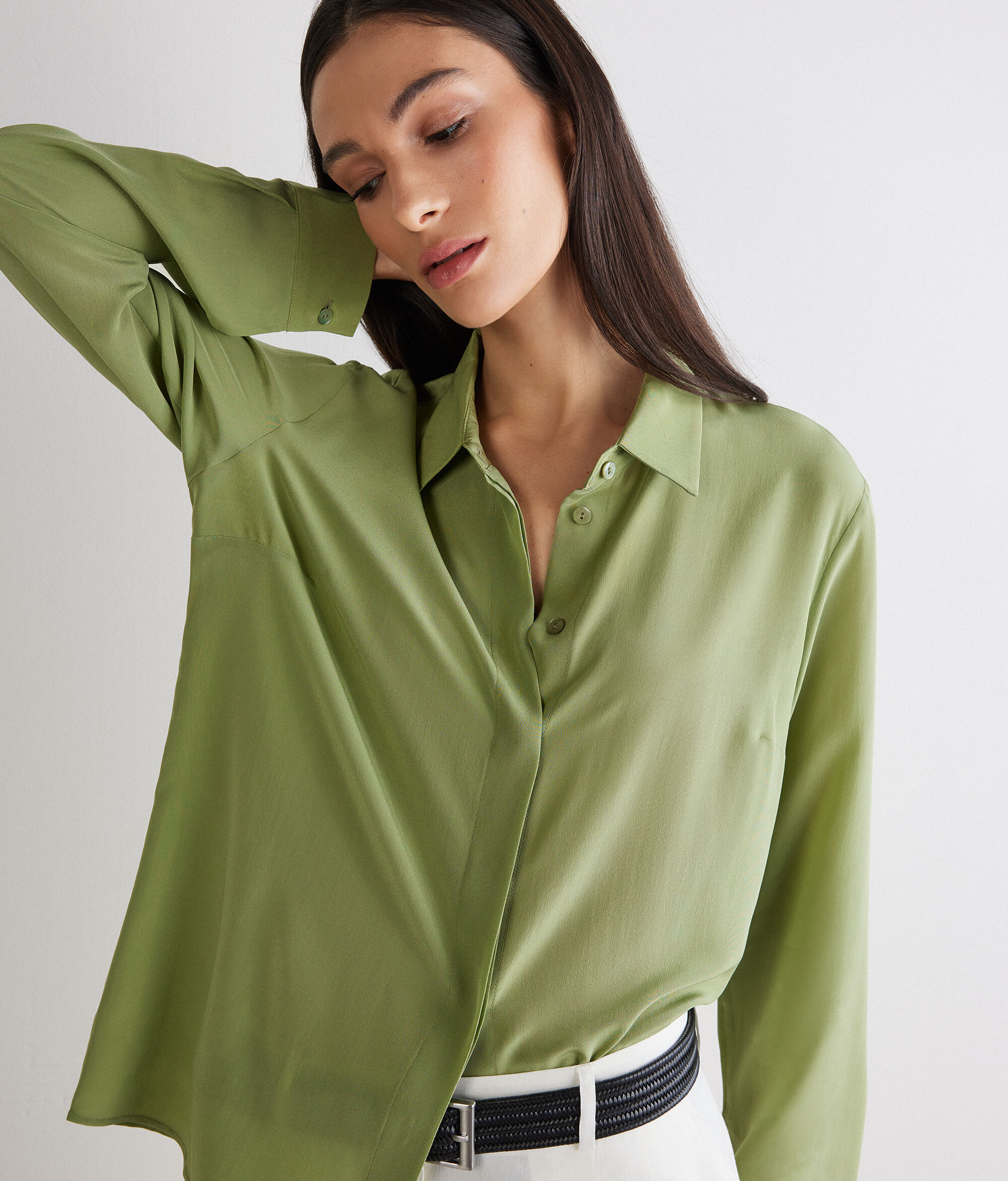 Otkrijte bezvremensku eleganciju ove košulje izrađene od tkanine krepdešin. Kroj čistih i istančanih linija obogaćen je klasičnim ovratnikom i kopčanjem gumbima. Jednostavna, ali izrazito profinjena, ne smije nedostajati u ormaru onih koji vole beskompromisnu kvalitetu i stil.
