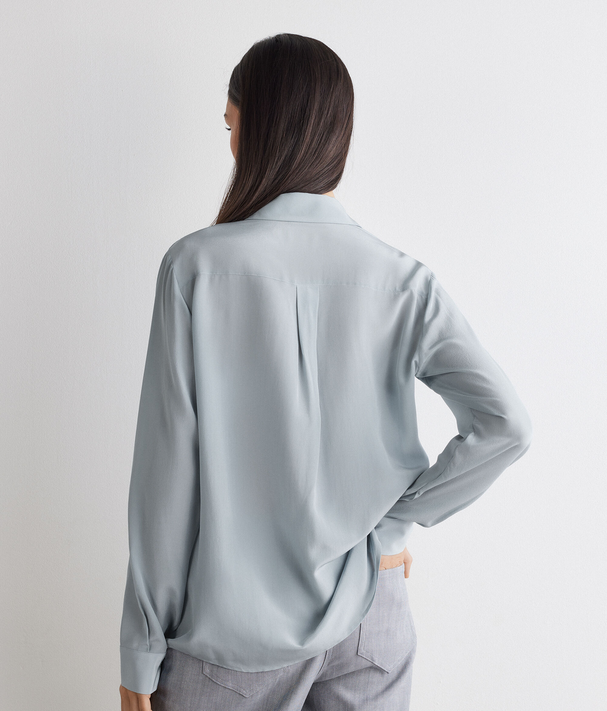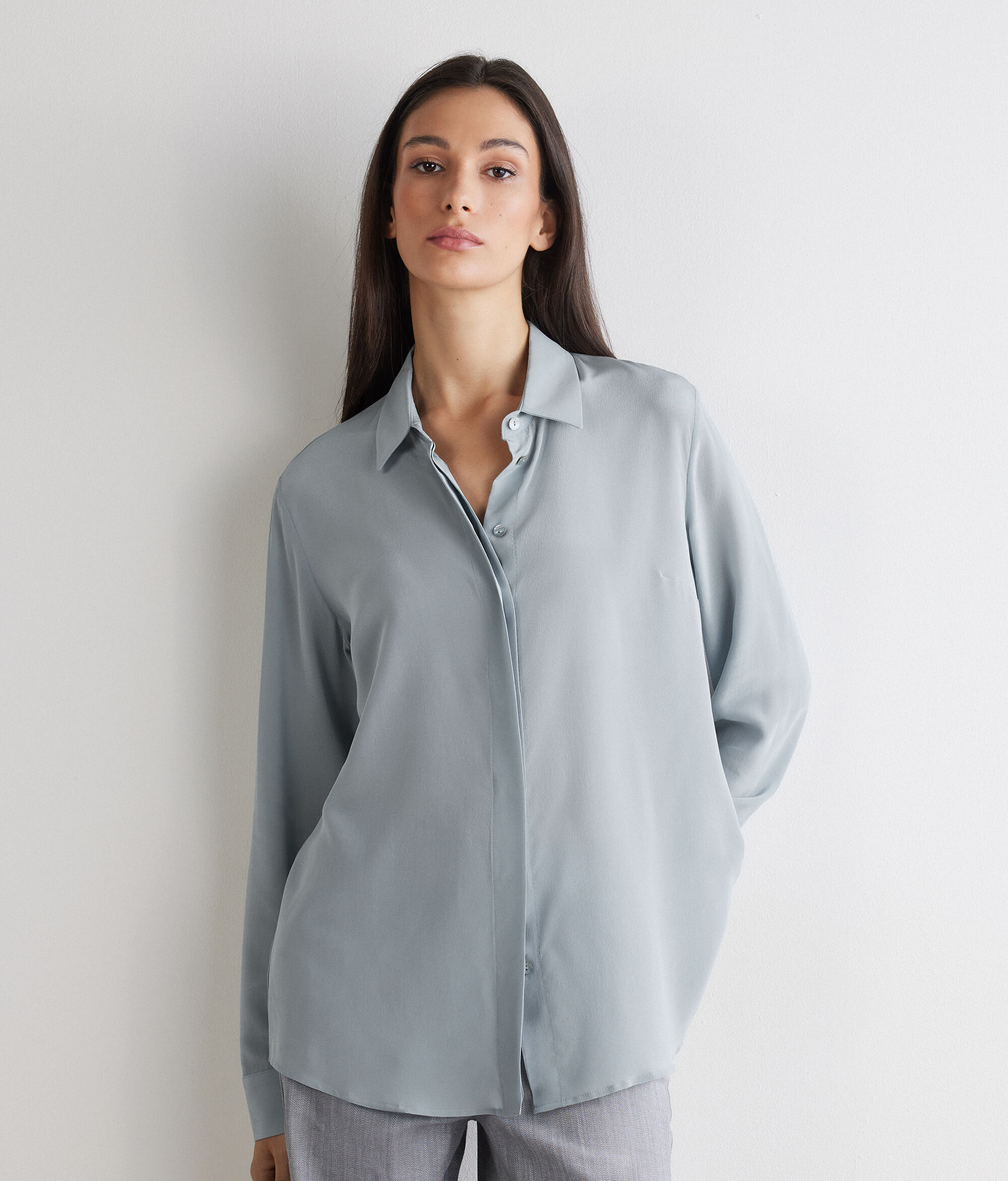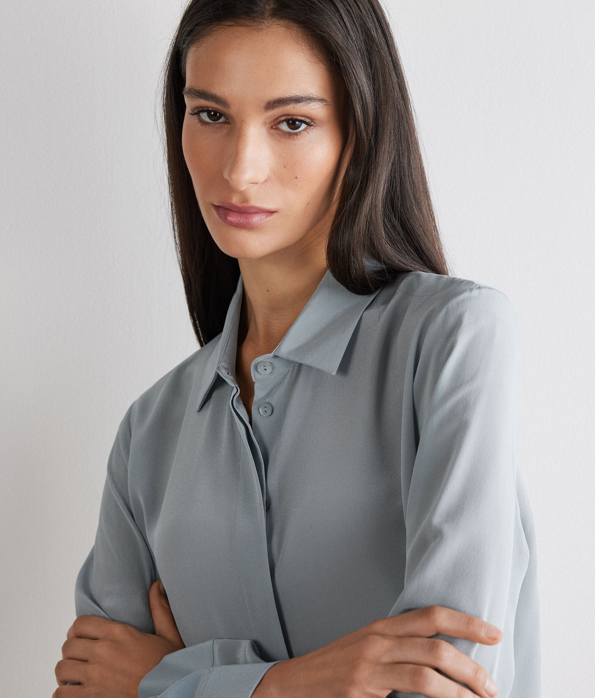 Otkrijte bezvremensku eleganciju ove košulje izrađene od tkanine krepdešin. Kroj čistih i istančanih linija obogaćen je klasičnim ovratnikom i kopčanjem gumbima. Jednostavna, ali izrazito profinjena, ne smije nedostajati u ormaru onih koji vole beskompromisnu kvalitetu i stil.