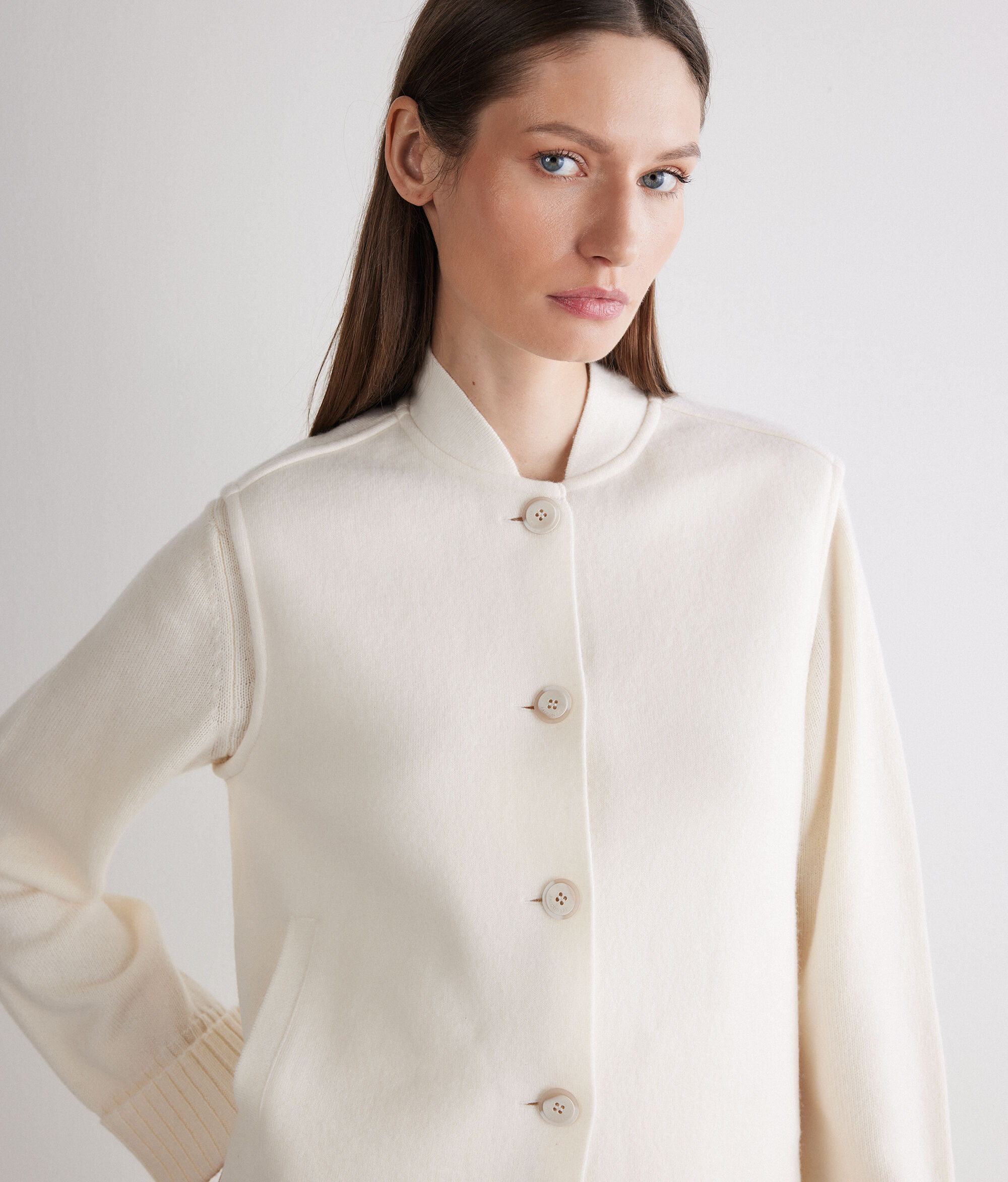 Cardigan od toplog ultramekog kašmira s kopčanjem sprijeda i profinjenim bomber ovratnikom. Izrađen tehnikom tubularnog pletiva, jamči kompaktnu, a istovremeno mekanu strukturu na dodir. Džepovi s rubom dodaju nenametljivu praktičnost, dok završna obrada Scomar na području rukava, ramena i spoja ovratnika ističe vrhunsku razinu krojačke izrade.