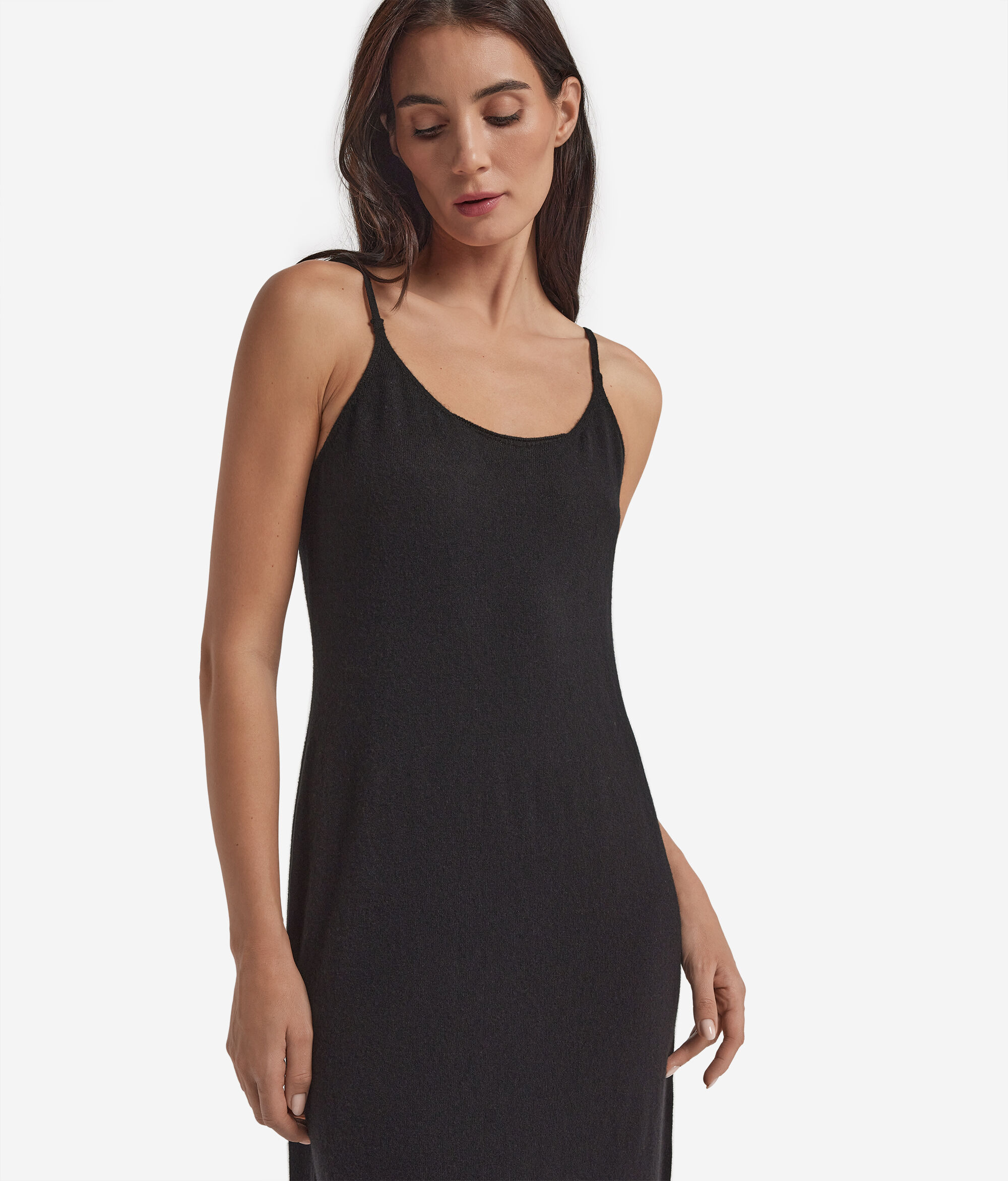 Ova spavaćica od ultramekog kašmira, jednostavna i sofisticirana, spaja mekoću i lakoću u minimalističkoj silueti. Okrugli izrez sprijeda susreće se s dubokim otvorom straga, dok tanke podesive naramenice omogućuju nježno prilagođavanje kroja. Rebrasti porub dodaje profinjenost, dok dužina do listova zaokružuje dizajn osmišljen da s elegancijom prati i svakodnevne trenutke i posebne prigode.
