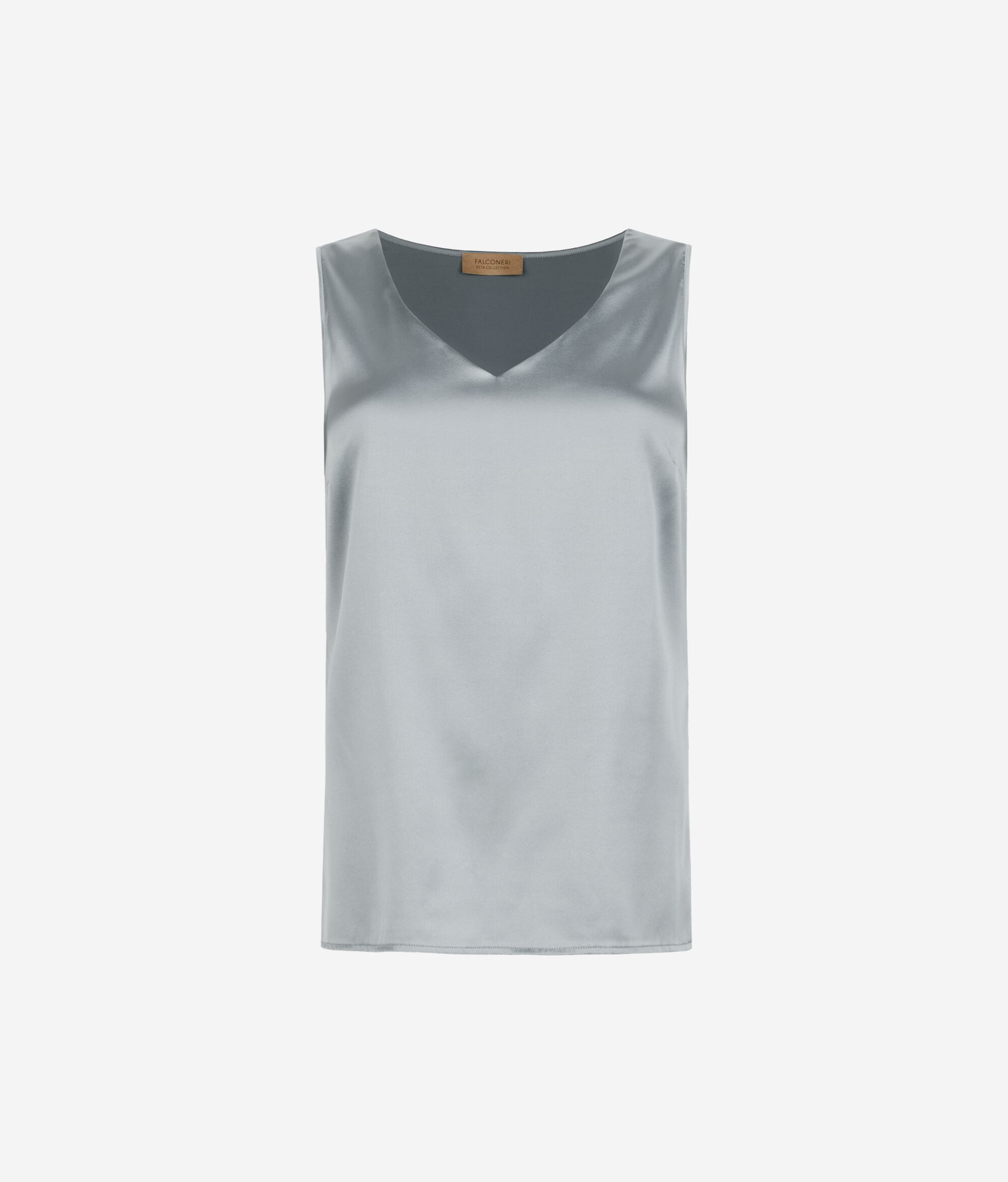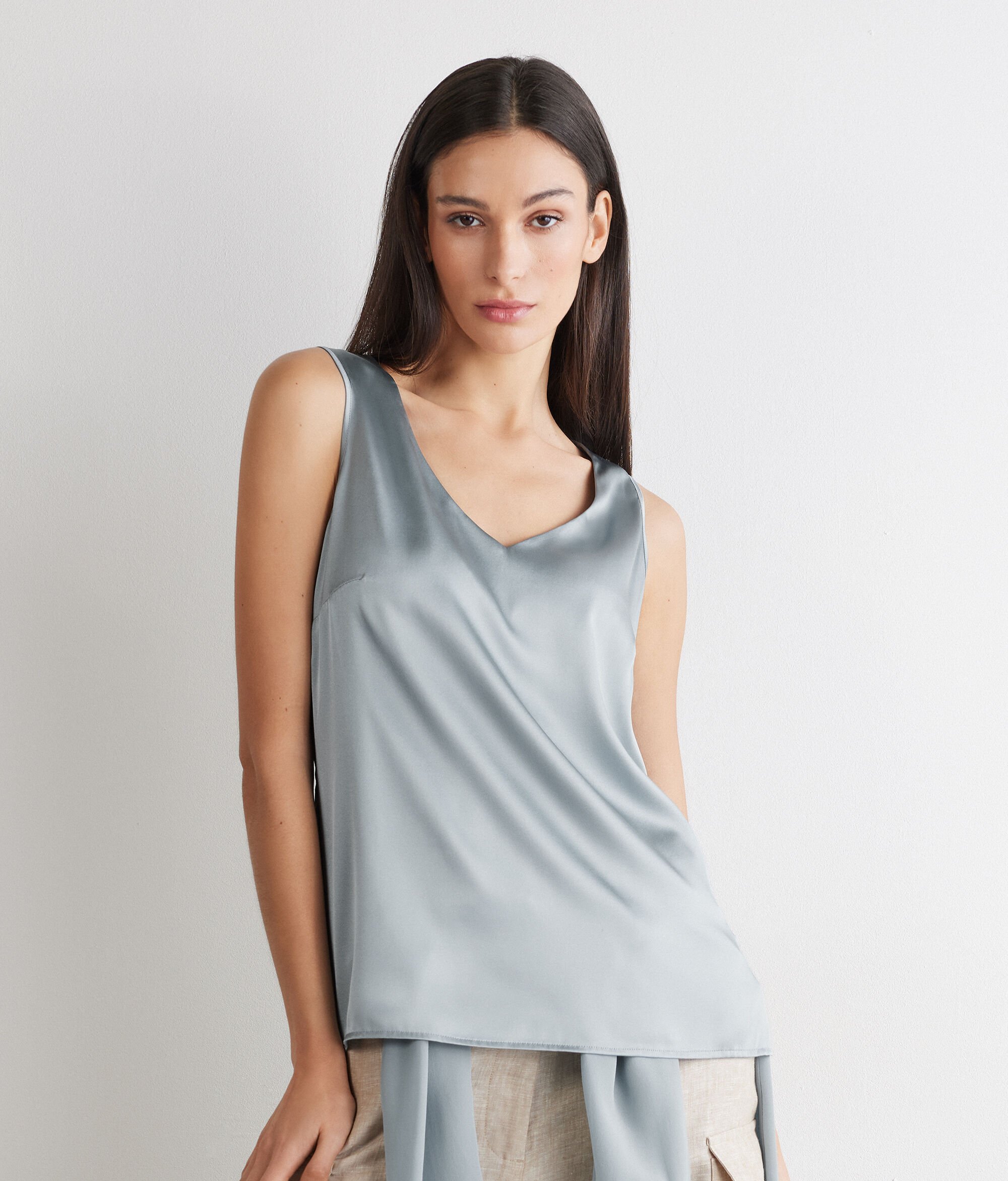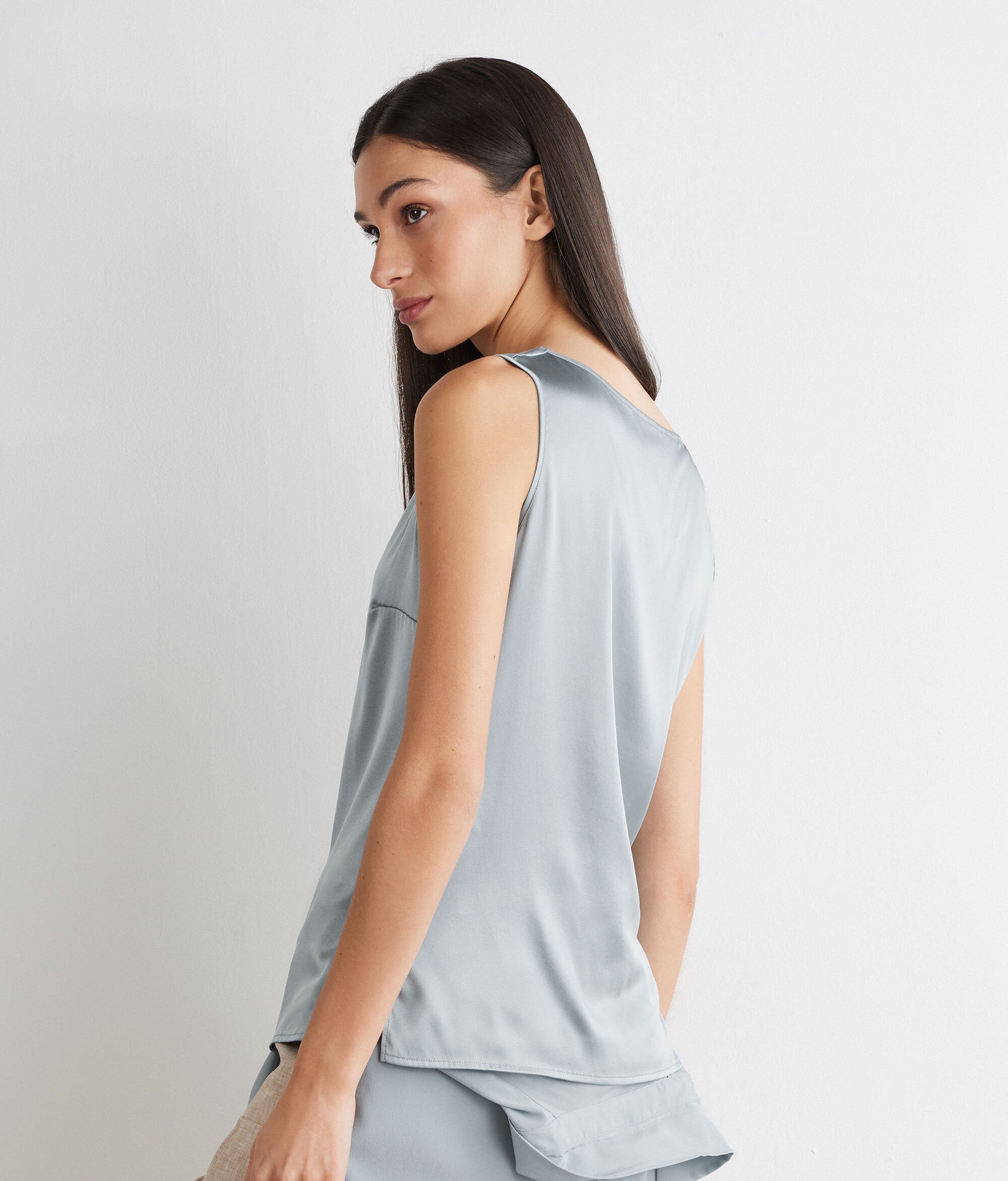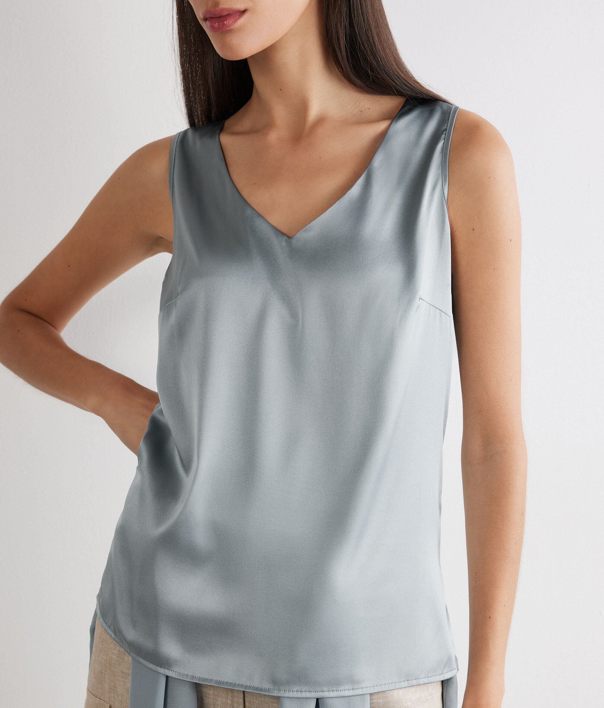 Sjajna i fluidna tekstura uljepšava meke linije ovog gornjeg dijela od čiste svile i osvjetljava boje satenske pređe pojačavajući njen sjaj. Elegantan, široki izrez u obliku srca usklađuje volumene i duljine te oblikuje ženstvenu ponudu koja upotpunjuje najsofisticiranije izglede.