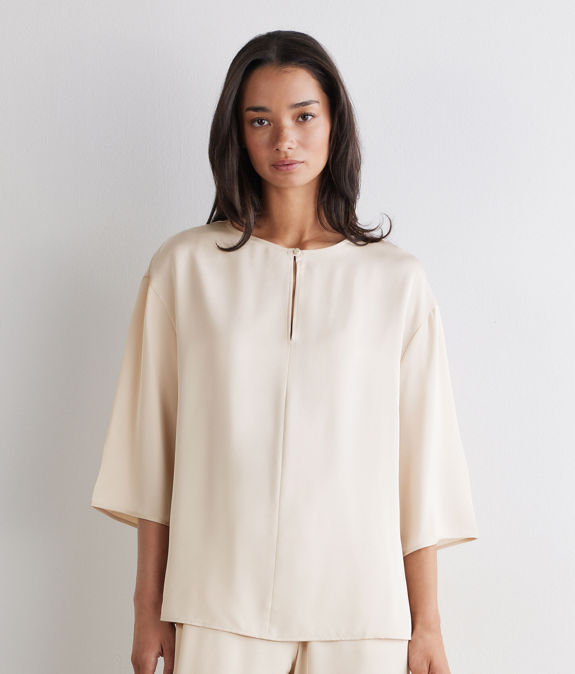 Crafted in matte silk satin, this blouse combines femininity and lightness in a timeless design. The crew neck with teardrop opening and metal button at the front add a refined detail, while the relaxed fit ensures a fluid and natural line.