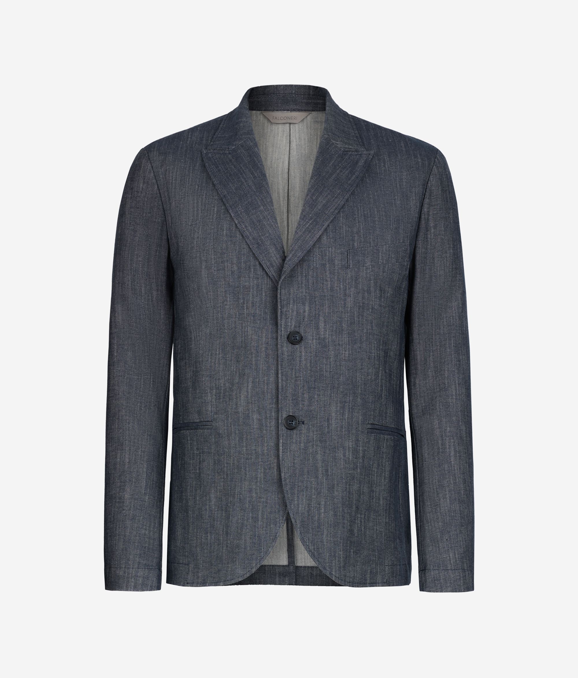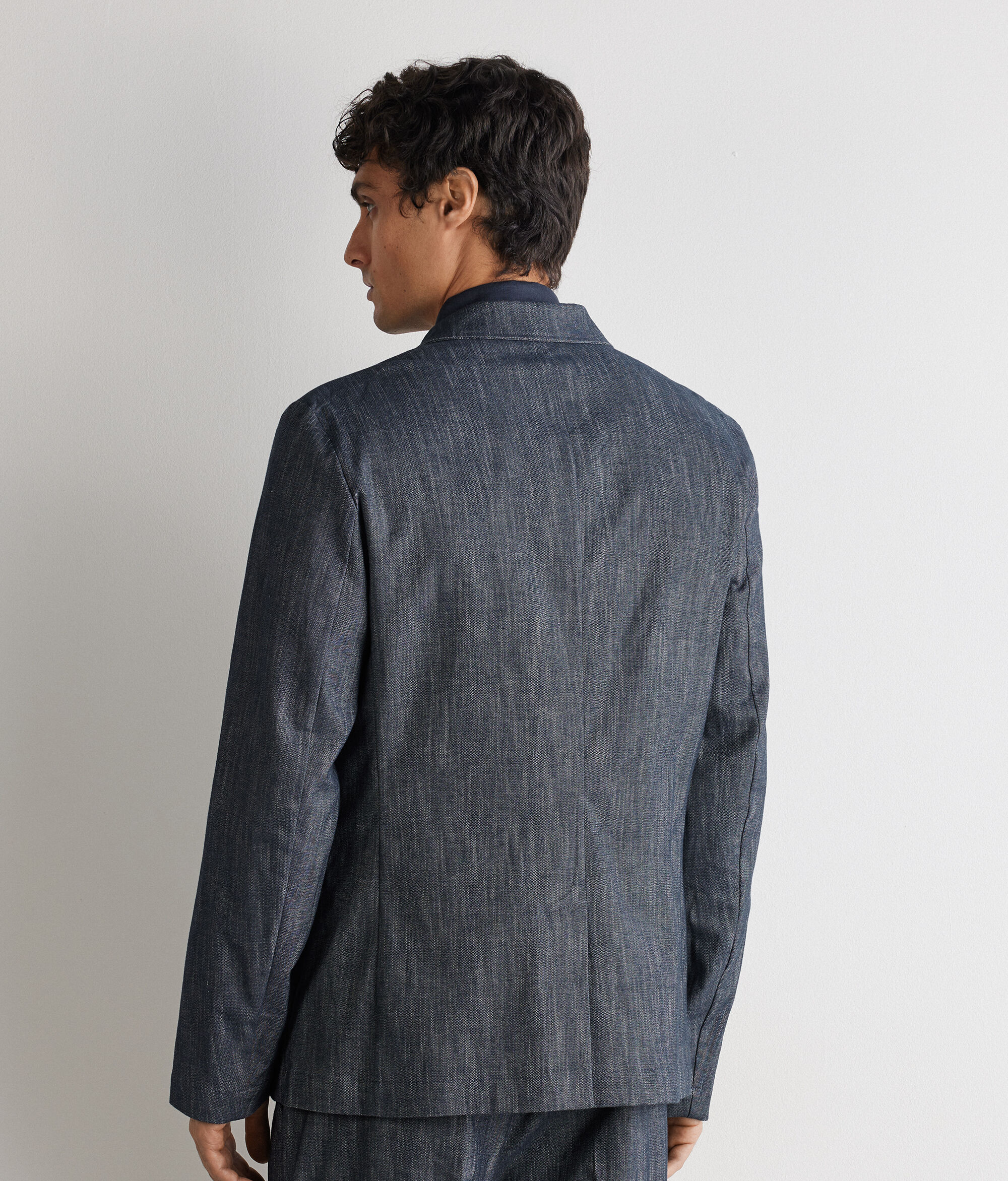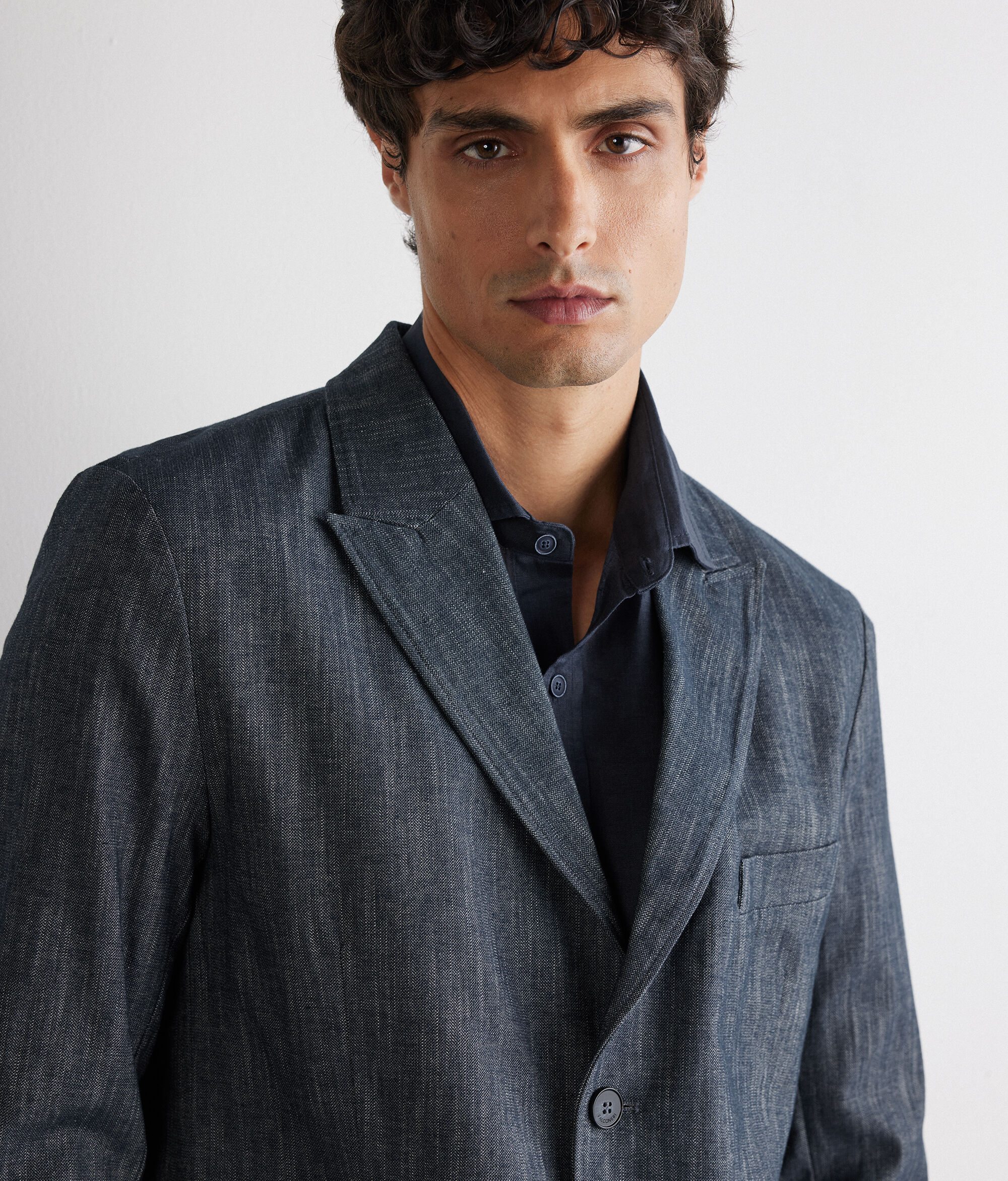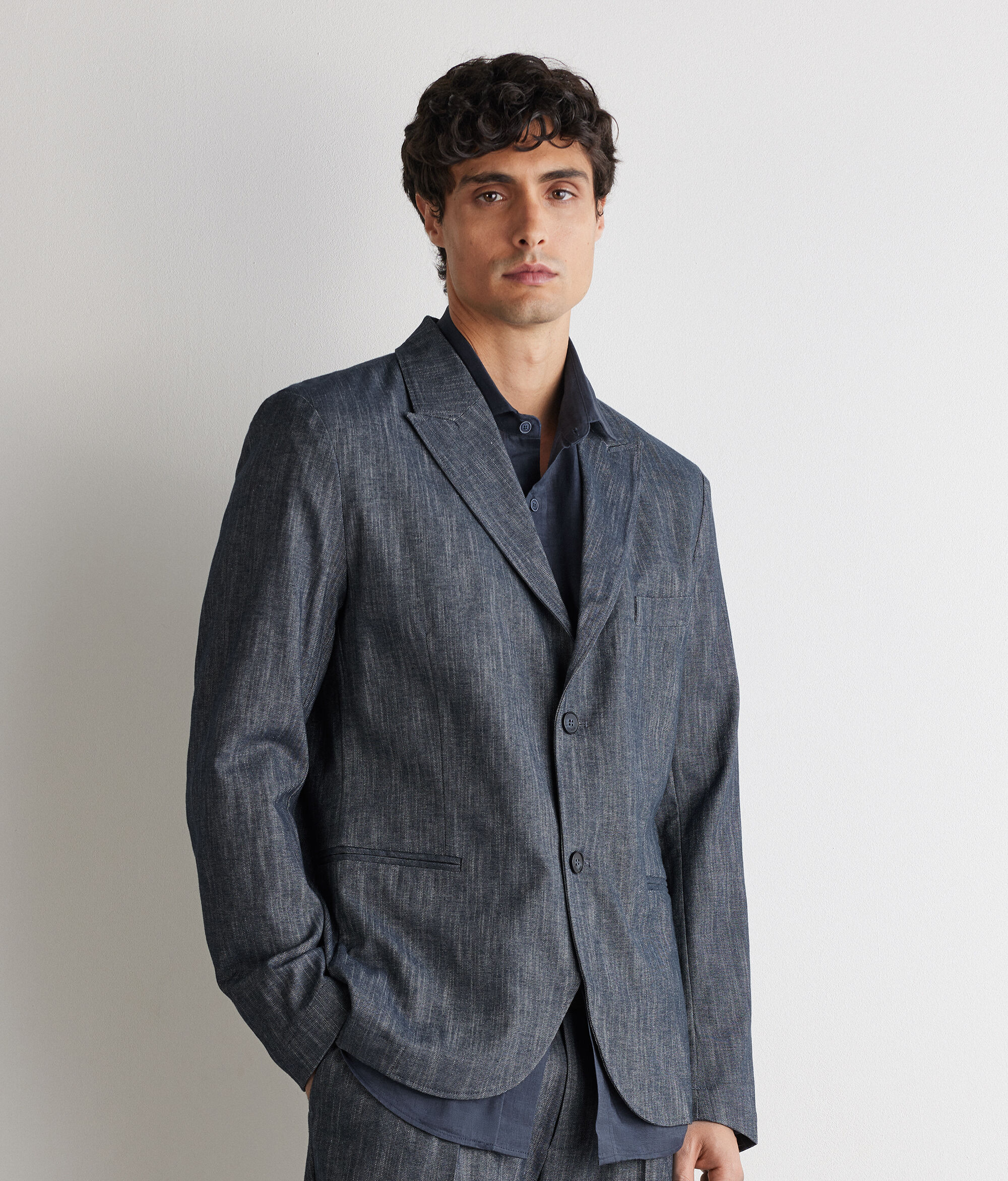 Jacket with a sophisticated, casual mood, with an elegant denim effect that enhances the fabric’s texture. The stitched peak lapel defines a refined and contemporary line, while the single-breasted two-button closure adds a formal detail. Double welt pockets and a slit on the back complete the design with discreet sophistication. The regular fit embodies a modern, versatile elegance.