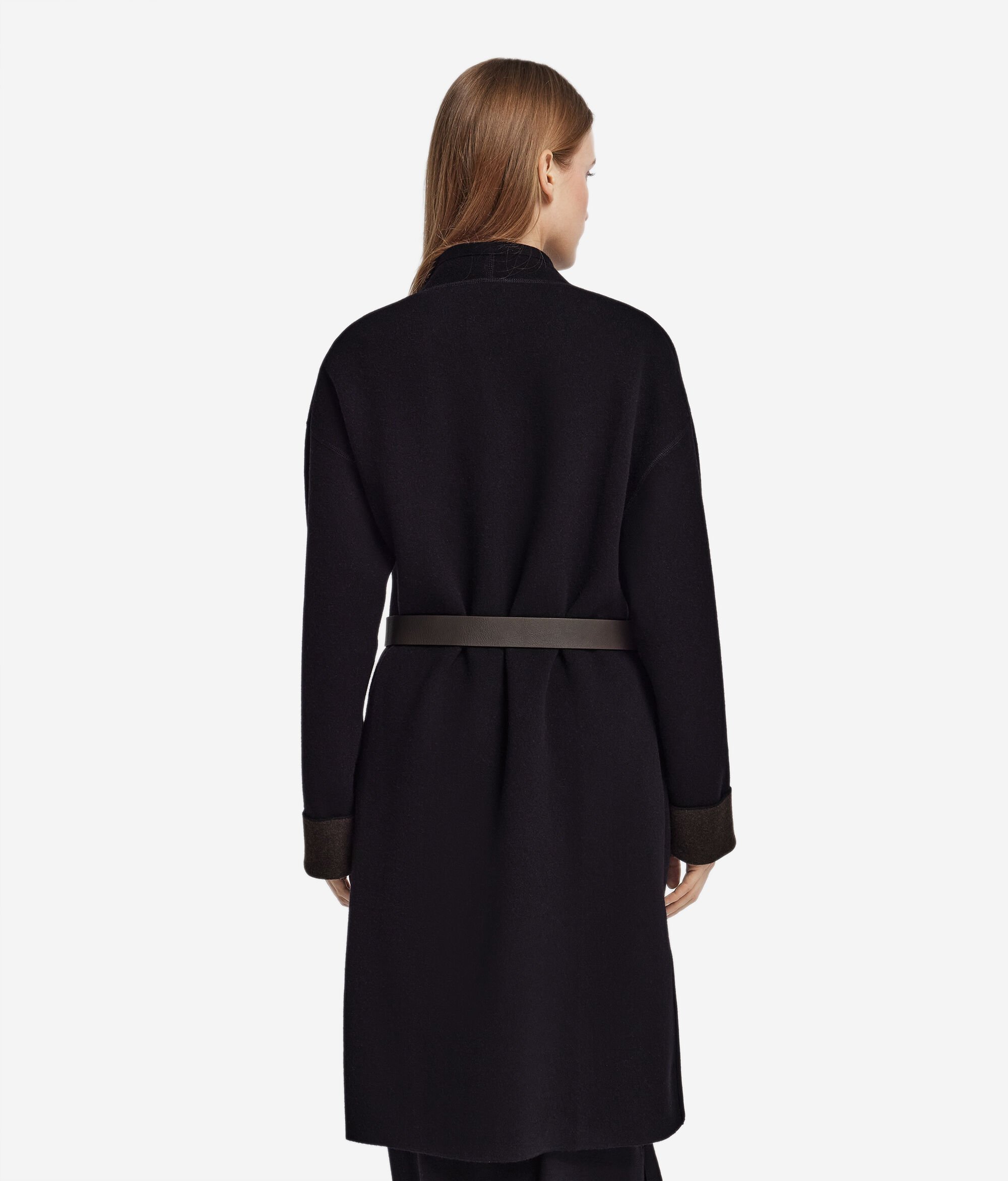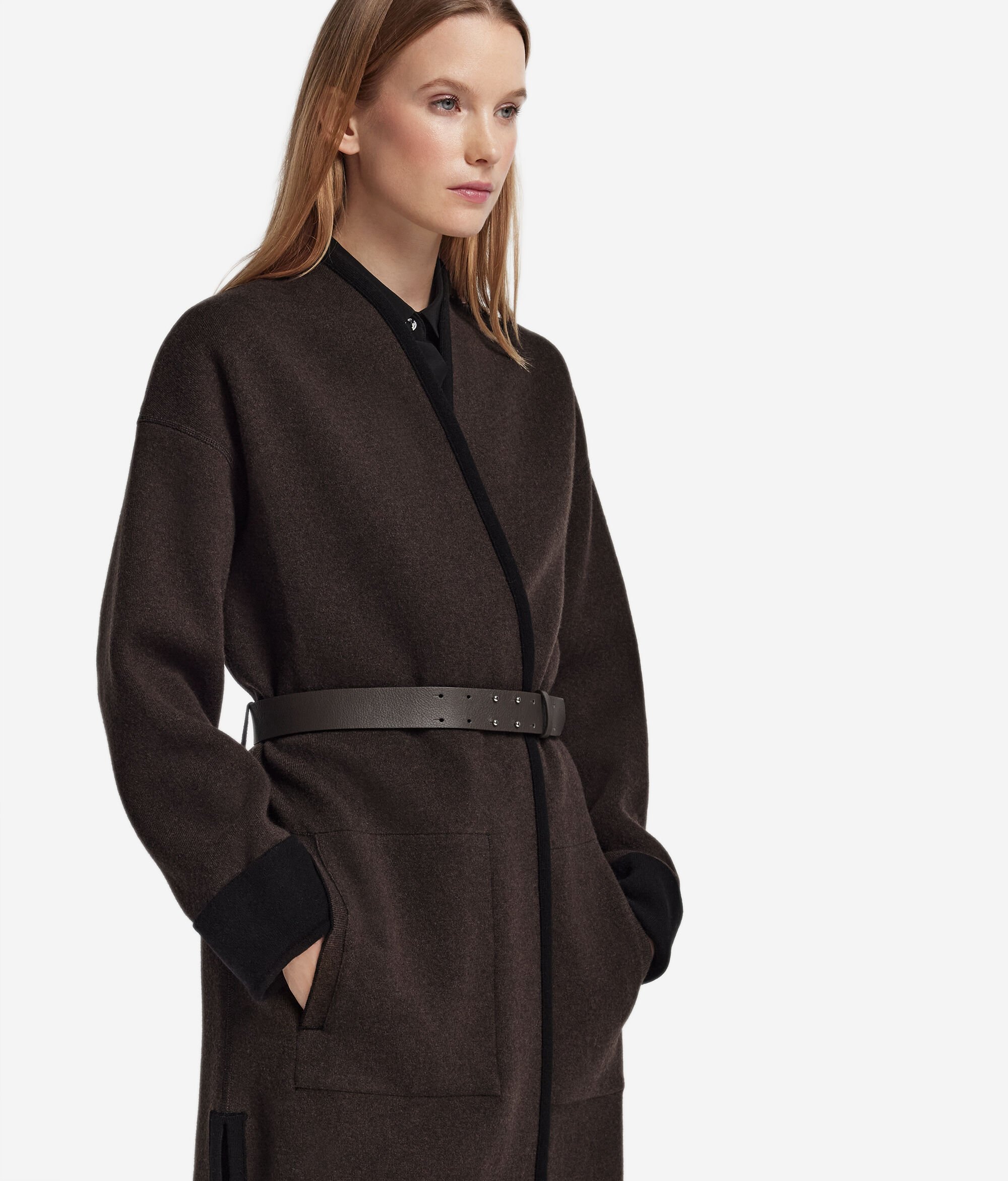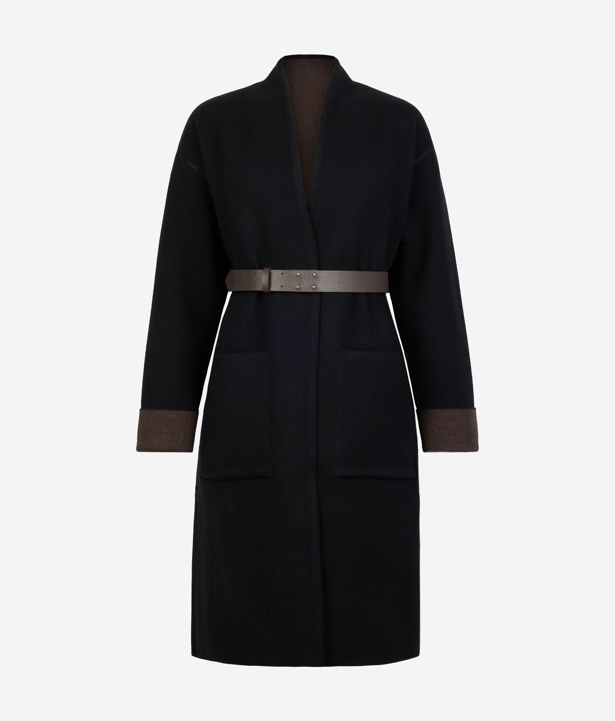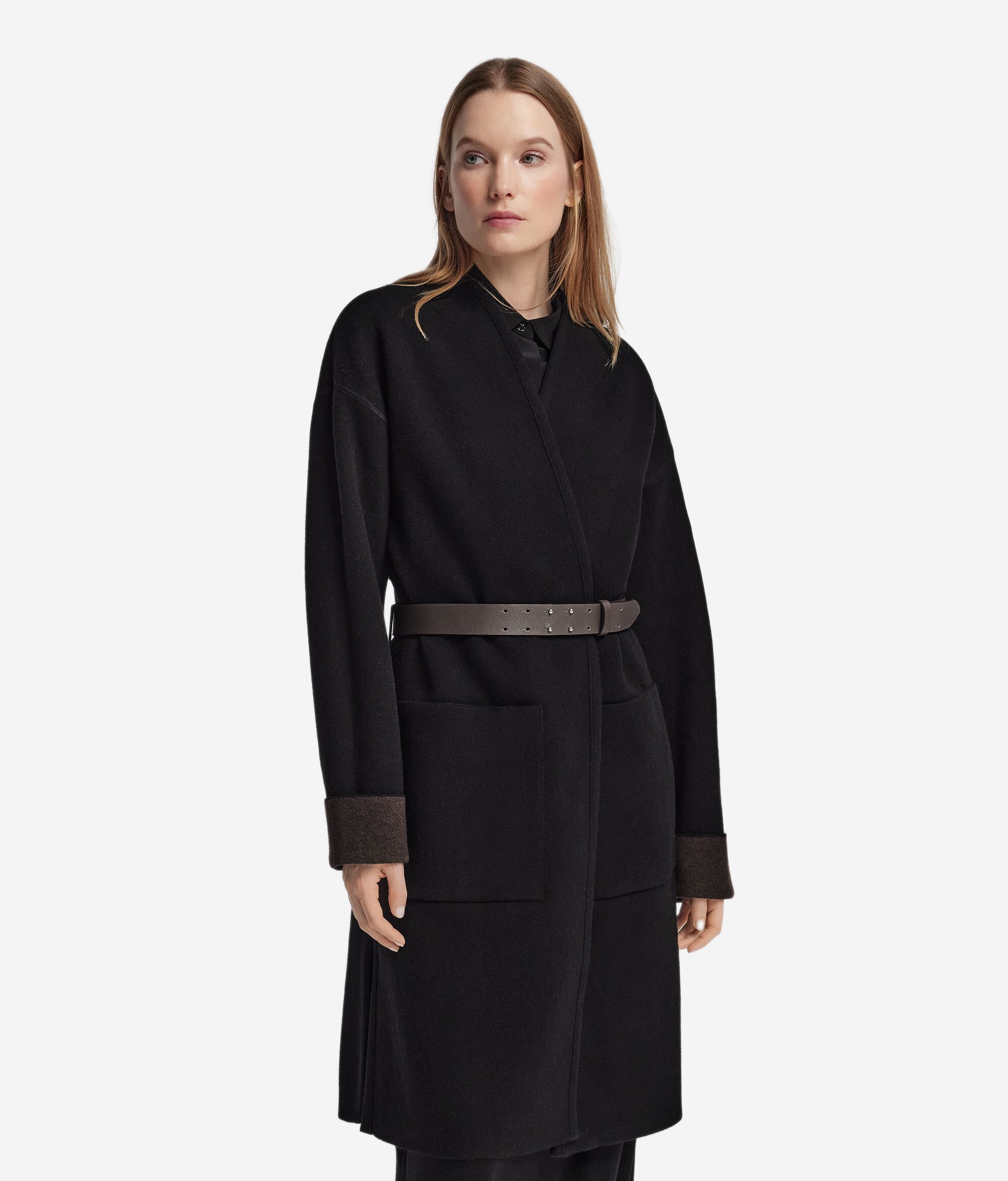 This double-face coat interprets an elegant and refined style, while highlighting the sartorial finishes through the use of pure cashmere and enhances its shape with the addition of a leather waist belt.