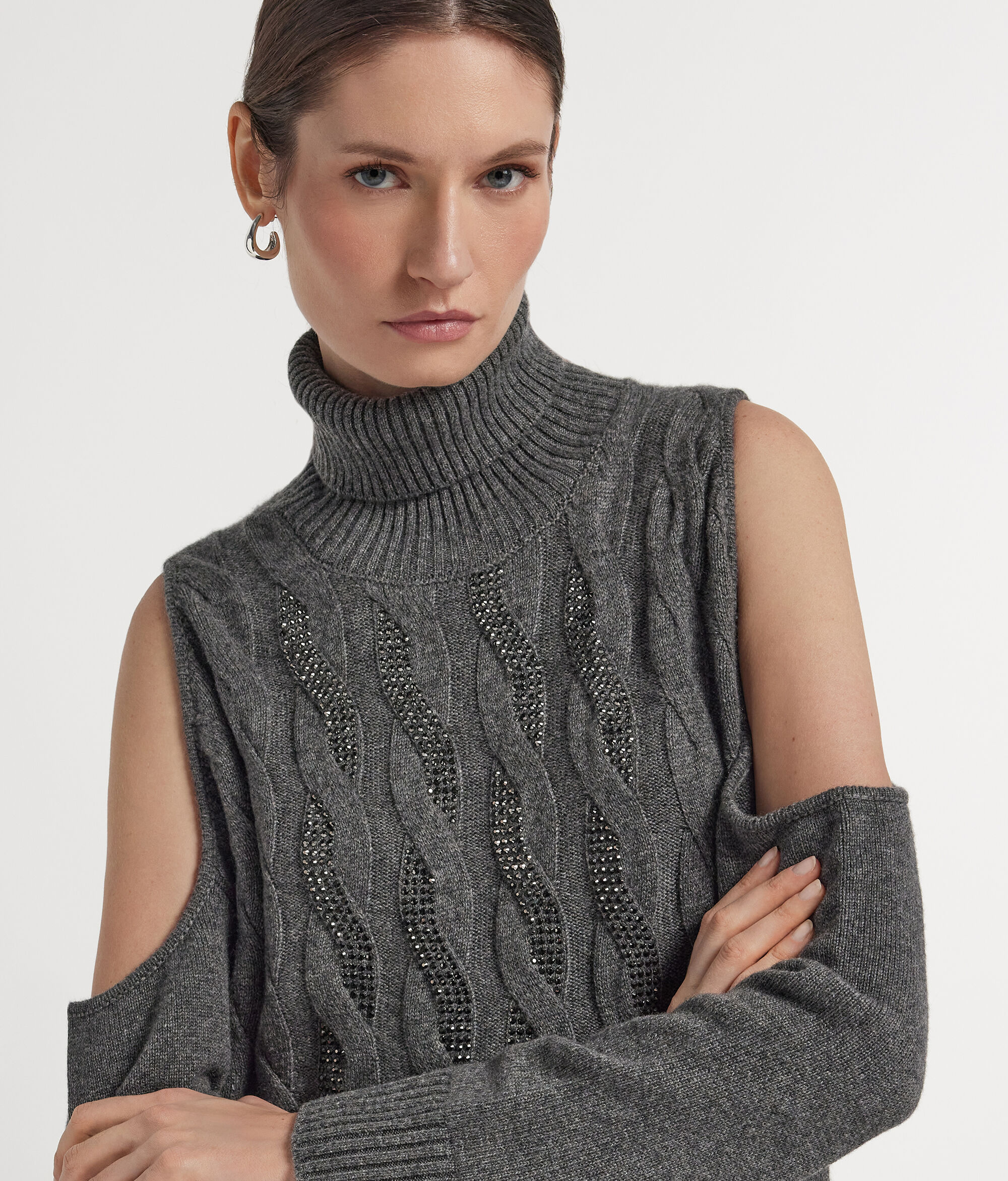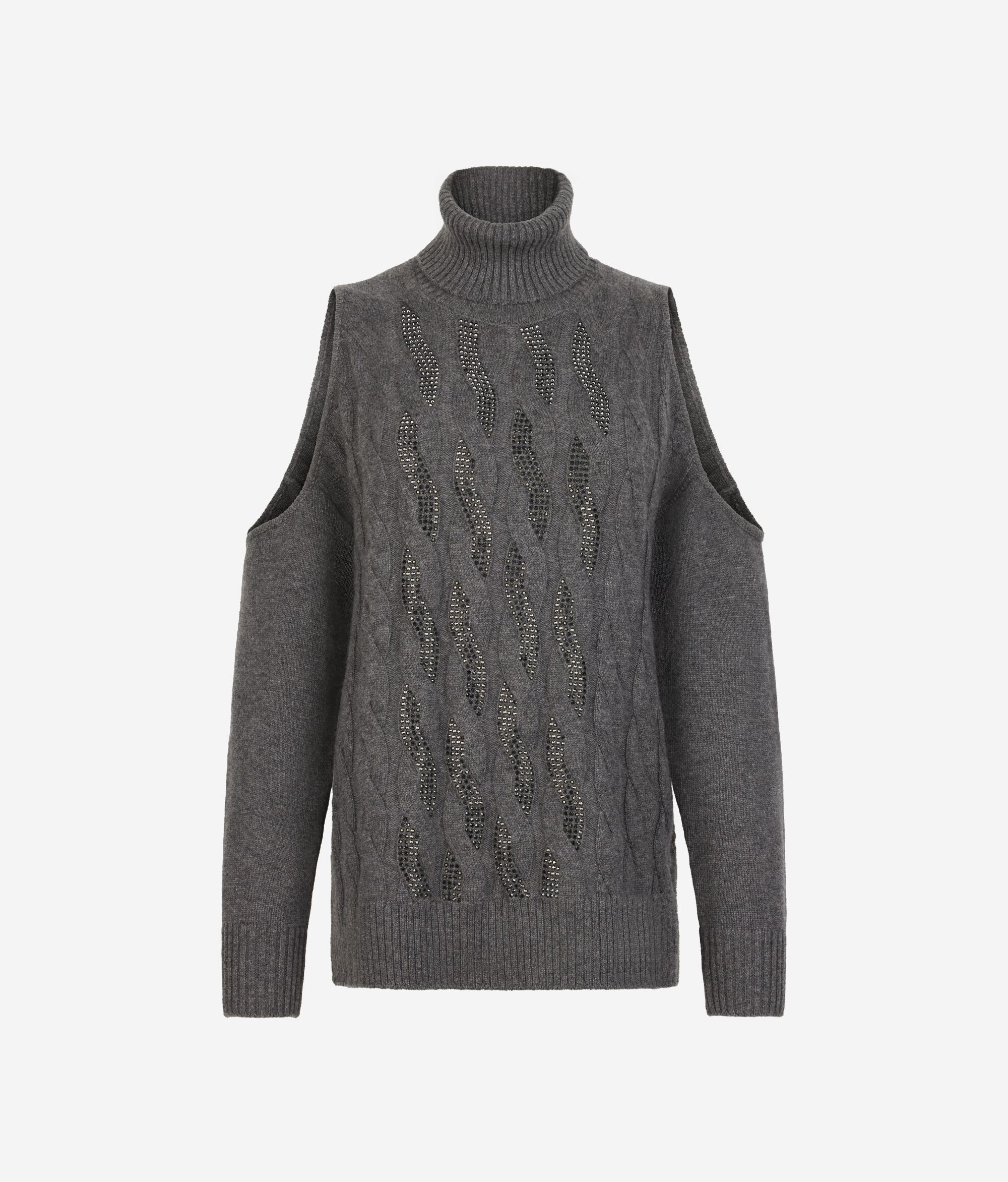 Ez az Ultrasoft kasmír pulóver a couture részletek és a nem mindennapi puhaság ötvözete, a casual-chic összeállítások természetesen elegáns eleme. Az elülső, visszafogott strasszkövekkel díszített fonott kidolgozás kifinomult könnyedséggel varázsolja egyedivé ezt a modellt, míg a vállakon található kivágás modern és igazán nőies viseletté teszi. Kissé bő szabása maximális kényelmet garantál, bordázott szegélyei és nyakkivágása pedig elegánsan emelik ki szabásvonalait.