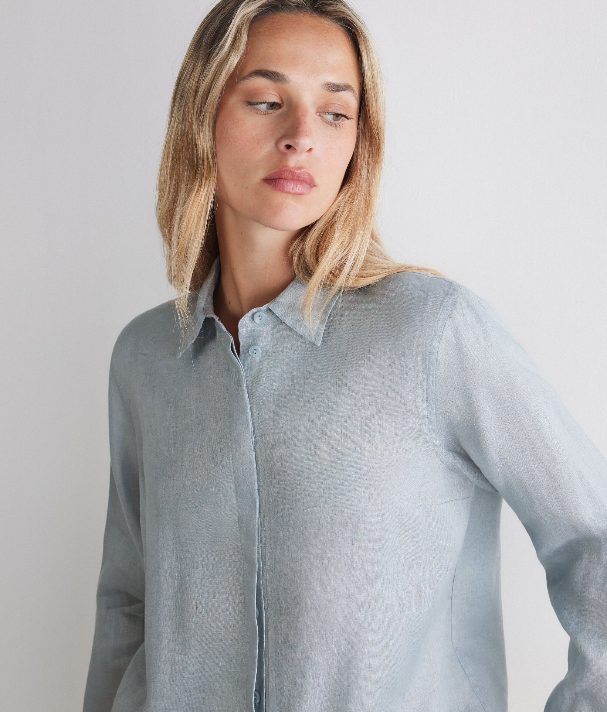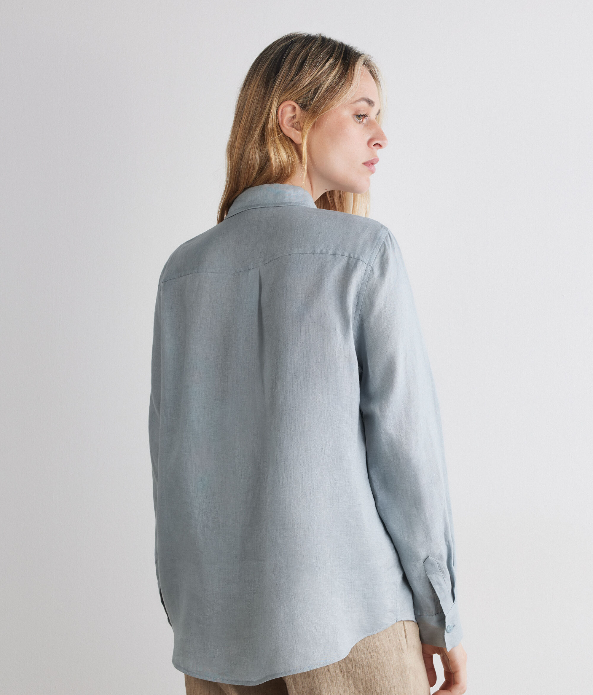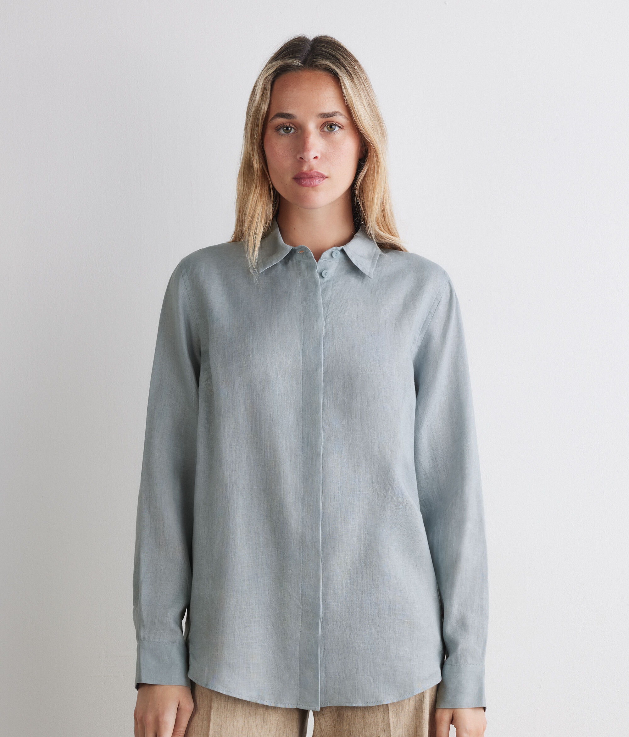 • Vászonból készült • Hosszú ujjak • Rejtett gombolás • Hagyományos vállszabás, hossz és fazon