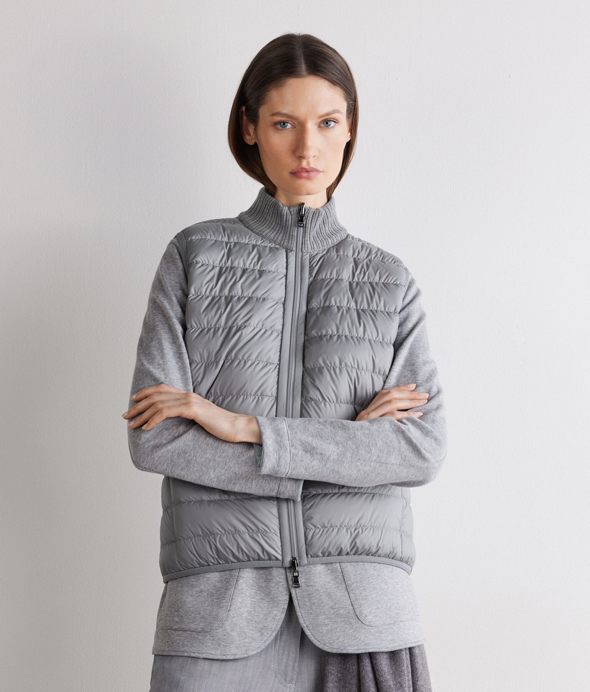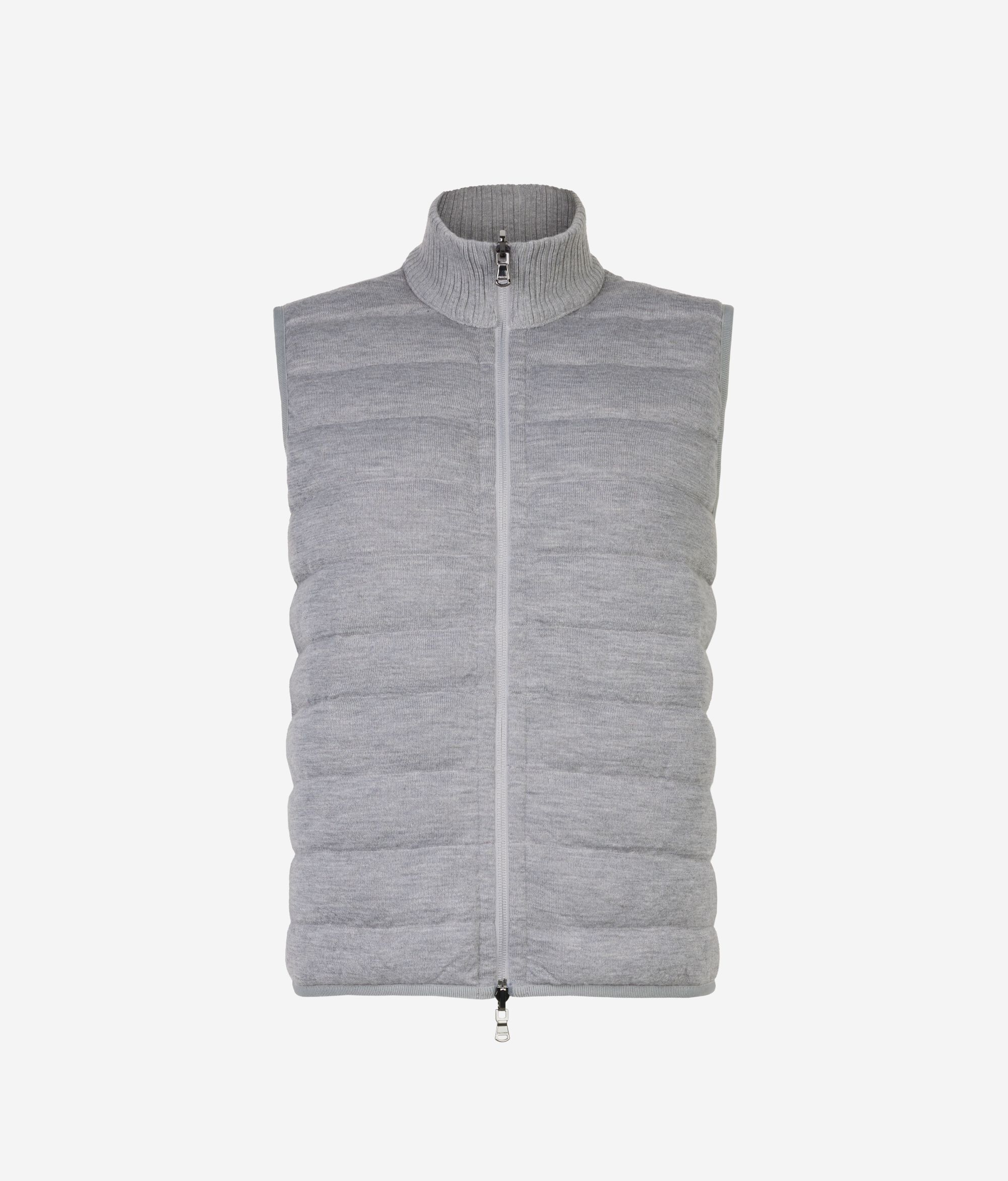 Modern és különleges, ujjatlan és kifordítható mellény, amelynek az egyik oldala matt technikai szövetből, a másik oldala pedig minőségi ultrafine kasmírból készült. Bordázottan kötött, magas nyaka és a kétkocsis cipzáras záródás kifinomultan praktikus viseletté varázsolják. Figyelemre méltó részletek, mint a láthatatlan zsebek és az aprón bordázott, rugalmas szegélyek jellemzik, slim szabása pedig természetes illeszkedést biztosít.