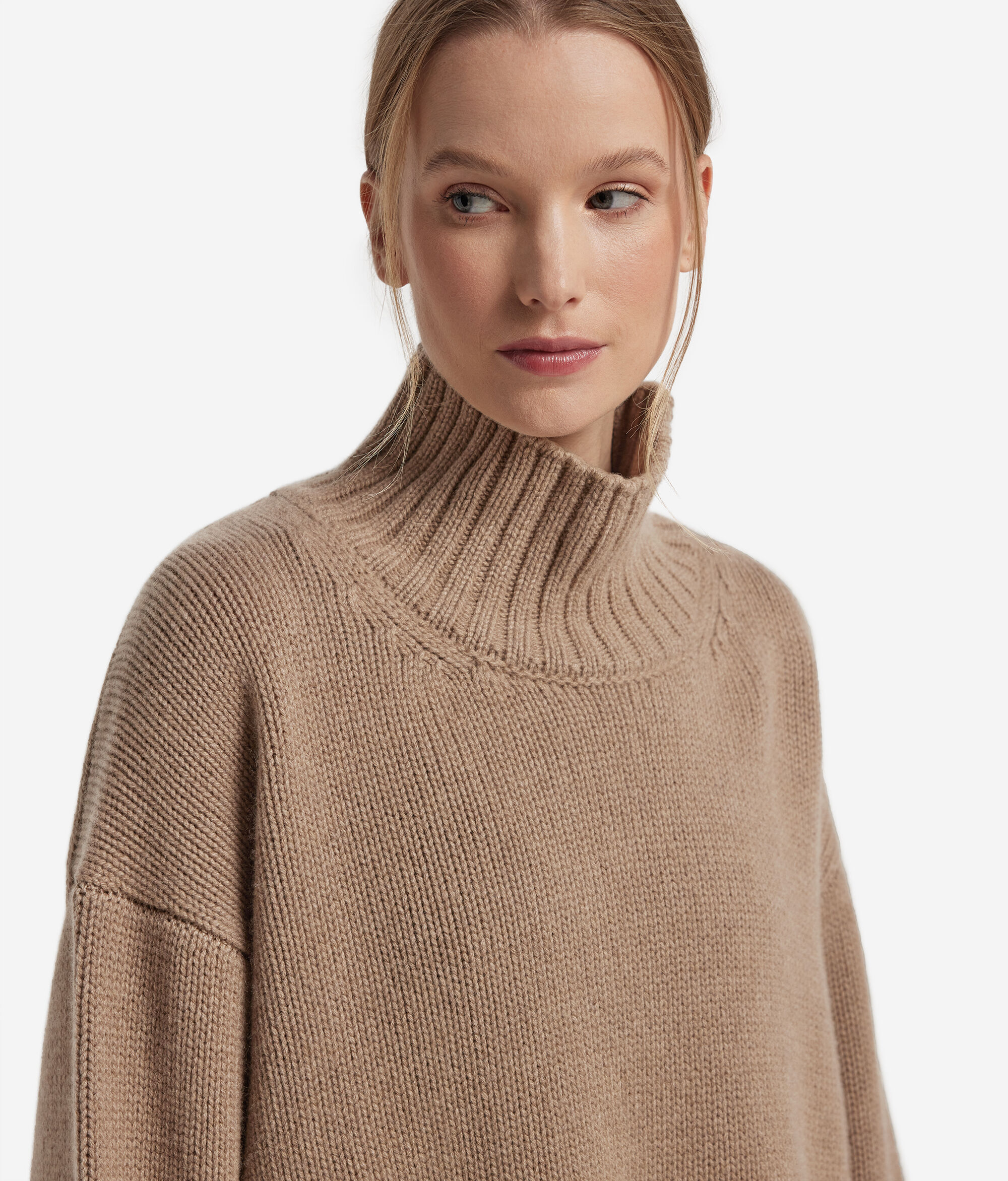 Az Ultrasoft Kasmír Tricot minőségi kivitelezése és modern vonalvezetések ötvöződnek ebben a széles és magas nyakú pulóverben. A klasszikus stílus, a szál természetes puhasága és a laza vonalak egységét a kissé ejtett vállak egészítik ki, amelyek a mindennapok során igazán kényelmessé varázsolják ezt a modellt.