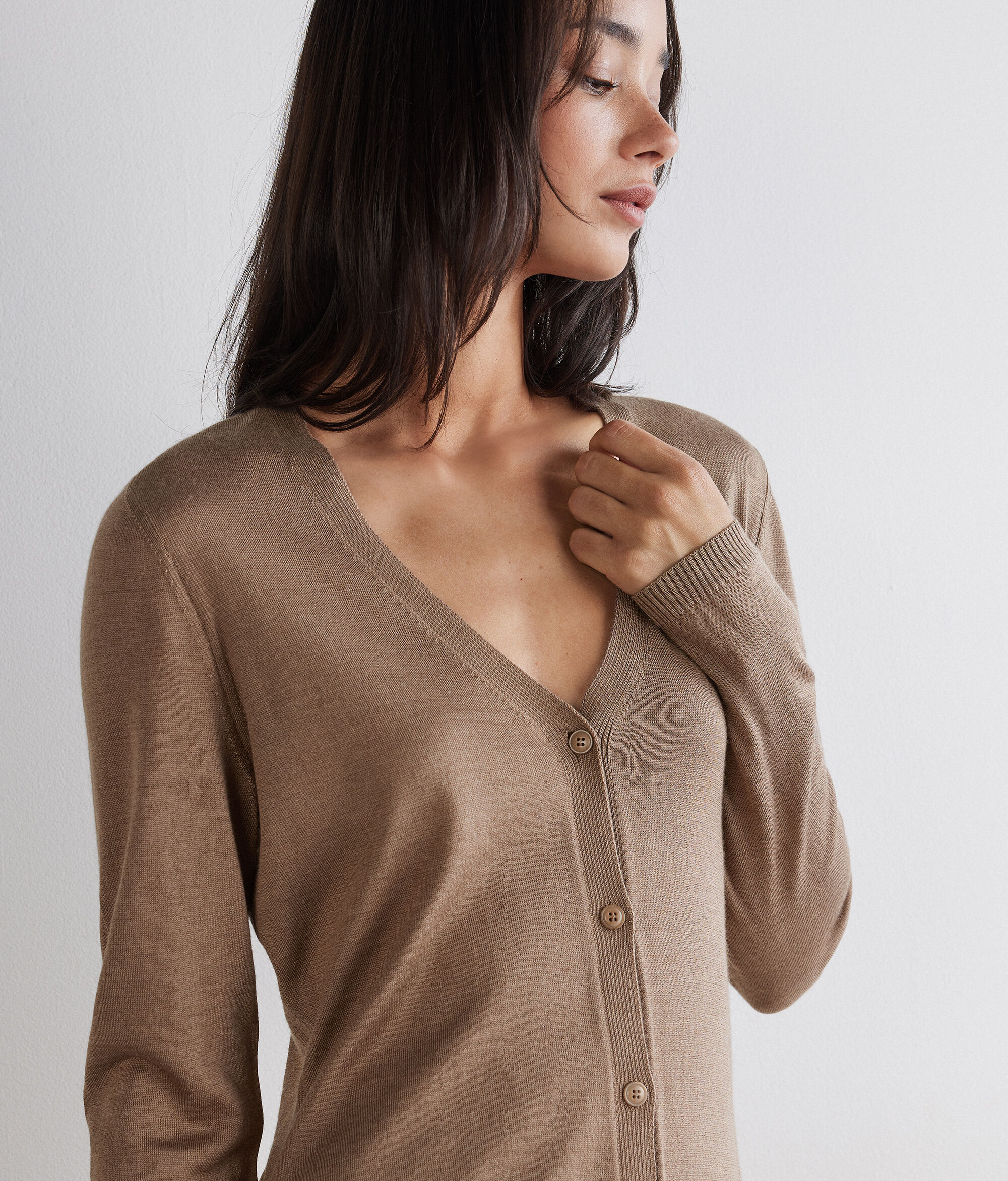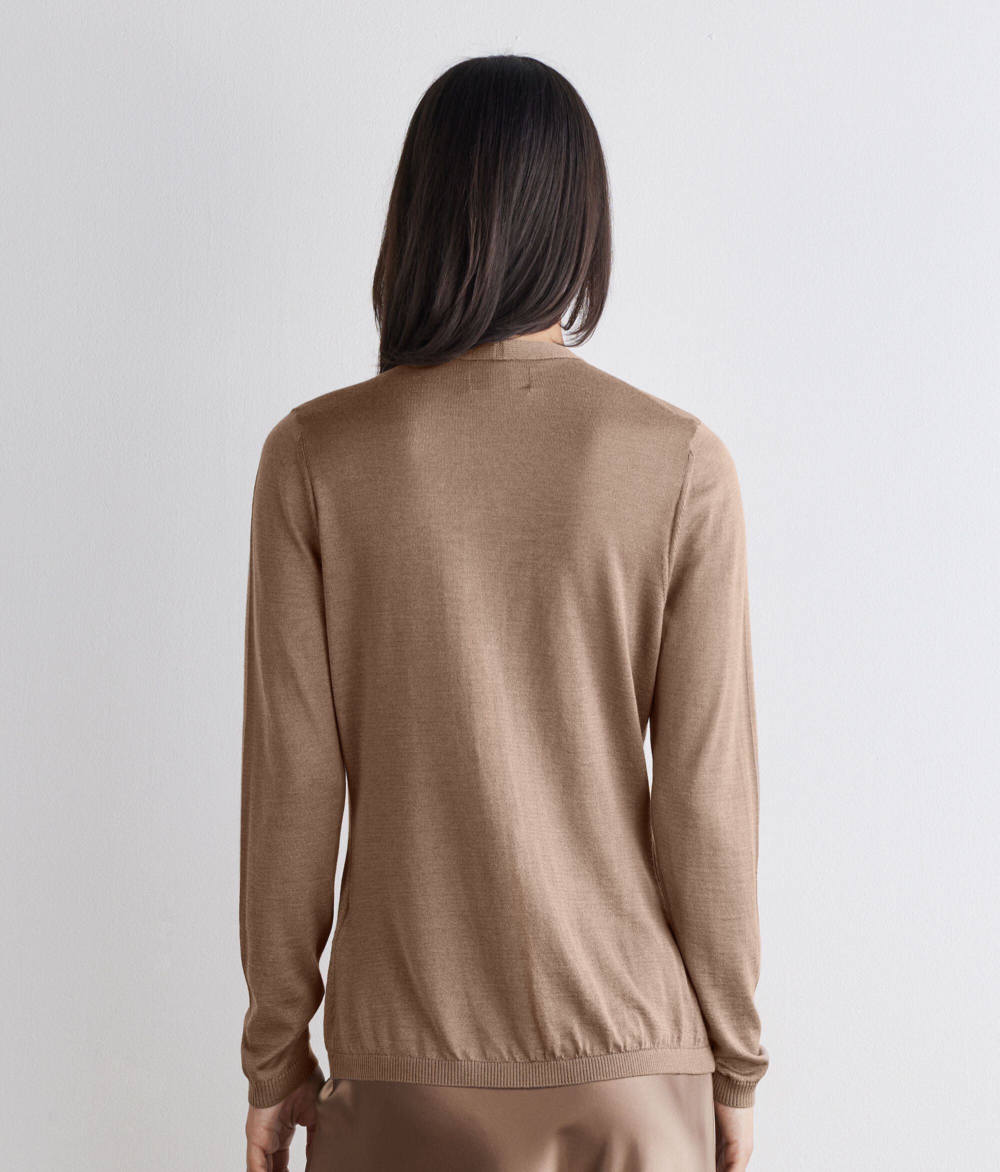 A kasmír puhasága a selyem fényével egyesül ebben az időtlenül elegáns kardigánban. Tökéletes választás a réteges összeállításokhoz, V-nyakkivágással, középső gombos záródással és bordázott szegélyekkel rendelkezik, hagyományos szabása pedig kényelmet és harmonikus illeszkedést garantál.