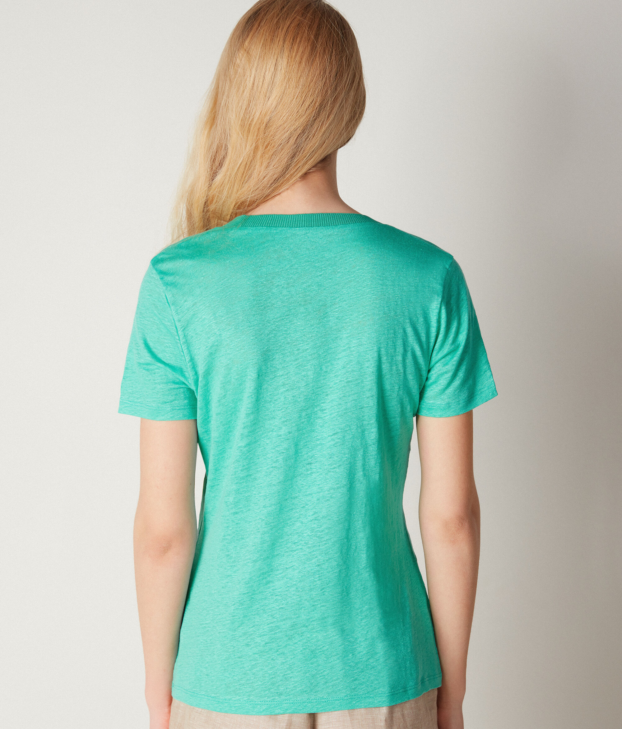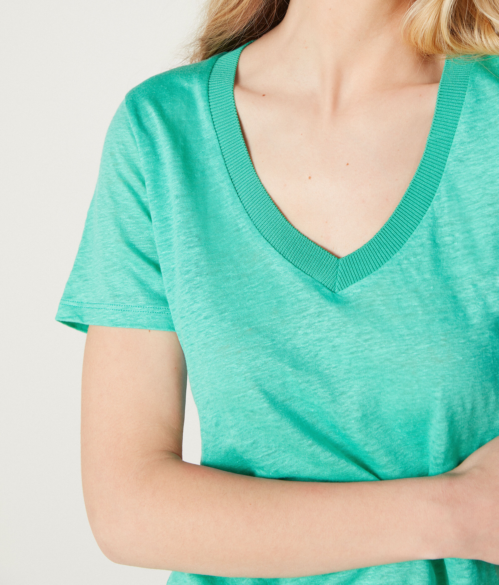 • Vászondzsörzé anyagból készült • Rövid ujjak • V-alakú nyakkivágás bordázottan kötött szegéllyel • Szabályos vállszabás • Hagyományos fazon
