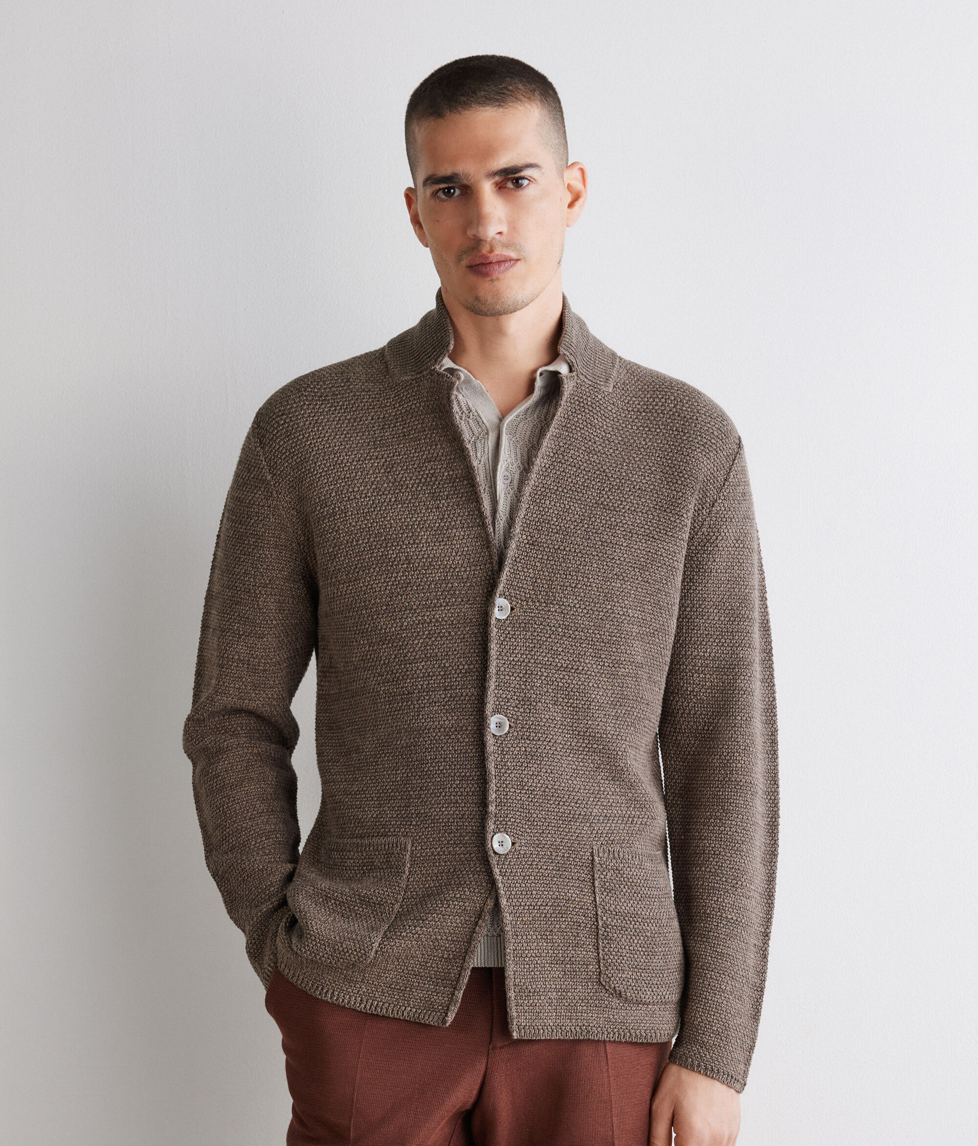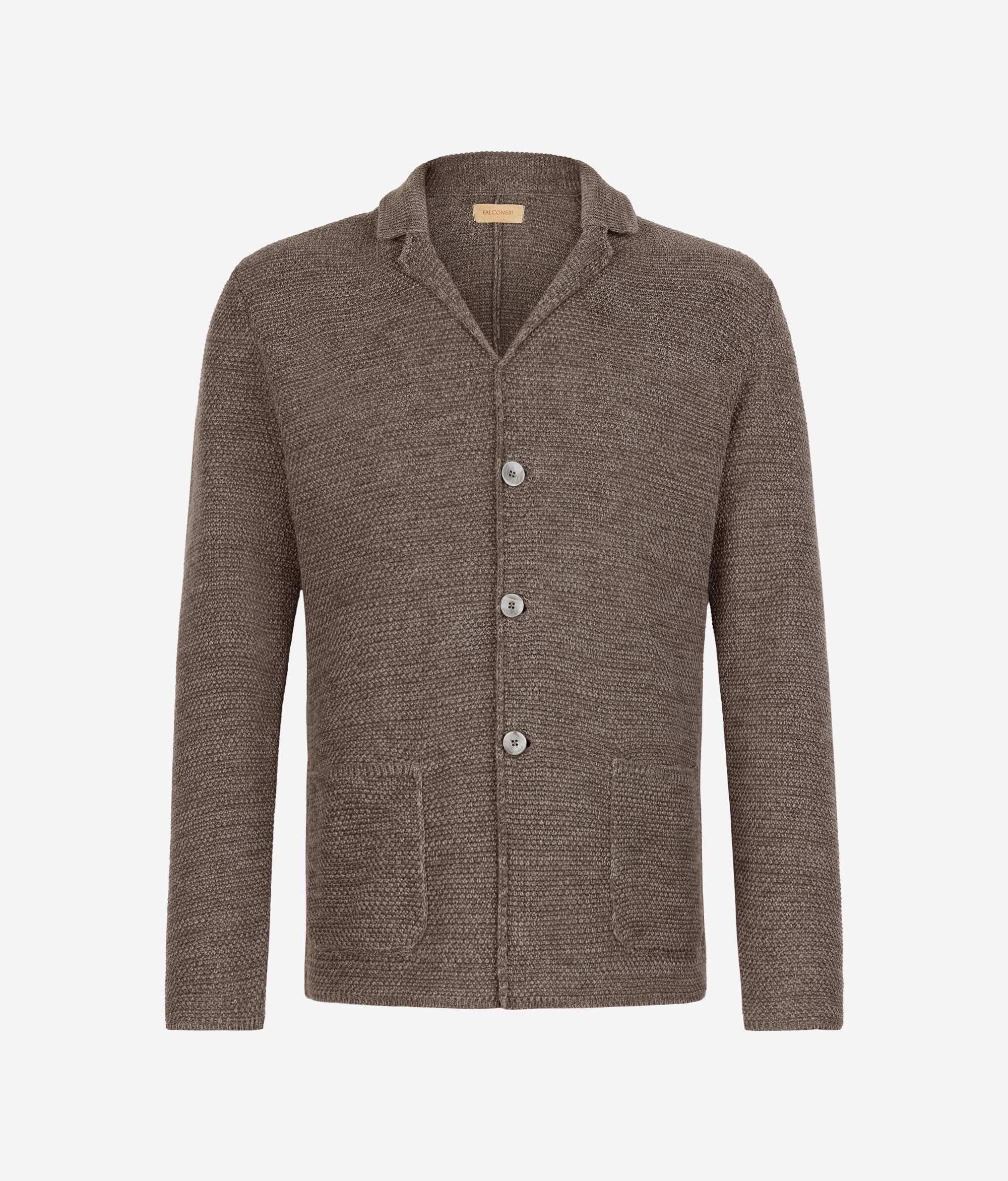 Impreziosita da una raffinata lavorazione a punto nodo questa giacca in maglia di cotone e lino è il perfetto mix di eleganza e stile casual. Il motivo di spalla in avanti crea un effetto visivo dinamico e moderno, conferendo al capo un aspetto distintivo e contemporaneo. La chiusura centrale con tre bottoni e le tasche applicate completano il design aggiungendo un tocco di eleganza funzionale.
