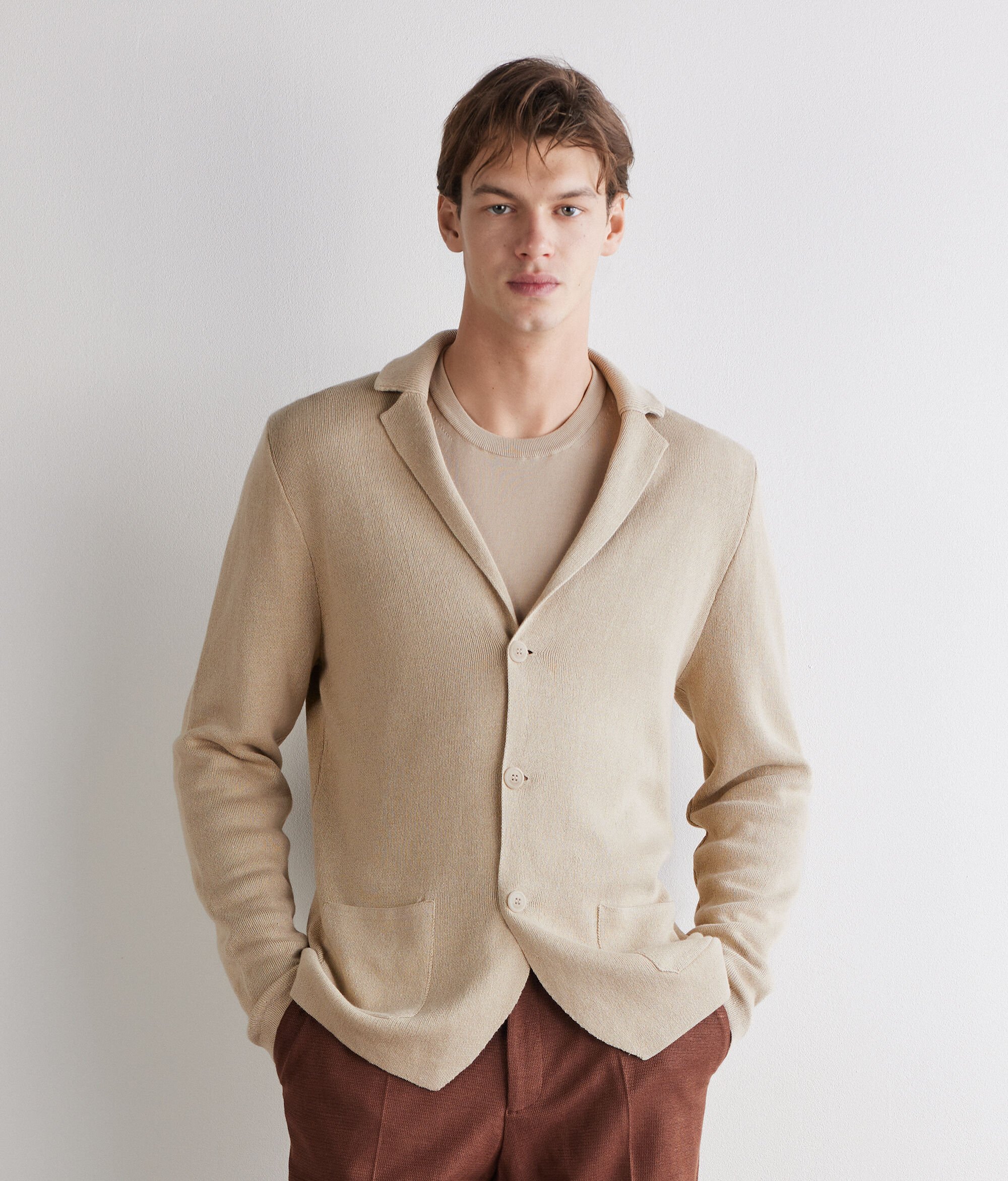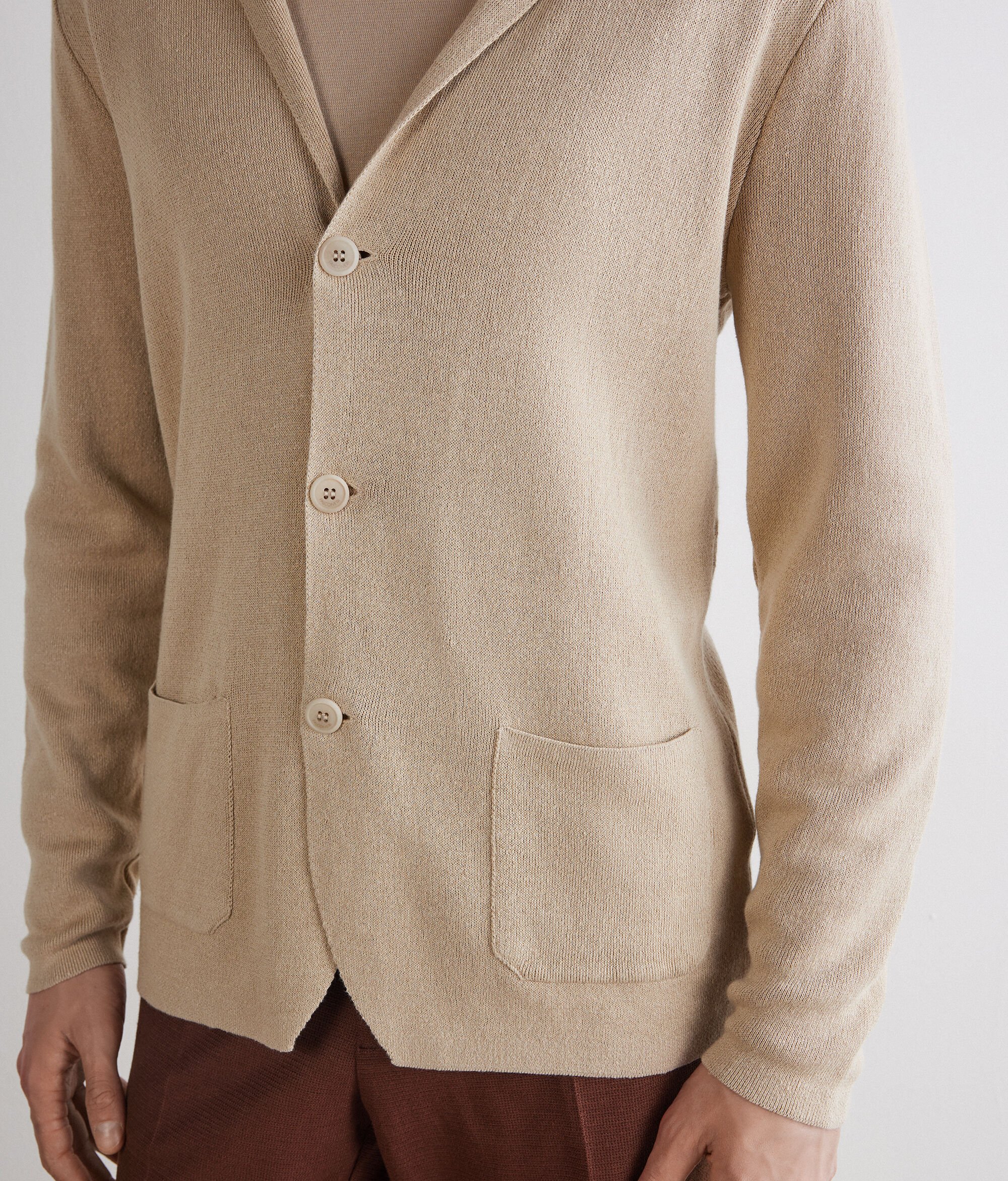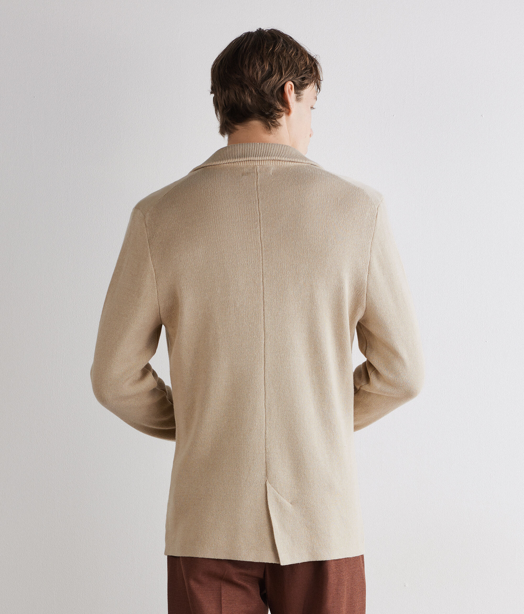 Giacca in maglia di lino e cotone, caratterizzata da una pregiata lavorazione a punto stoffa. Il modello presenta un collo in costa, un rever classico e una chiusura centrale a tre bottoni. Tasche a toppa e spacco centrale dietro completano il design dalla vestibilità regolare, rendendolo ideale per look casual-chic o dallo stile più ricercato.