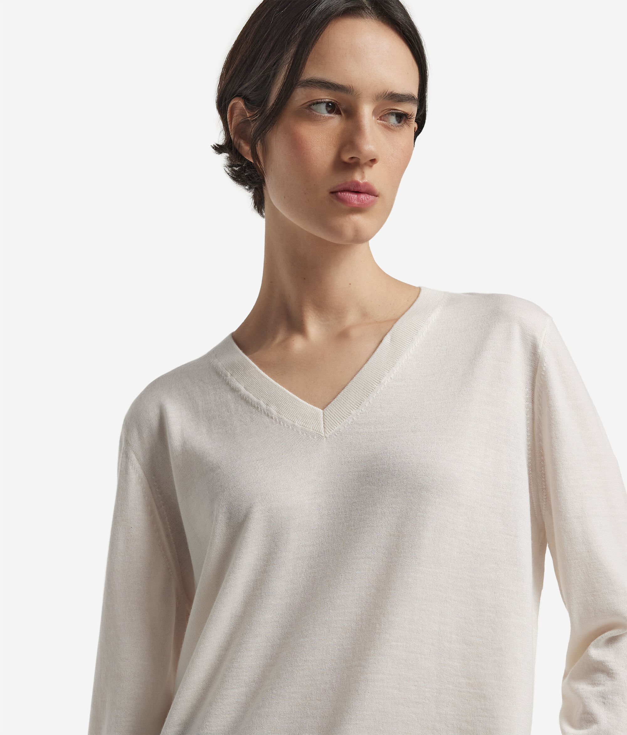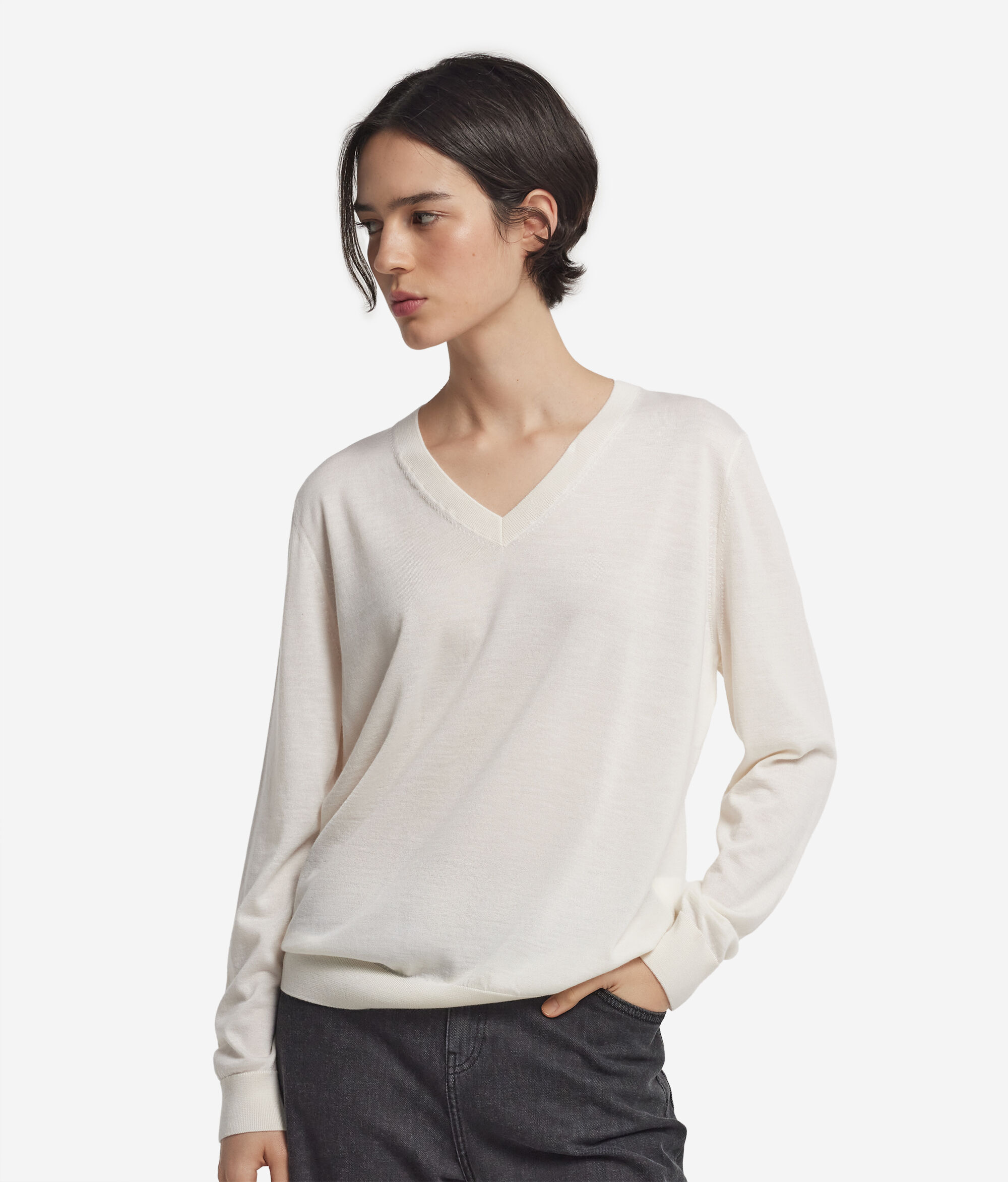 Aggiungi lusso e raffinatezza al tuo guardaroba con questa maglia dallo scollo a V in Cashmere Ultrafine. Ad arricchirne il design, una lavorazione a costine su scollo, polsini e bordo, che dona un tocco di classe allo stile minimal del capo. Grazie alla sua vestibilità morbida, è il mix perfetto tra classico e moderno, che aggiunge ad ogni look un’eleganza discreta e senza tempo.