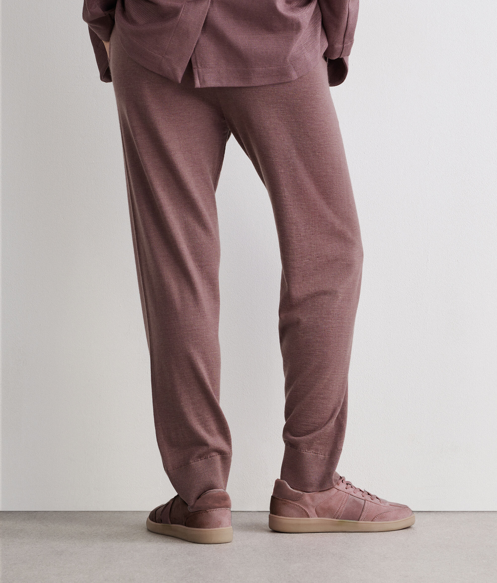 Pantaloni baggy realizzati in Cashmere Ultrafine con cinturino elastico in vita e cavallo leggermente sceso. Il bordo del polsino sul fondo è lavorato a coste. Li completano delle tasche oblique a filetto. La vestibilità è morbida.