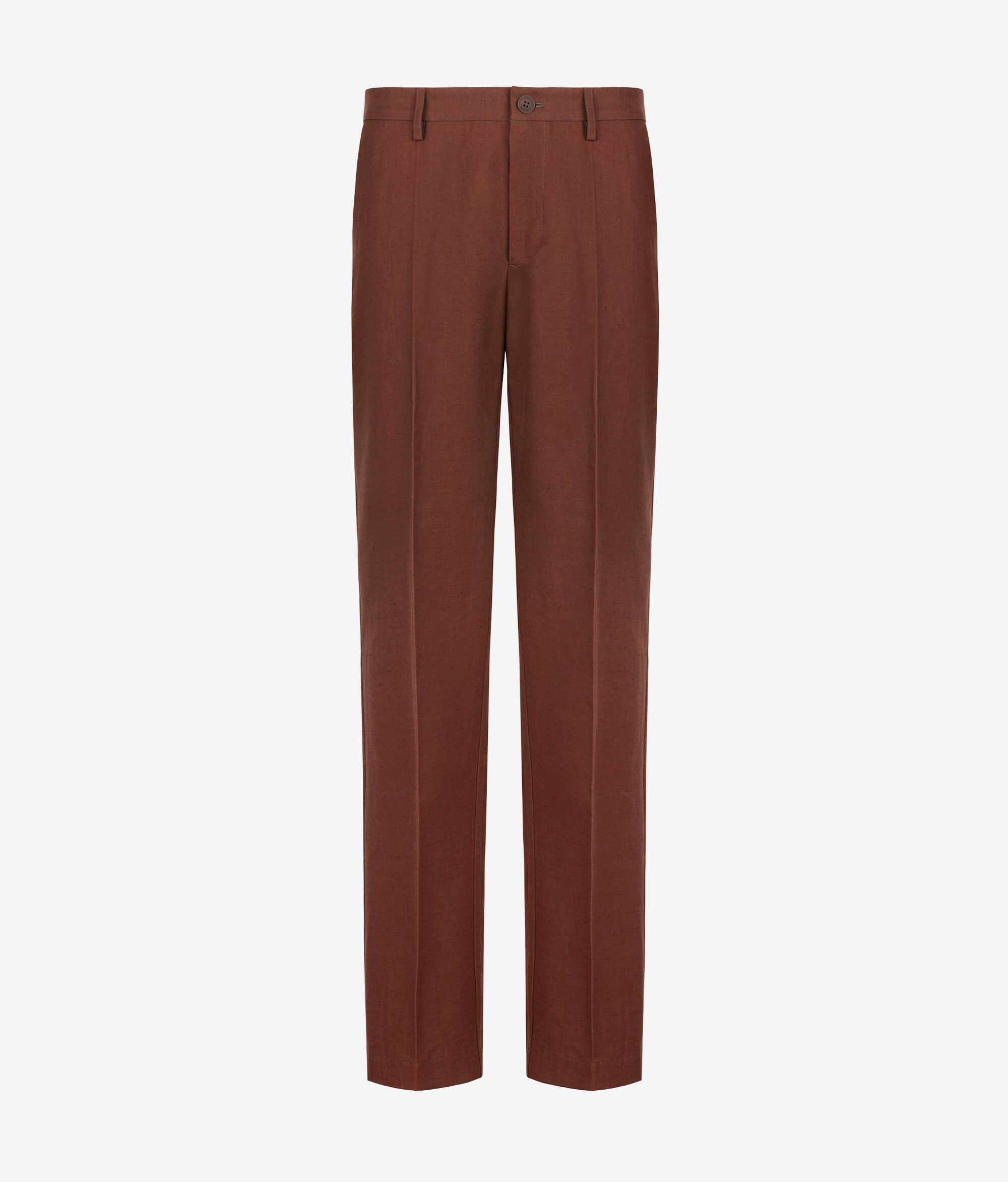 Pantalone in cotone e lino dalla silhouette a gamba larga. Il modello presenta cintura con passanti, chiusura con bottone e zip e piega centrale stirata per un tocco sartoriale.