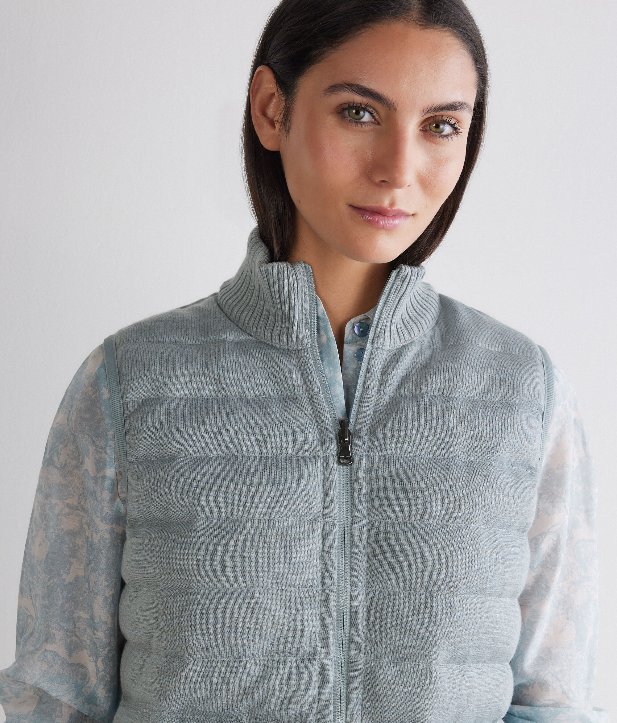 Piumino smanicato reversibile, dal carattere ricercato e contemporaneo, careatterizzato da un lato tecnico opaco e l’altro in pregiato Cashmere Ultrafine. Collo alto in maglia a costine e zip a doppio cursore uniscono funzionalità e raffinatezza, mentre tasche invisibili e bordi elastici a costine completano il capo, valorizzato da una vestibilità slim che segue naturalmente la silhouette.
