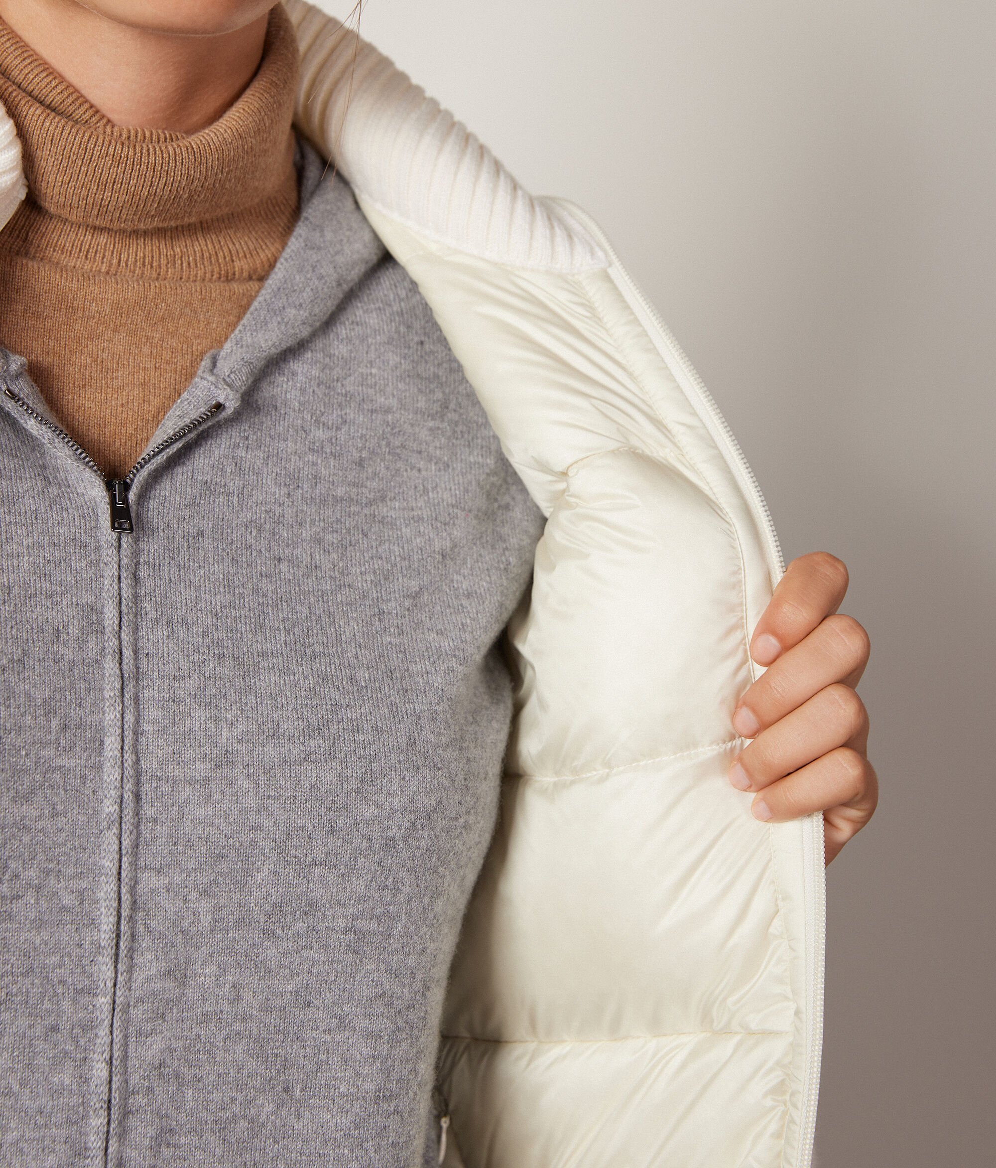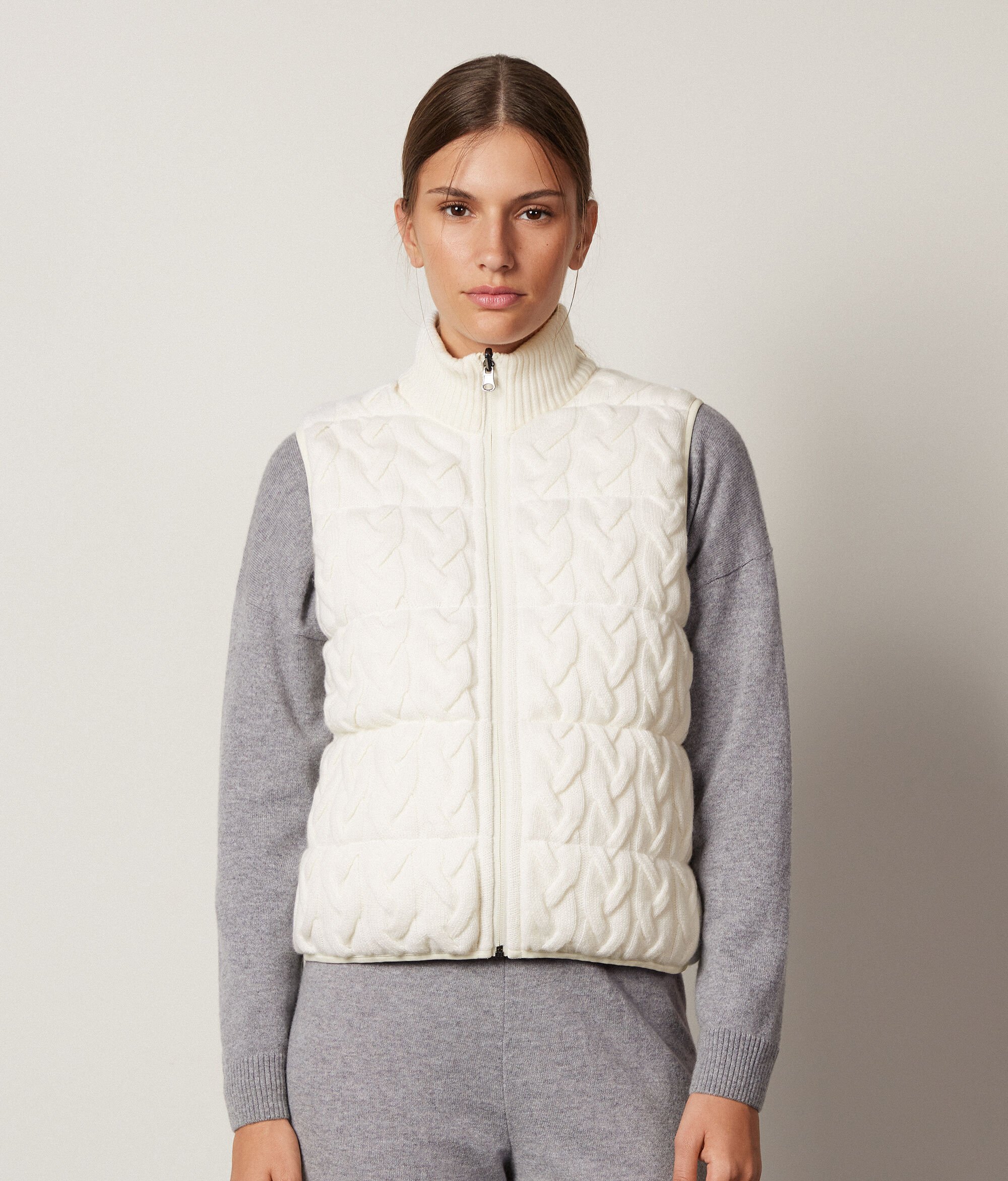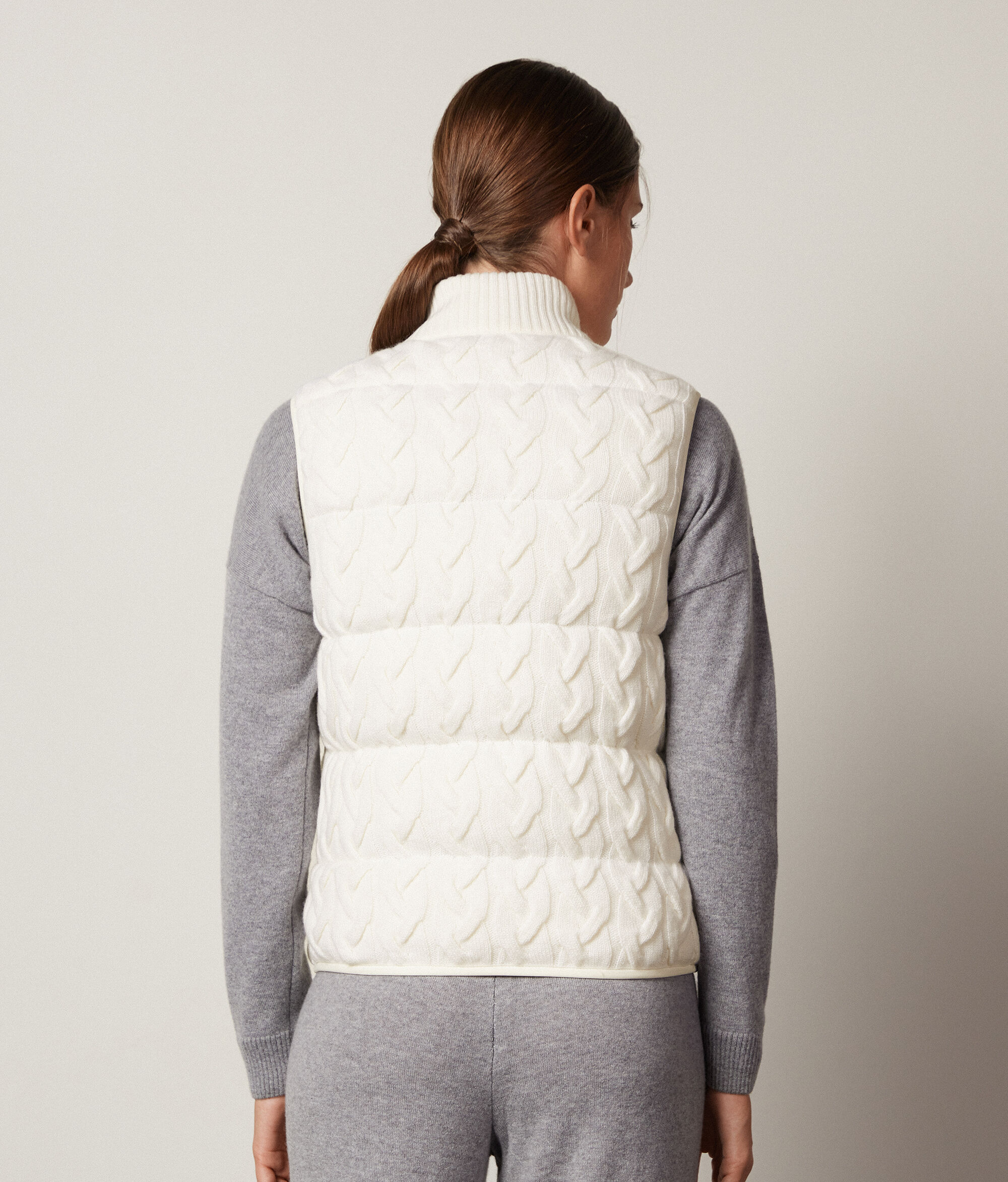 Il piumino smanicato con motivo trecce è la nuova proposta della Collezione Donna Autunno-Inverno firmata Falconeri. Il dettaglio del collo alto in cashmere ultrasoft arricchisce lo stile casual di questo capo per un connubio perfetto tra funzionalità ed eleganza. Grazie alla sua caratteristica double-face, potrai sempre scegliere che stile indossare. Ideale per la stagione di passaggio, aggiungerà un tocco di classe ai tuoi outfit!